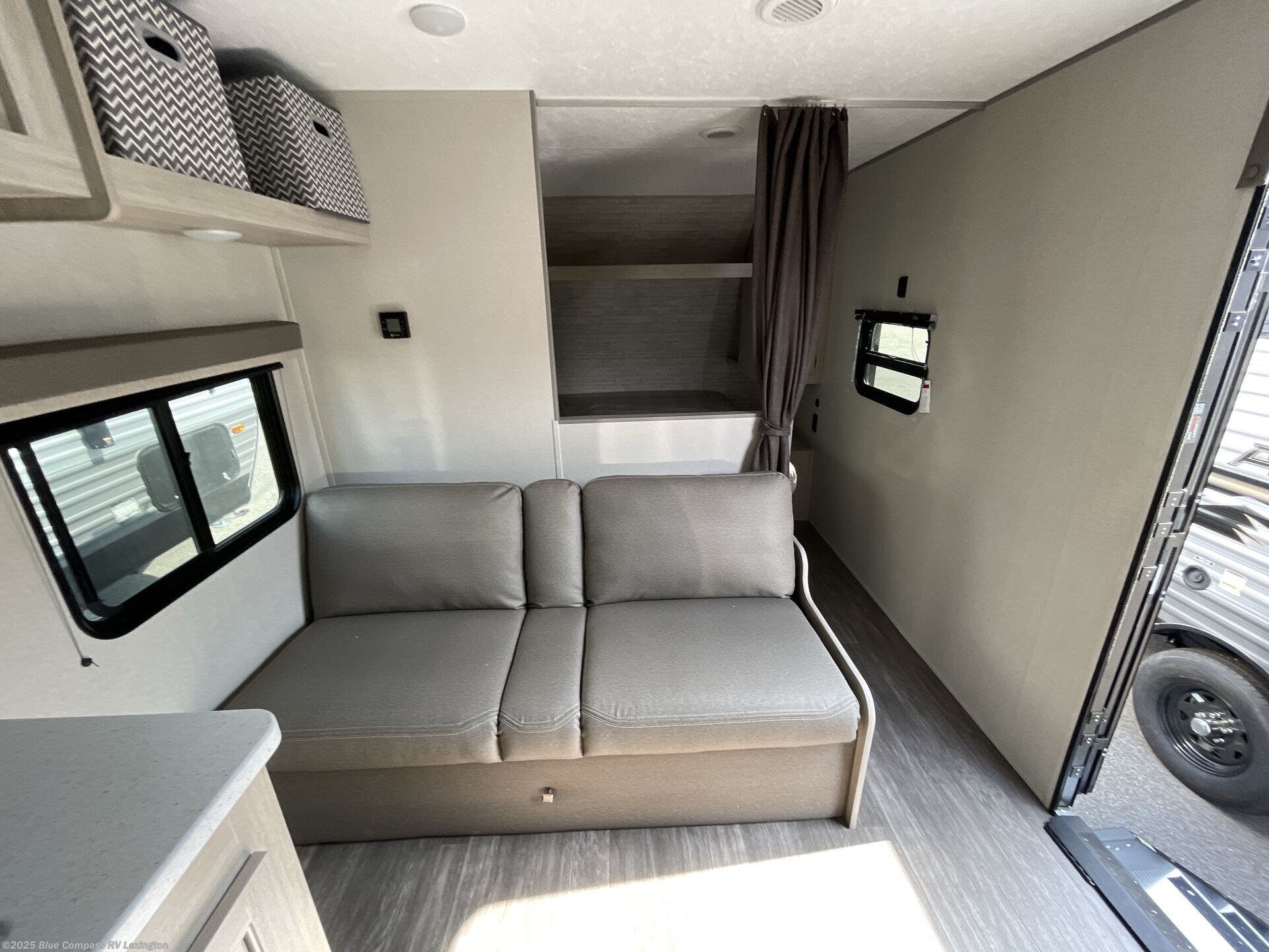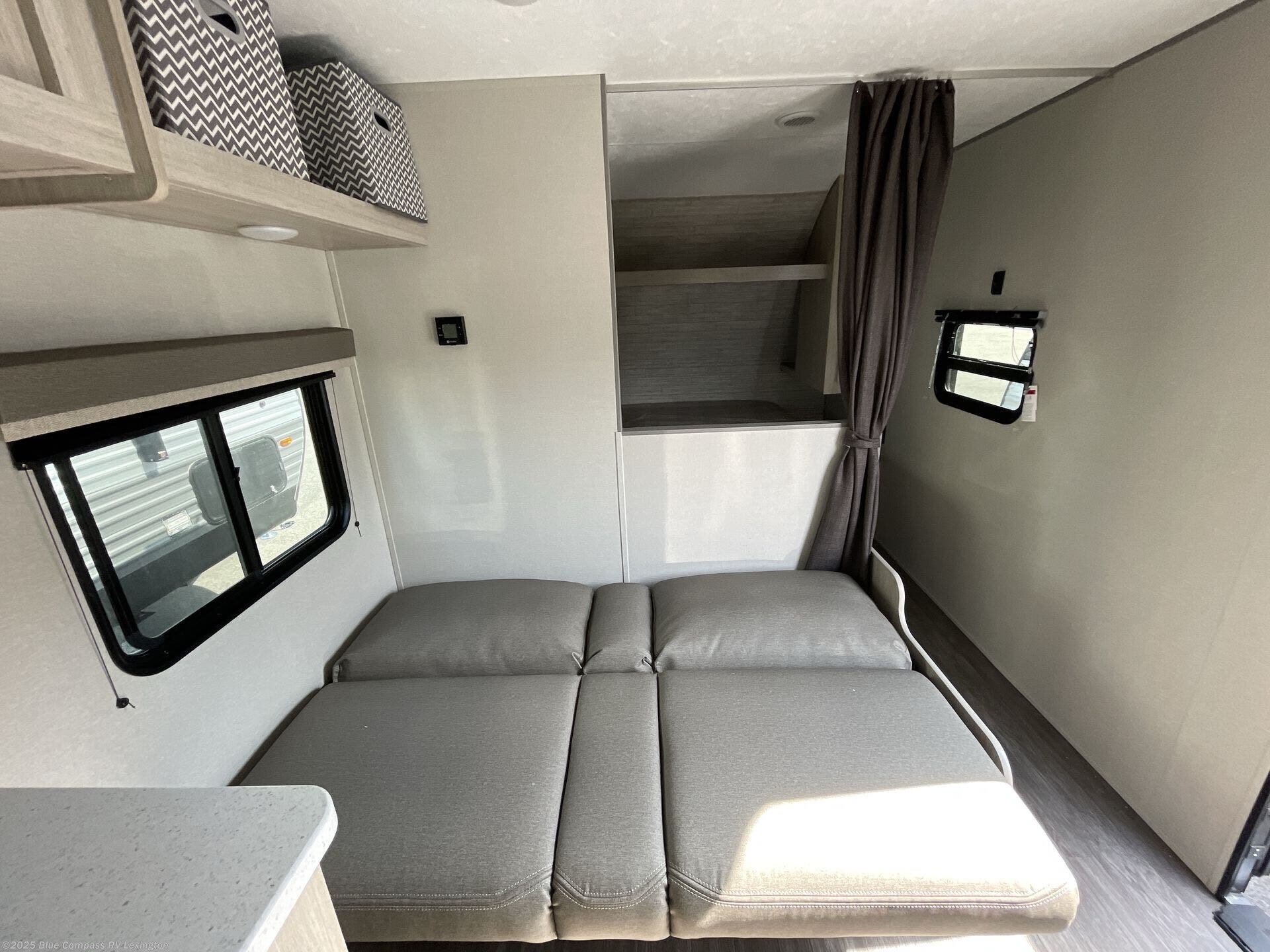 Pack your bags and head out on a fun weekend camping trip with this travel trailer! Whether you have a small family or a few guests wanting to come along, there will be enough sleeping spaces between the double-size bunk beds, the 60" x 74" queen bed in the front semi-private bedroom, and even the booth dinette. The chef can prepare meals indoors using the three burner cooktop or microwave oven, and there is a 12V 10.7 cu. ft. refrigerator for perishables. There is plenty of storage throughout with the overhead cabinets and wardrobes, as well as outside with the front pass-through storage area!