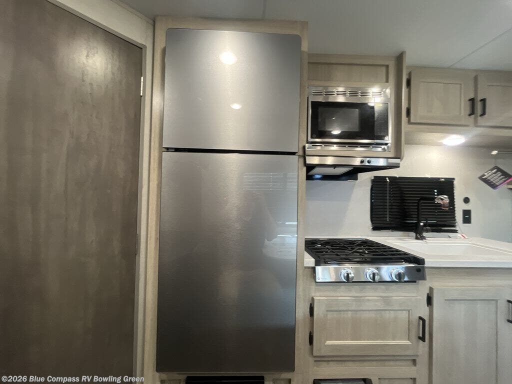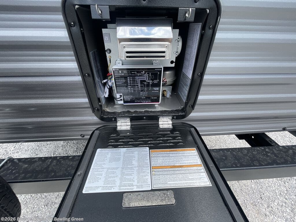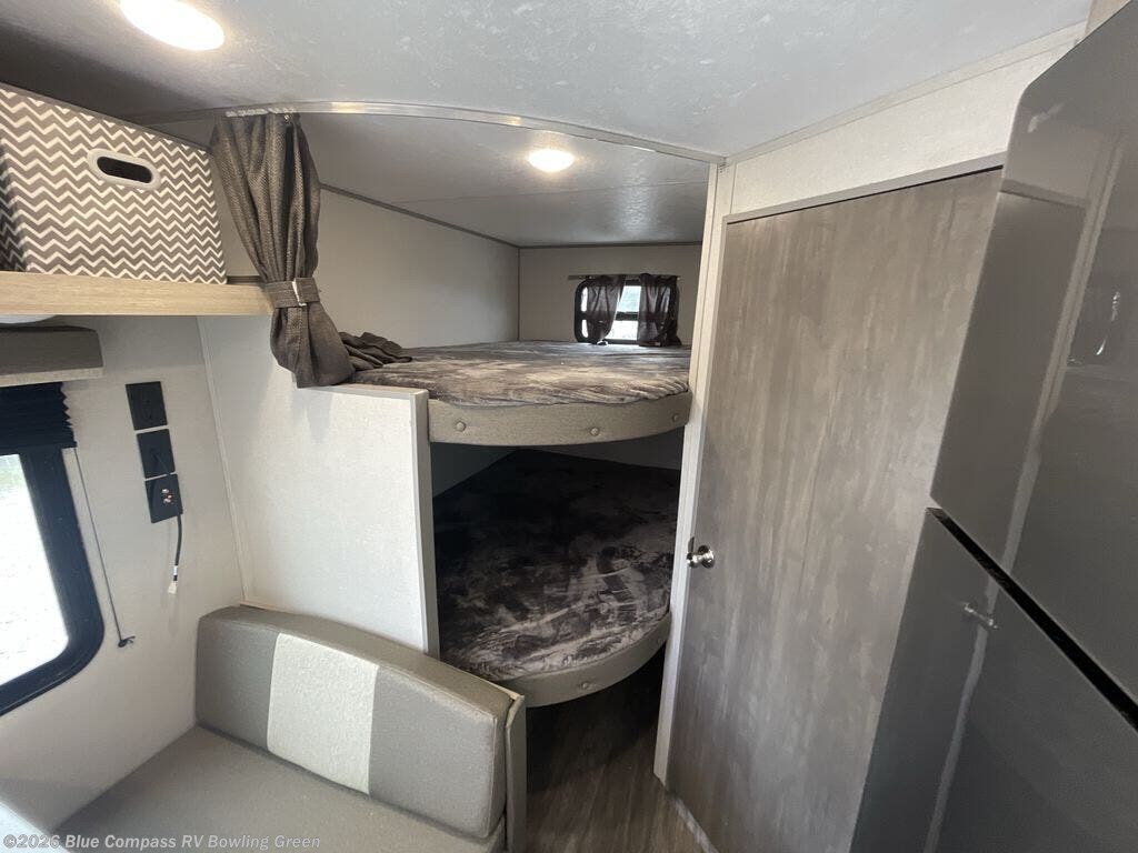 Pack your bags and head out on a fun weekend camping trip with this travel trailer! Whether you have a small family or a few guests wanting to come along, there will be enough sleeping spaces between the double-size bunk beds, the 60" x 74" queen bed in the front semi-private bedroom, and even the booth dinette. The chef can prepare meals indoors using the three burner cooktop or microwave oven, and there is a 12V 10.7 cu. ft. refrigerator for perishables. There is plenty of storage throughout with the overhead cabinets and wardrobes, as well as outside with the front pass-through storage area!