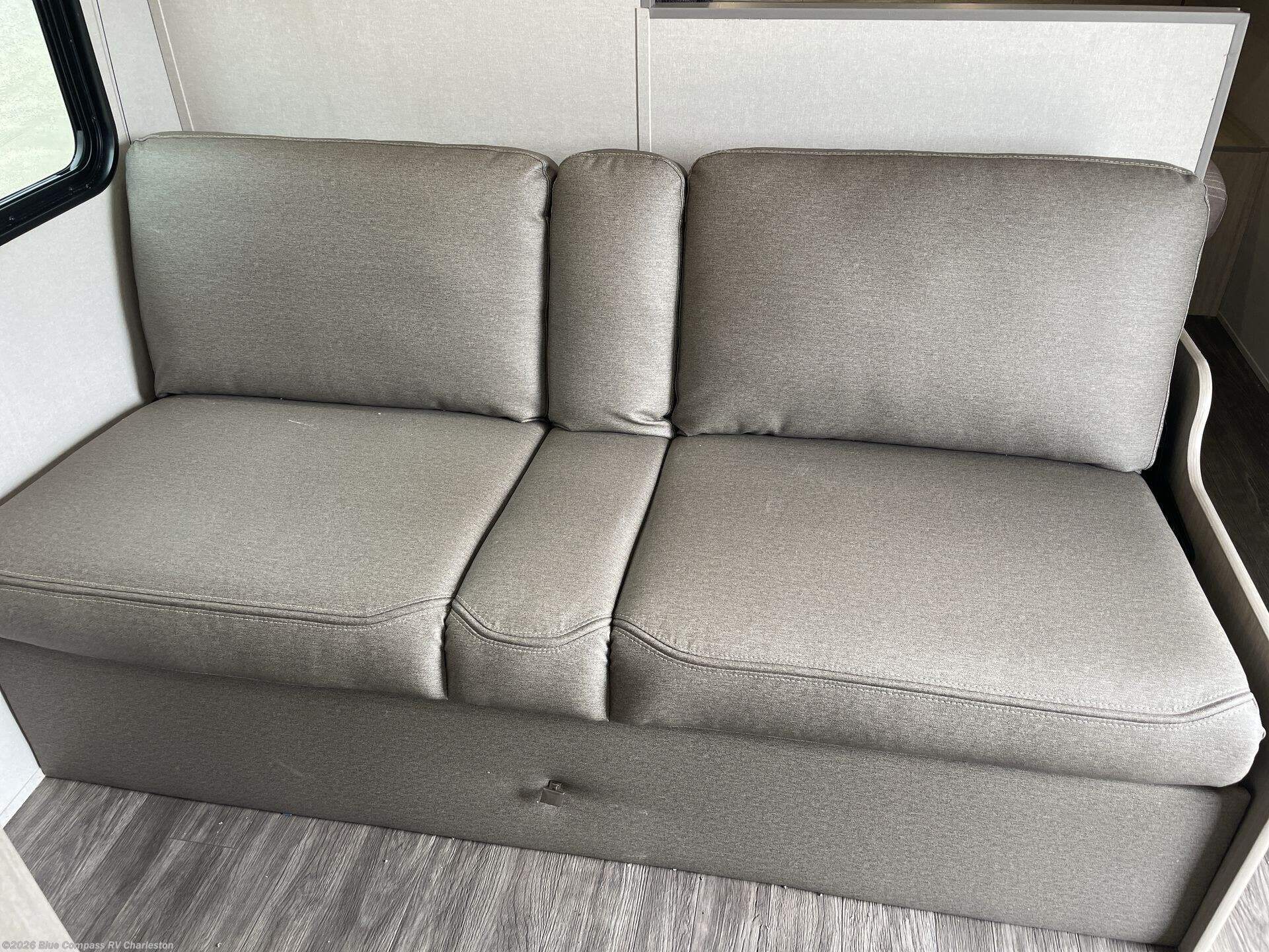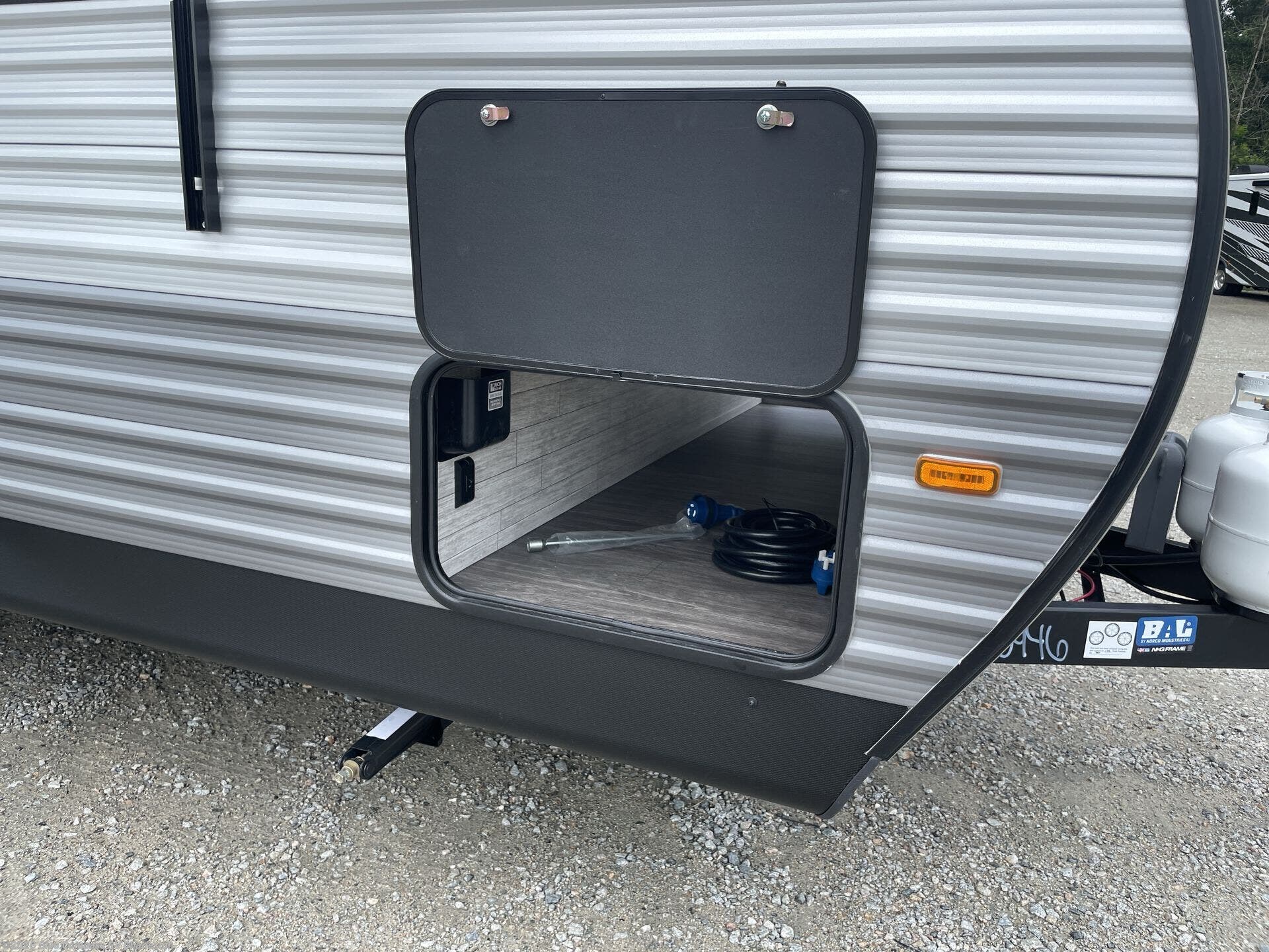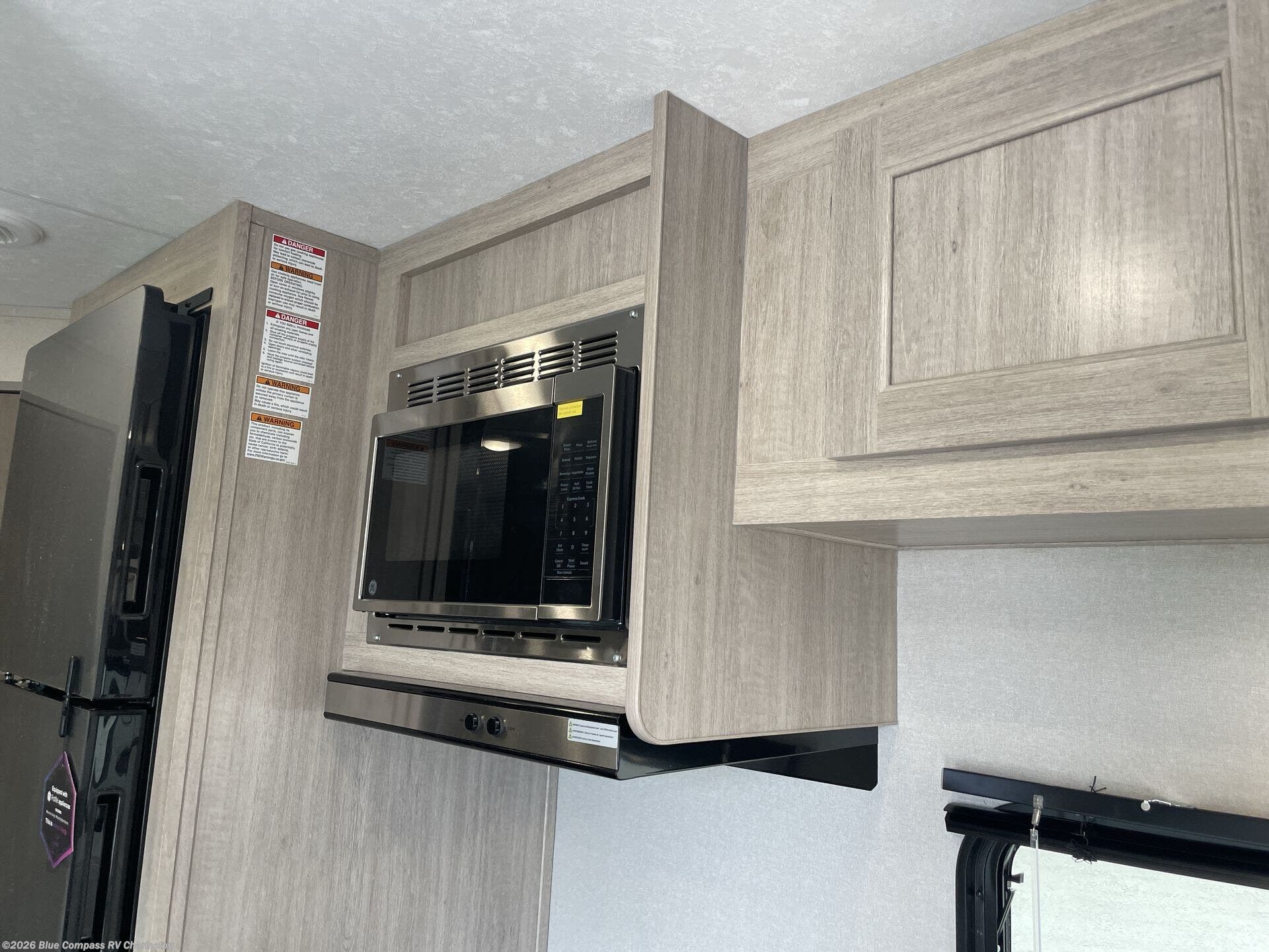Pack your bags and head out on a fun weekend camping trip with this travel trailer! Whether you have a small family or a few guests wanting to come along, there will be enough sleeping spaces between the double-size bunk beds, the 60" x 74" queen bed in the front semi-private bedroom, and even the booth dinette. The chef can prepare meals indoors using the three burner cooktop or microwave oven, and there is a 12V 10.7 cu. ft. refrigerator for perishables. There is plenty of storage throughout with the overhead cabinets and wardrobes, as well as outside with the front pass-through storage area!