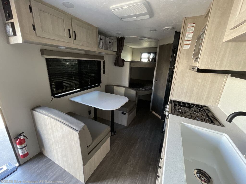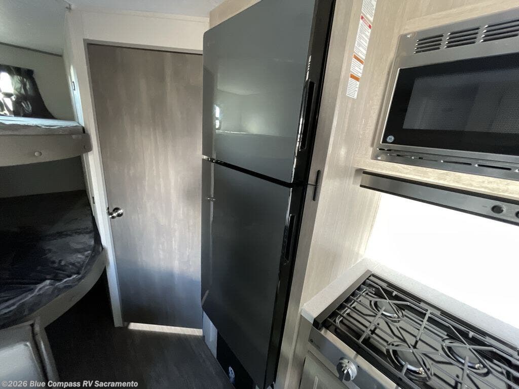 Pack your bags and head out on a fun weekend camping trip with this travel trailer! Whether you have a small family or a few guests wanting to come along, there will be enough sleeping spaces between the double-size bunk beds, the 60" x 74" queen bed in the front semi-private bedroom, and even the booth dinette. The chef can prepare meals indoors using the three burner cooktop or microwave oven, and there is a 12V 10.7 cu. ft. refrigerator for perishables. There is plenty of storage throughout with the overhead cabinets and wardrobes, as well as outside with the front pass-through storage area!