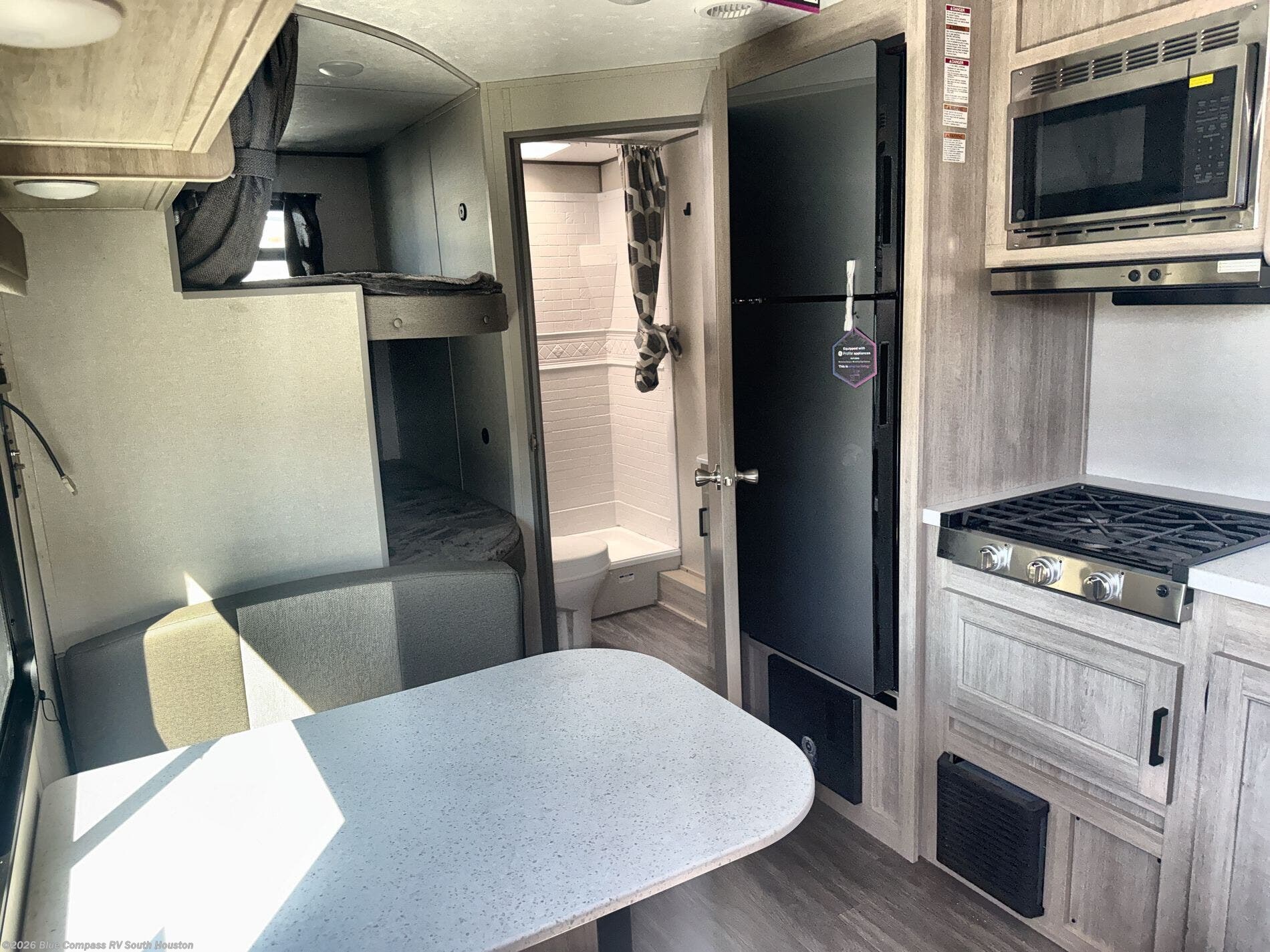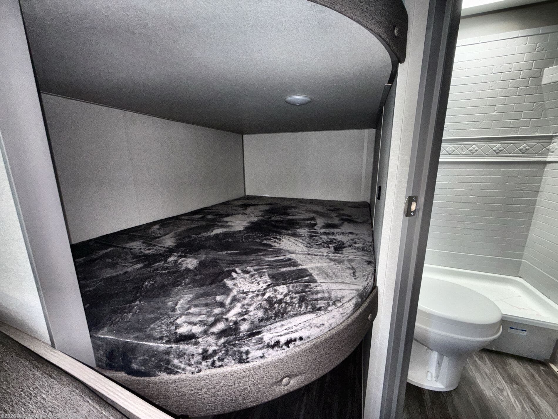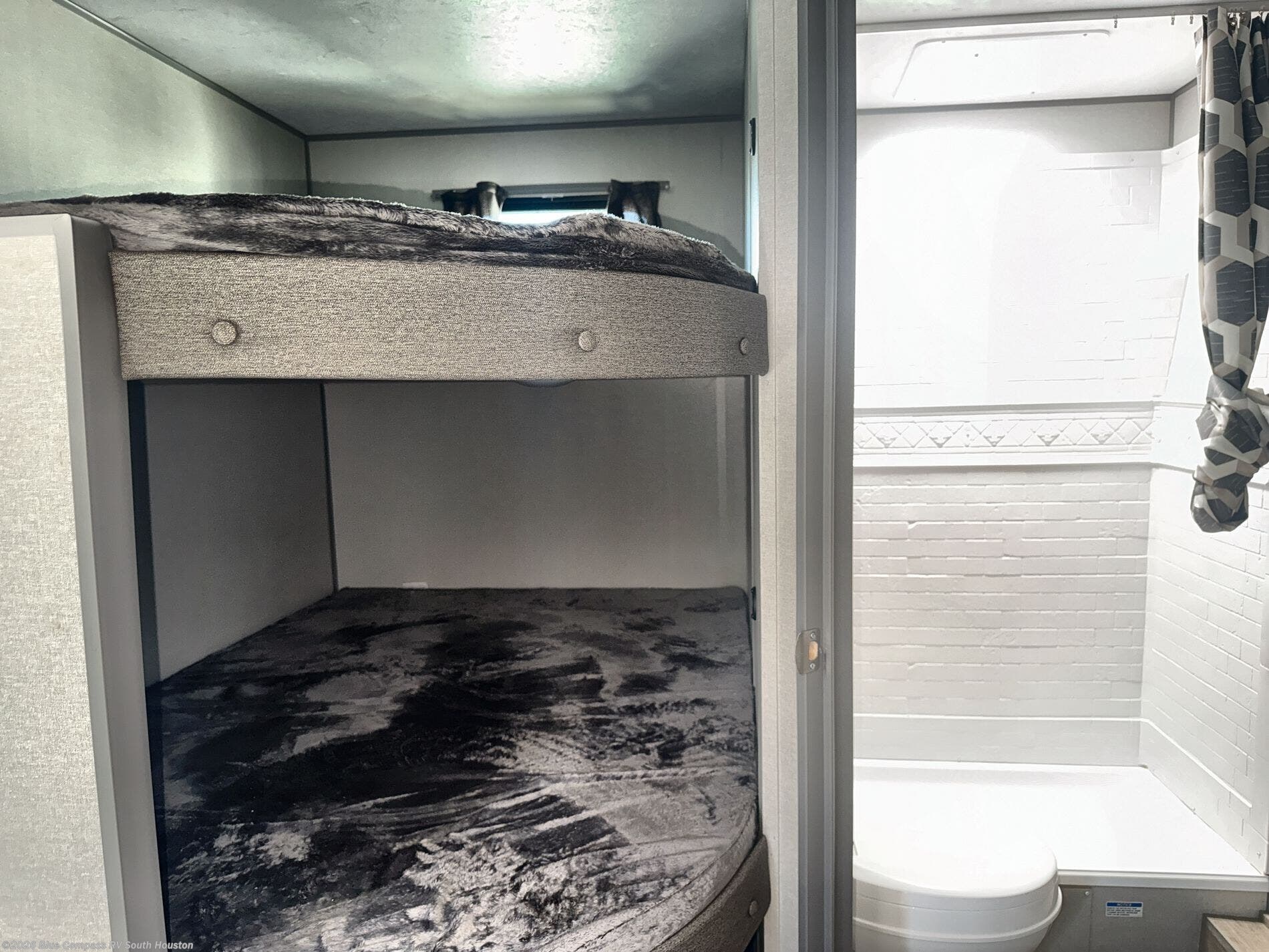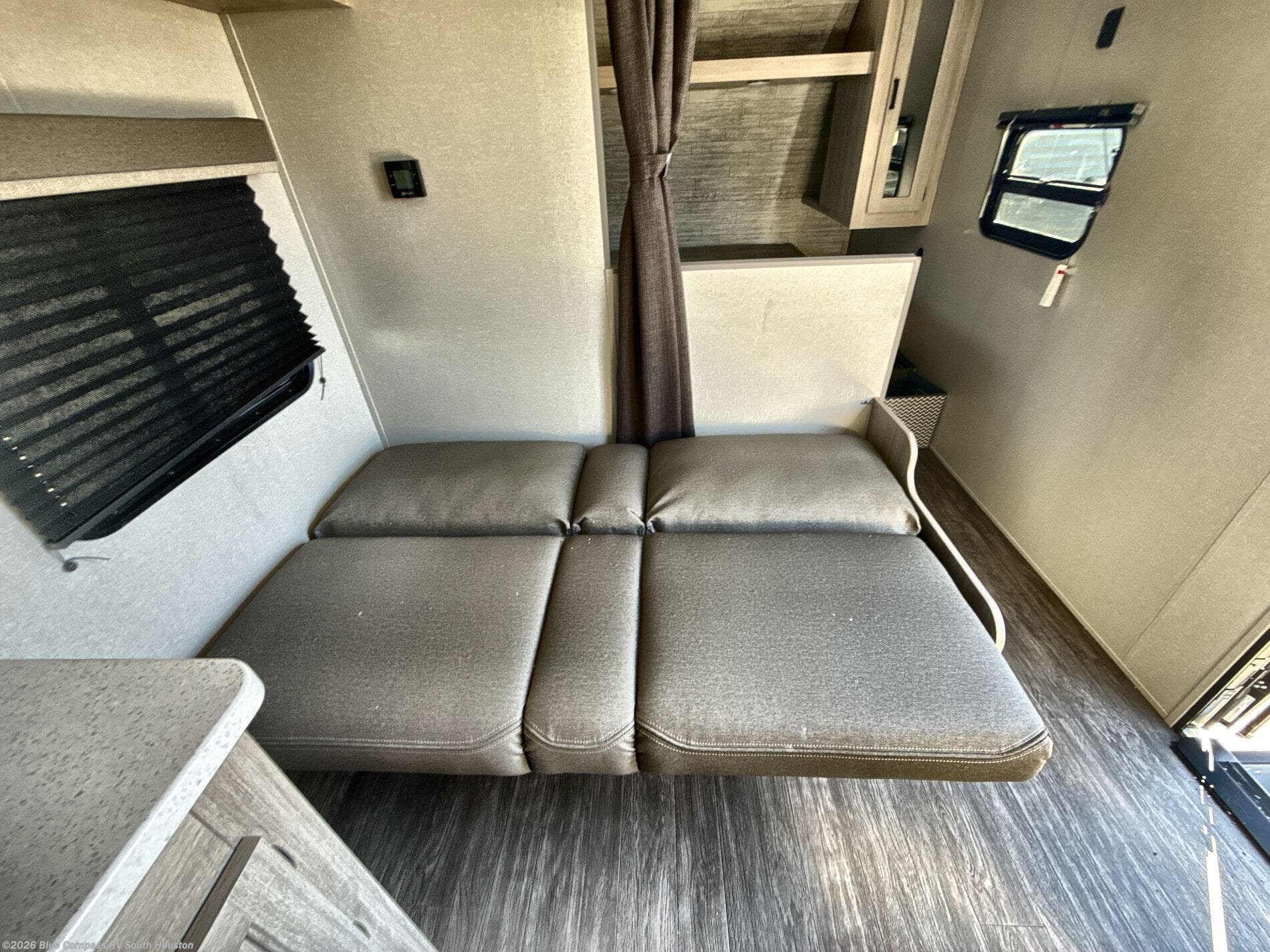 Pack your bags and head out on a fun weekend camping trip with this travel trailer! Whether you have a small family or a few guests wanting to come along, there will be enough sleeping spaces between the double-size bunk beds, the 60" x 74" queen bed in the front semi-private bedroom, and even the booth dinette. The chef can prepare meals indoors using the three burner cooktop or microwave oven, and there is a 12V 10.7 cu. ft. refrigerator for perishables. There is plenty of storage throughout with the overhead cabinets and wardrobes, as well as outside with the front pass-through storage area!