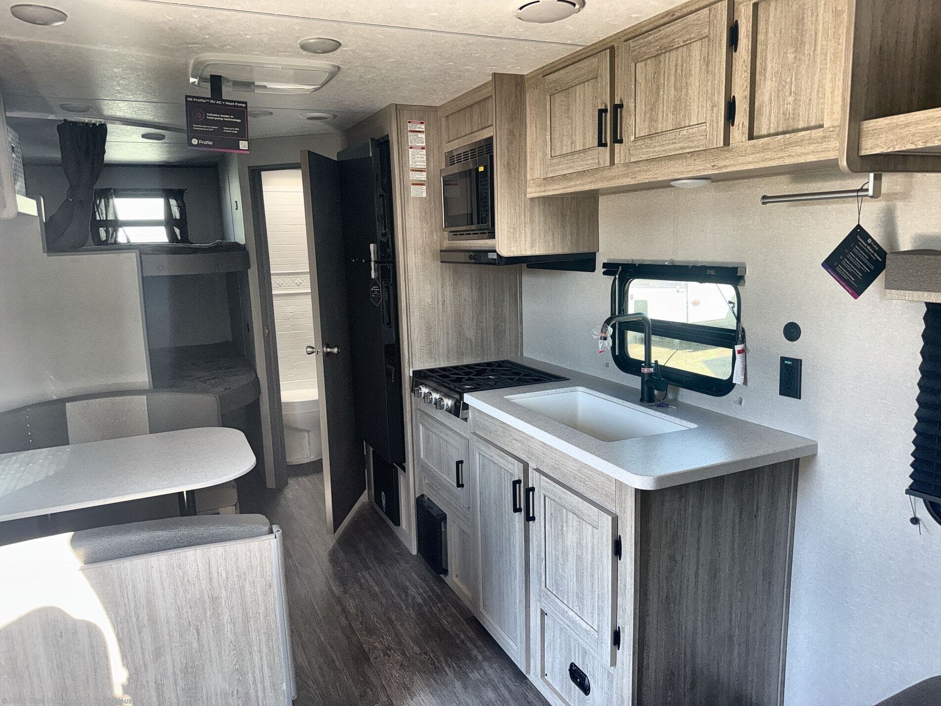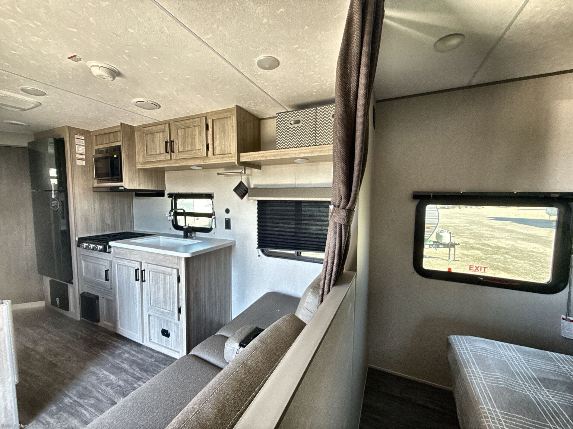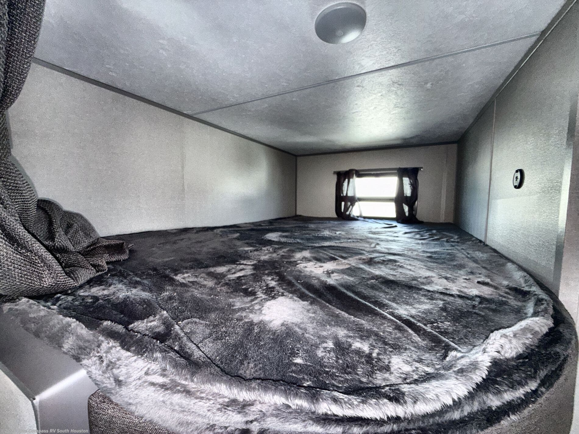 Pack your bags and head out on a fun weekend camping trip with this travel trailer! Whether you have a small family or a few guests wanting to come along, there will be enough sleeping spaces between the double-size bunk beds, the 60" x 74" queen bed in the front semi-private bedroom, and even the booth dinette. The chef can prepare meals indoors using the three burner cooktop or microwave oven, and there is a 12V 10.7 cu. ft. refrigerator for perishables. There is plenty of storage throughout with the overhead cabinets and wardrobes, as well as outside with the front pass-through storage area!