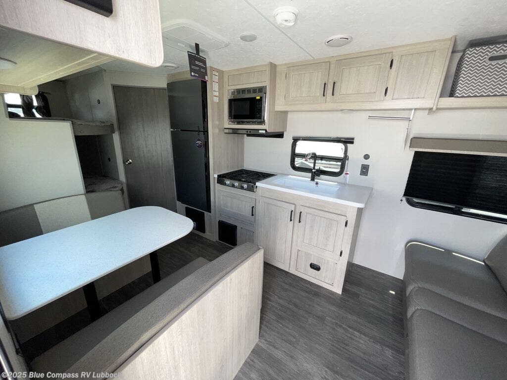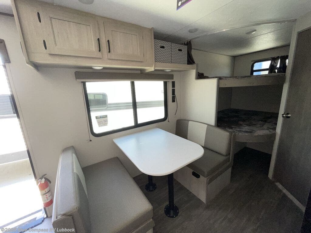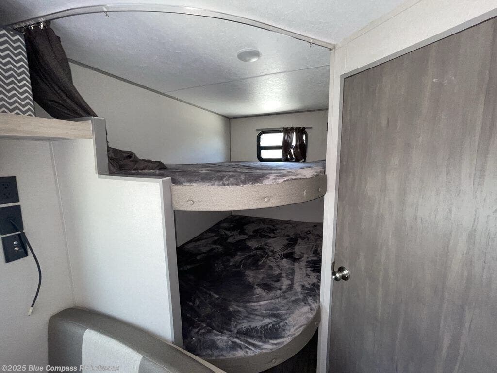 Pack your bags and head out on a fun weekend camping trip with this travel trailer! Whether you have a small family or a few guests wanting to come along, there will be enough sleeping spaces between the double-size bunk beds, the 60" x 74" queen bed in the front semi-private bedroom, and even the booth dinette. The chef can prepare meals indoors using the three burner cooktop or microwave oven, and there is a 12V 10.7 cu. ft. refrigerator for perishables. There is plenty of storage throughout with the overhead cabinets and wardrobes, as well as outside with the front pass-through storage area!