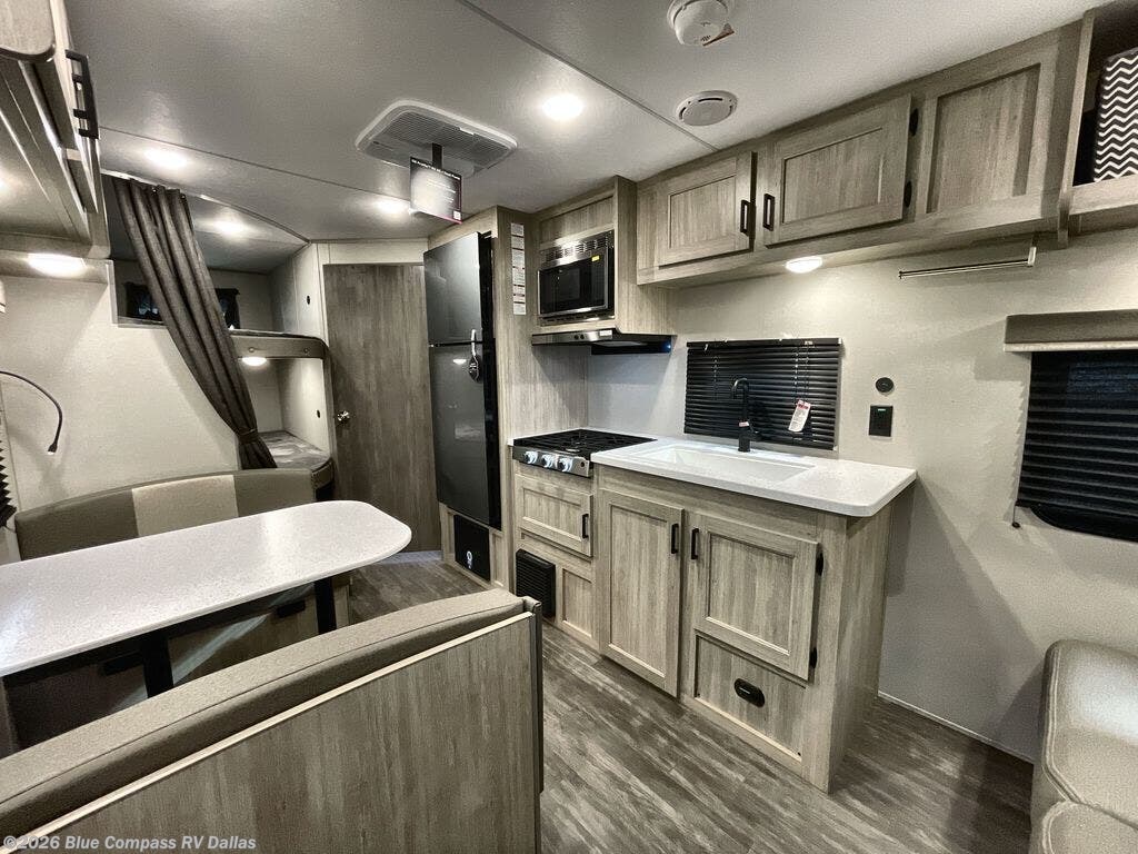 Pack your bags and head out on a fun weekend camping trip with this travel trailer! Whether you have a small family or a few guests wanting to come along, there will be enough sleeping spaces between the double-size bunk beds, the 60" x 74" queen bed in the front semi-private bedroom, and even the booth dinette. The chef can prepare meals indoors using the three burner cooktop or microwave oven, and there is a 12V 10.7 cu. ft. refrigerator for perishables. There is plenty of storage throughout with the overhead cabinets and wardrobes, as well as outside with the front pass-through storage area!
