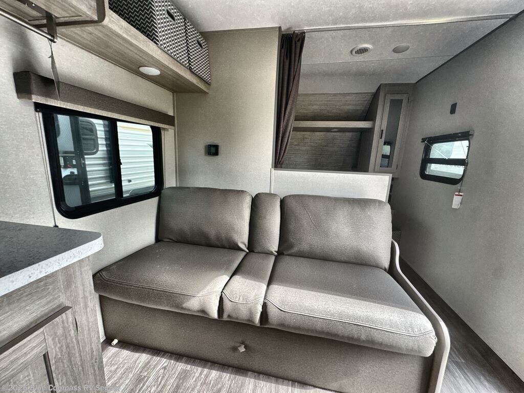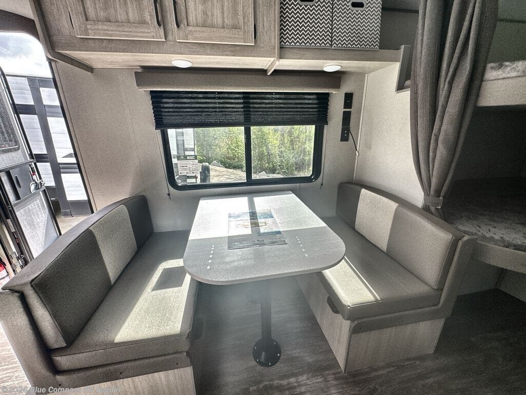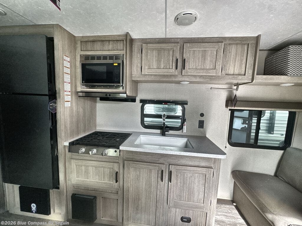 Pack your bags and head out on a fun weekend camping trip with this travel trailer! Whether you have a small family or a few guests wanting to come along, there will be enough sleeping spaces between the double-size bunk beds, the 60" x 74" queen bed in the front semi-private bedroom, and even the booth dinette. The chef can prepare meals indoors using the three burner cooktop or microwave oven, and there is a 12V 10.7 cu. ft. refrigerator for perishables. There is plenty of storage throughout with the overhead cabinets and wardrobes, as well as outside with the front pass-through storage area!