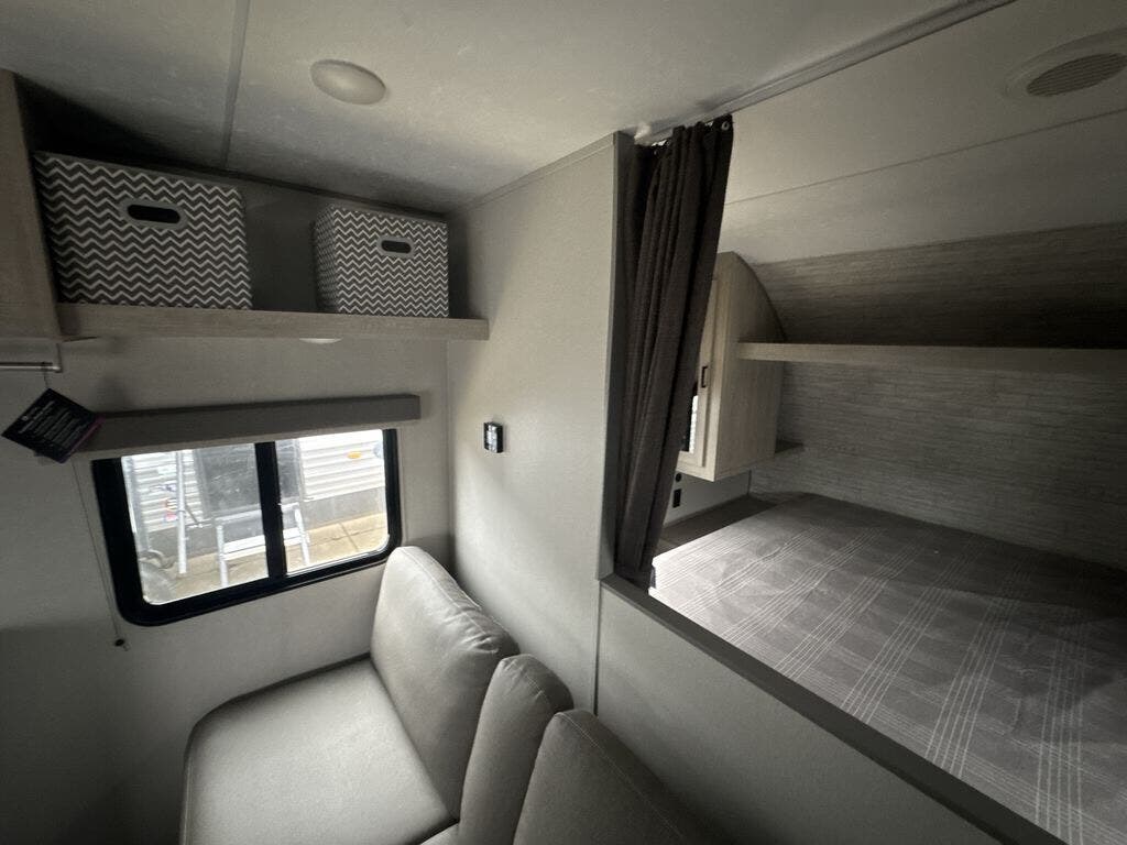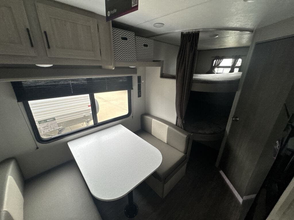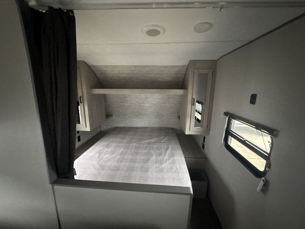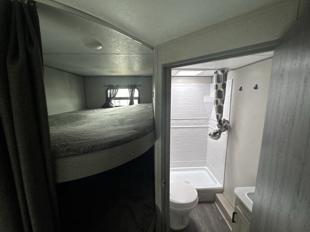 Pack your bags and head out on a fun weekend camping trip with this travel trailer! Whether you have a small family or a few guests wanting to come along, there will be enough sleeping spaces between the double-size bunk beds, the 60" x 74" queen bed in the front semi-private bedroom, and even the booth dinette. The chef can prepare meals indoors using the three burner cooktop or microwave oven, and there is a 12V 10.7 cu. ft. refrigerator for perishables. There is plenty of storage throughout with the overhead cabinets and wardrobes, as well as outside with the front pass-through storage area!