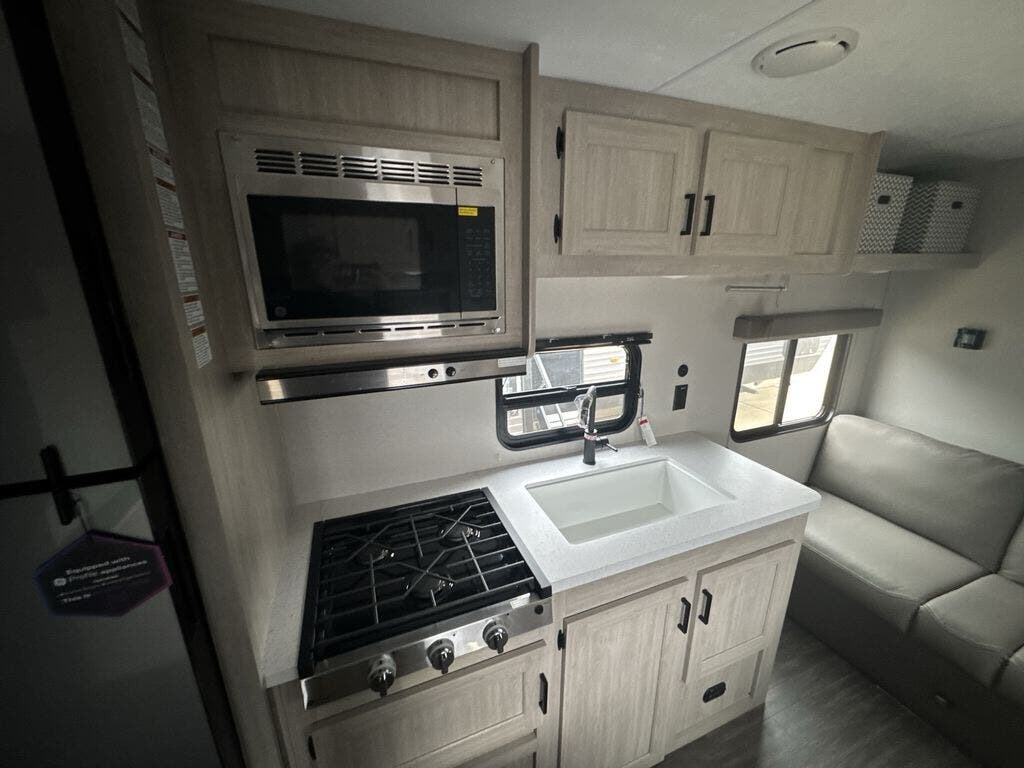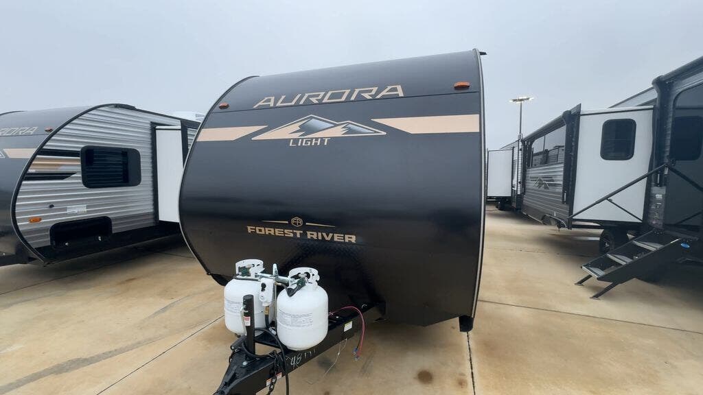 Comfortability, usability, and quality is what you will find in each one of these Forest River Aurora Light travel trailers! They are designed with a superior build and packed full with industry leading, functional, and distinctive standard features. The diamond plate rock guard will protect your unit from road debris and the nitrogen filled radial tires, which keep their pressure longer, offer better fuel economy. You will also find upgraded JBL Elite exterior speaker outside, an electric awning with multicolor lights and remote, plus flush mount baggage doors for easy packing. The interiors are beautifully designed with matte black kitchen and bath faucets, black nightshades in the living room, and GE kitchen appliances!