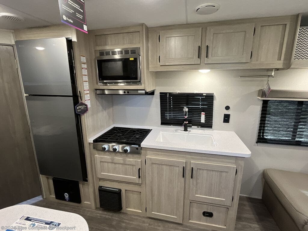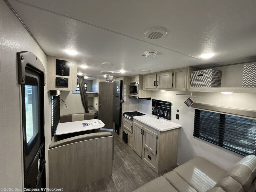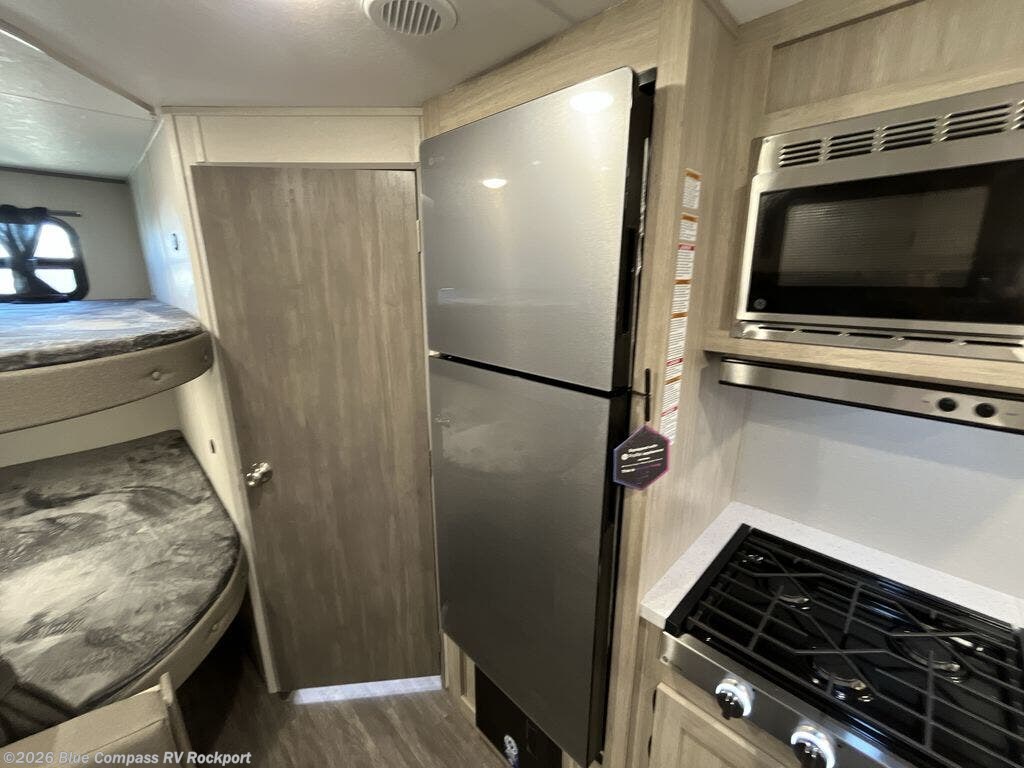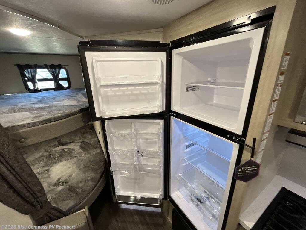Pack your bags and head out on a fun weekend camping trip with this travel trailer! Whether you have a small family or a few guests wanting to come along, there will be enough sleeping spaces between the double-size bunk beds, the 60" x 74" queen bed in the front semi-private bedroom, and even the booth dinette. The chef can prepare meals indoors using the three burner cooktop or microwave oven, and there is a 12V 10.7 cu. ft. refrigerator for perishables. There is plenty of storage throughout with the overhead cabinets and wardrobes, as well as outside with the front pass-through storage area!