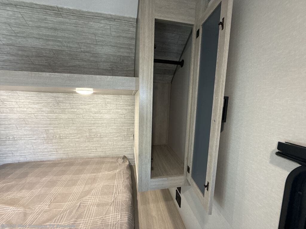 Pack your bags and head out on a fun weekend camping trip with this travel trailer! Whether you have a small family or a few guests wanting to come along, there will be enough sleeping spaces between the double-size bunk beds, the 60" x 74" queen bed in the front semi-private bedroom, and even the booth dinette. The chef can prepare meals indoors using the three burner cooktop or microwave oven, and there is a 12V 10.7 cu. ft. refrigerator for perishables. There is plenty of storage throughout with the overhead cabinets and wardrobes, as well as outside with the front pass-through storage area!