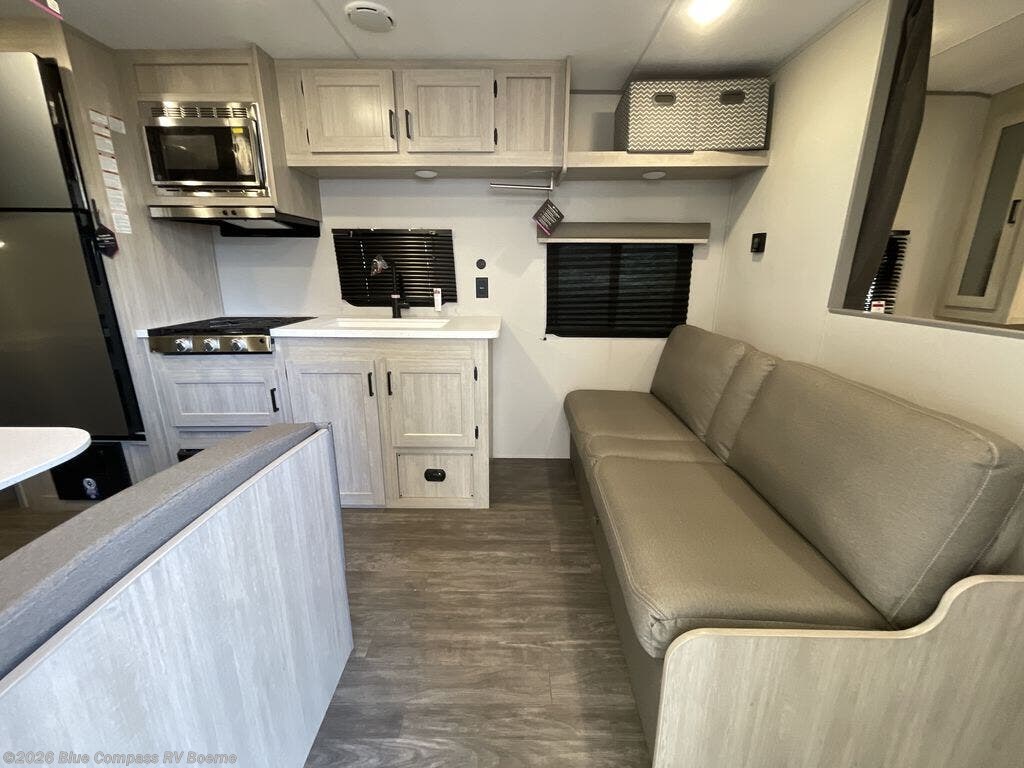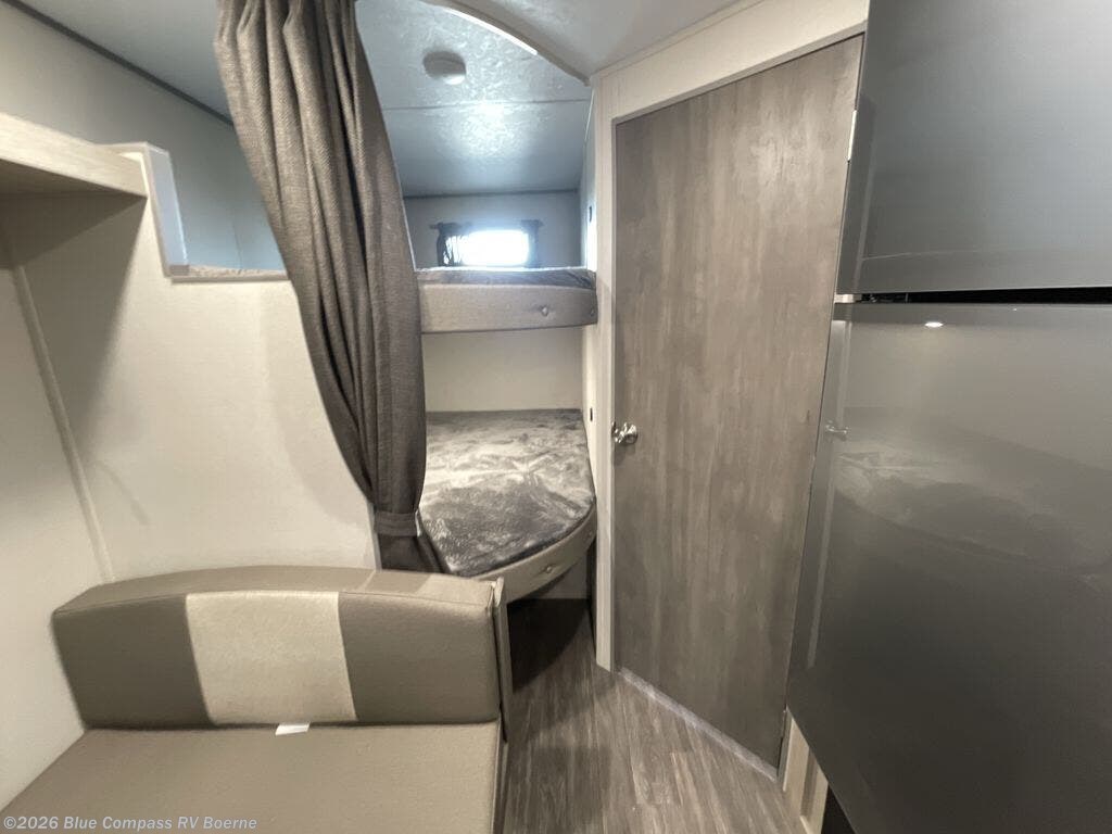 Pack your bags and head out on a fun weekend camping trip with this travel trailer! Whether you have a small family or a few guests wanting to come along, there will be enough sleeping spaces between the double-size bunk beds, the 60" x 74" queen bed in the front semi-private bedroom, and even the booth dinette. The chef can prepare meals indoors using the three burner cooktop or microwave oven, and there is a 12V 10.7 cu. ft. refrigerator for perishables. There is plenty of storage throughout with the overhead cabinets and wardrobes, as well as outside with the front pass-through storage area!