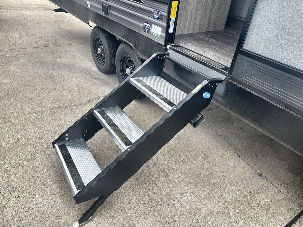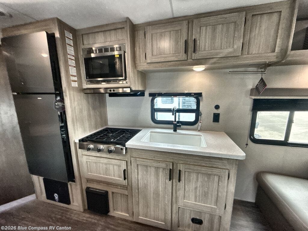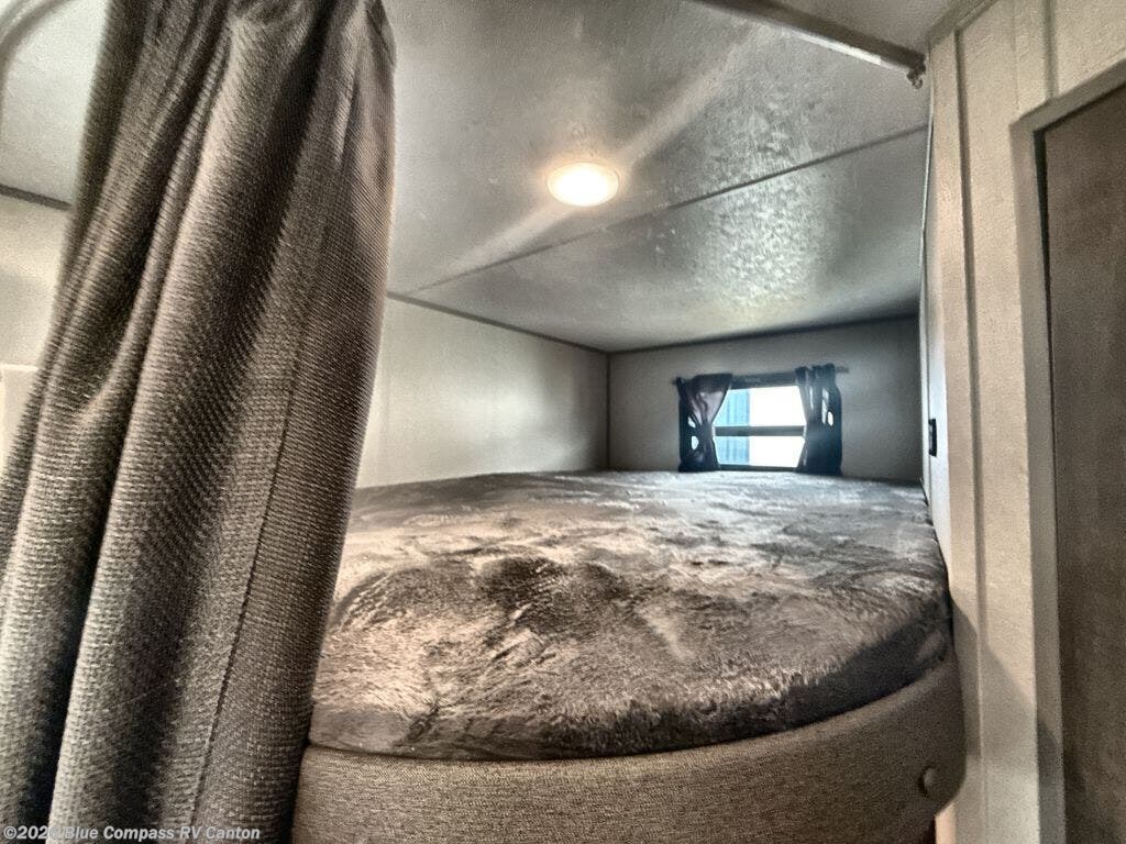 Pack your bags and head out on a fun weekend camping trip with this travel trailer! Whether you have a small family or a few guests wanting to come along, there will be enough sleeping spaces between the double-size bunk beds, the 60" x 74" queen bed in the front semi-private bedroom, and even the booth dinette. The chef can prepare meals indoors using the three burner cooktop or microwave oven, and there is a 12V 10.7 cu. ft. refrigerator for perishables. There is plenty of storage throughout with the overhead cabinets and wardrobes, as well as outside with the front pass-through storage area!