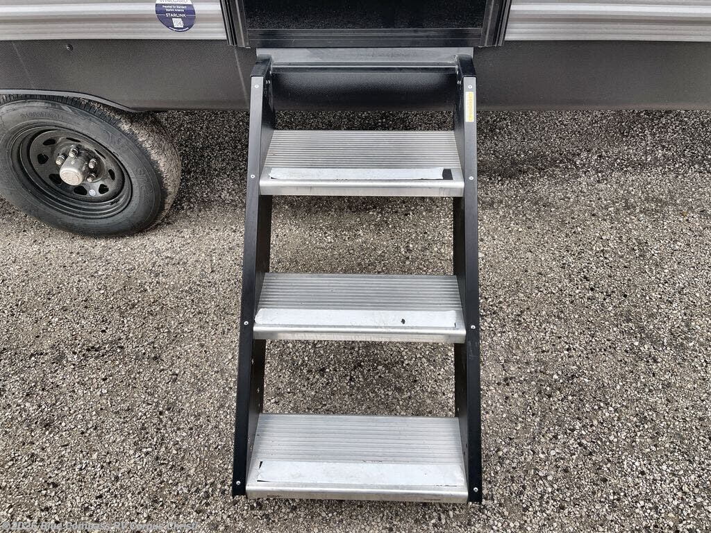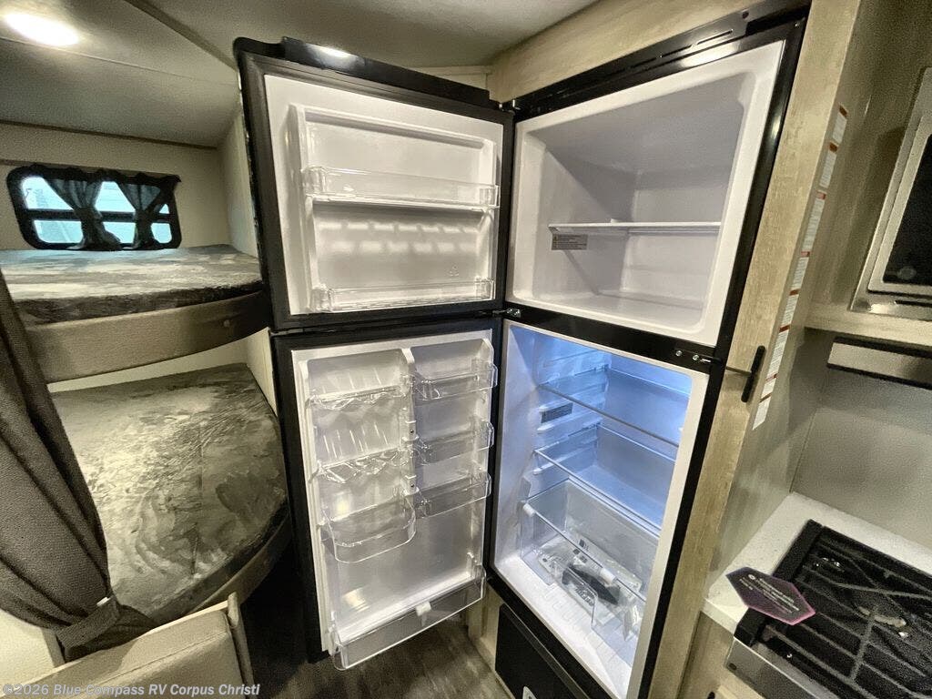 Pack your bags and head out on a fun weekend camping trip with this travel trailer! Whether you have a small family or a few guests wanting to come along, there will be enough sleeping spaces between the double-size bunk beds, the 60" x 74" queen bed in the front semi-private bedroom, and even the booth dinette. The chef can prepare meals indoors using the three burner cooktop or microwave oven, and there is a 12V 10.7 cu. ft. refrigerator for perishables. There is plenty of storage throughout with the overhead cabinets and wardrobes, as well as outside with the front pass-through storage area!