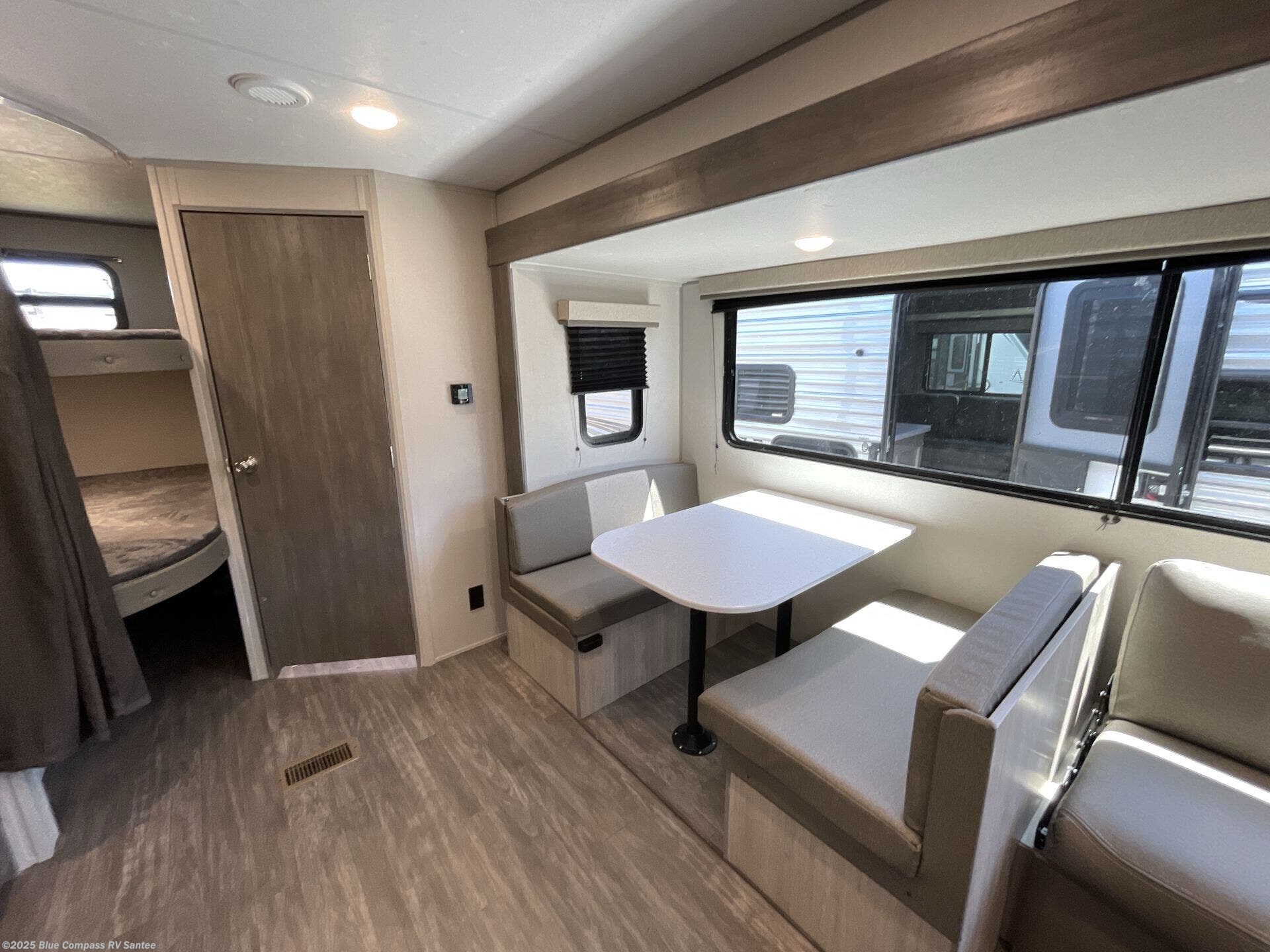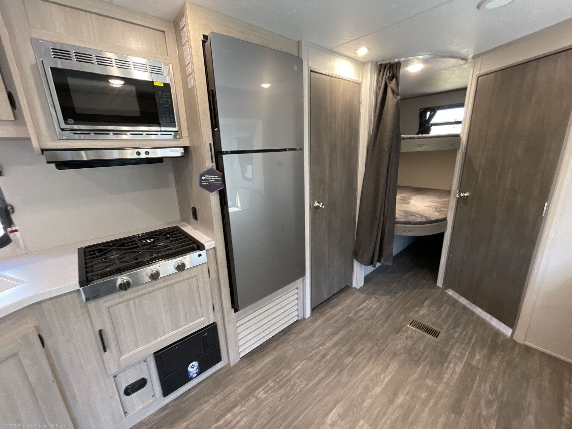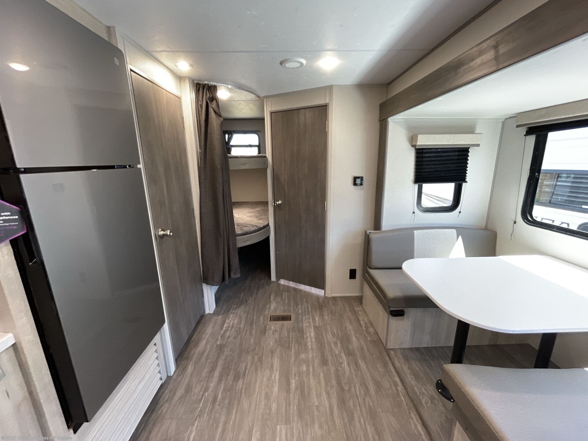 Everyone will have a comfortable time camping in this travel trailer! It features a set of double sized bunk beds for the kids or guests to sleep on and are conveniently next to the rear corner bathroom which has a tub/shower with a skylight above for added natural lighting. The booth dinette and sofa slide opens up the kitchen area so you have more space to prepare your best meals with the three burner cooktop. When you're ready to wind down your nights, grab a snack from the large pantry, a beverage from the 10.7 cu. ft. refrigerator, and place your drink in the cupholder/arm rest of the sofa while you watch a movie at the entertainment center!
