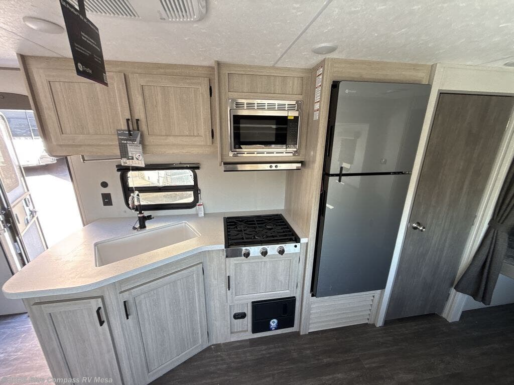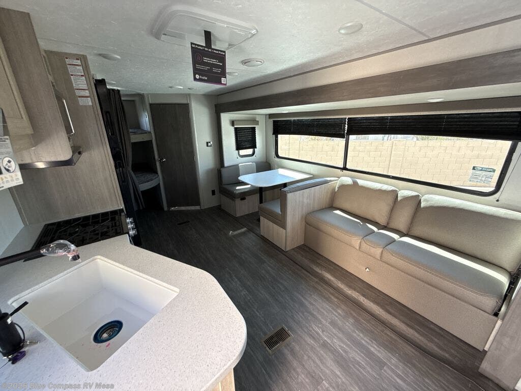 Everyone will have a comfortable time camping in this travel trailer! It features a set of double sized bunk beds for the kids or guests to sleep on and are conveniently next to the rear corner bathroom which has a tub/shower with a skylight above for added natural lighting. The booth dinette and sofa slide opens up the kitchen area so you have more space to prepare your best meals with the three burner cooktop. When you're ready to wind down your nights, grab a snack from the large pantry, a beverage from the 10.7 cu. ft. refrigerator, and place your drink in the cupholder/arm rest of the sofa while you watch a movie at the entertainment center!