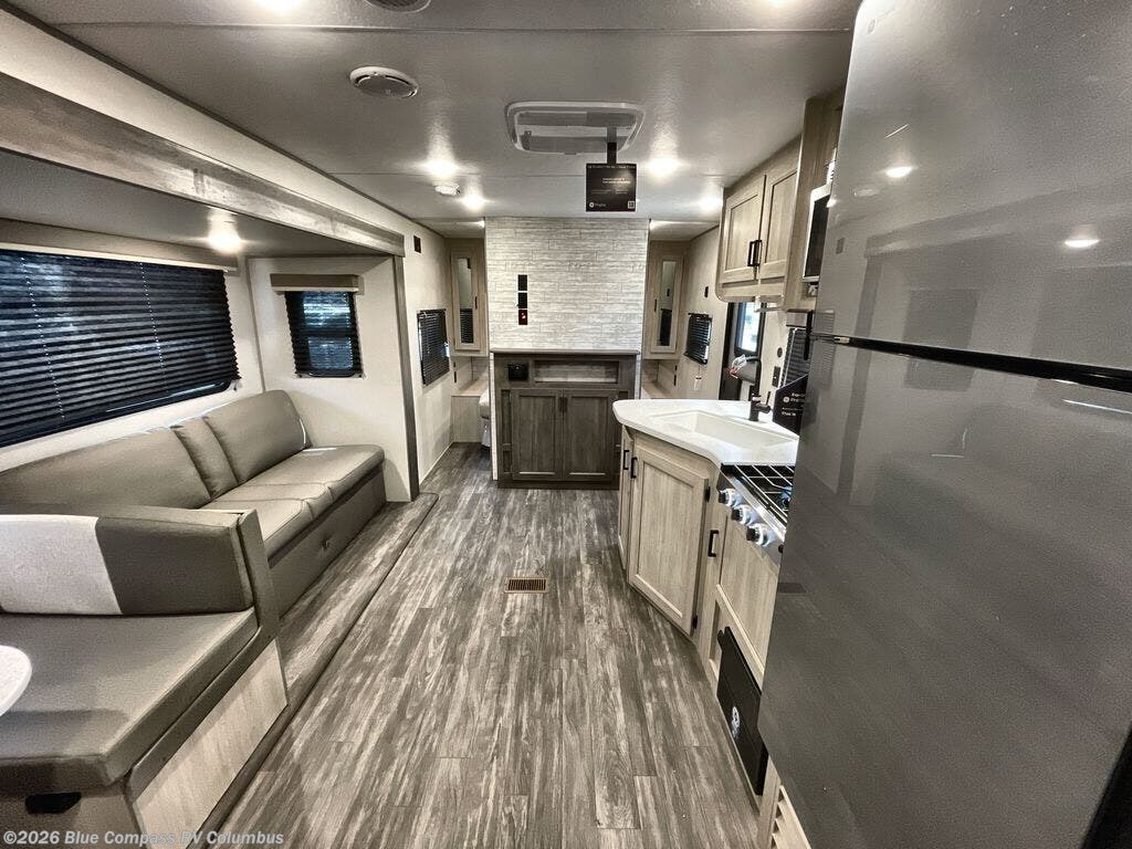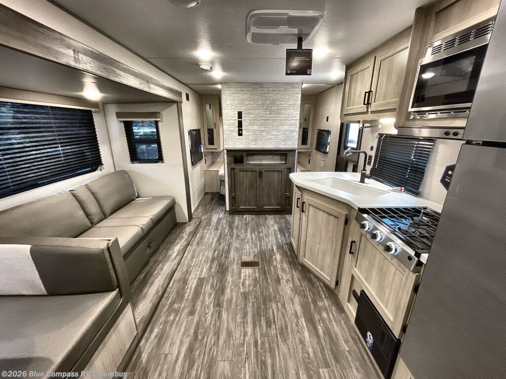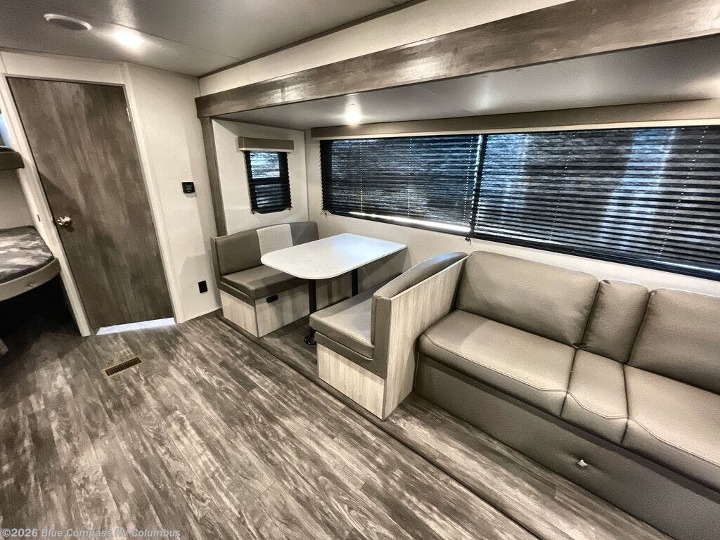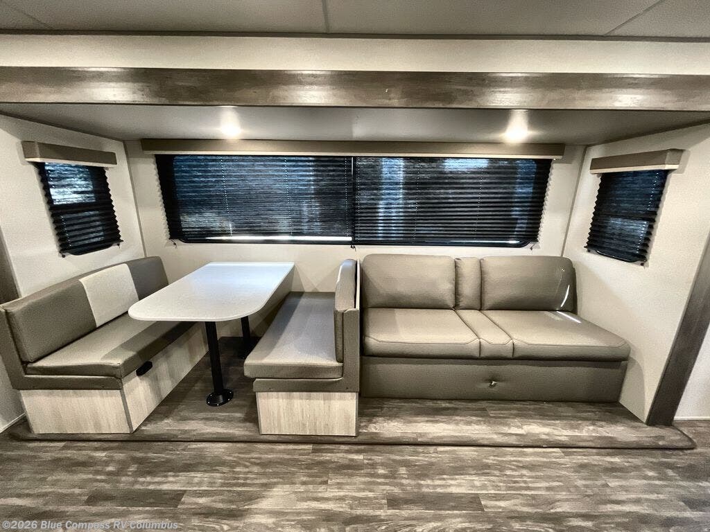 Everyone will have a comfortable time camping in this travel trailer! It features a set of double sized bunk beds for the kids or guests to sleep on and are conveniently next to the rear corner bathroom which has a tub/shower with a skylight above for added natural lighting. The booth dinette and sofa slide opens up the kitchen area so you have more space to prepare your best meals with the three burner cooktop. When you're ready to wind down your nights, grab a snack from the large pantry, a beverage from the 10.7 cu. ft. refrigerator, and place your drink in the cupholder/arm rest of the sofa while you watch a movie at the entertainment center!