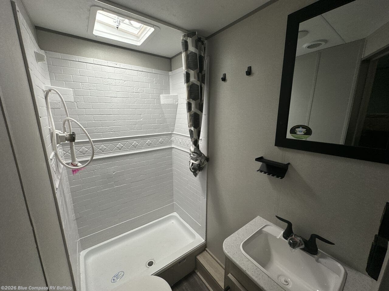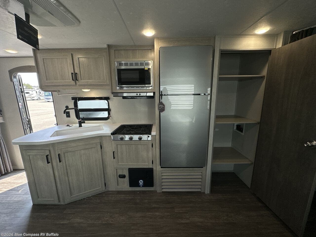 Everyone will have a comfortable time camping in this travel trailer! It features a set of double sized bunk beds for the kids or guests to sleep on and are conveniently next to the rear corner bathroom which has a tub/shower with a skylight above for added natural lighting. The booth dinette and sofa slide opens up the kitchen area so you have more space to prepare your best meals with the three burner cooktop. When you're ready to wind down your nights, grab a snack from the large pantry, a beverage from the 10.7 cu. ft. refrigerator, and place your drink in the cupholder/arm rest of the sofa while you watch a movie at the entertainment center!