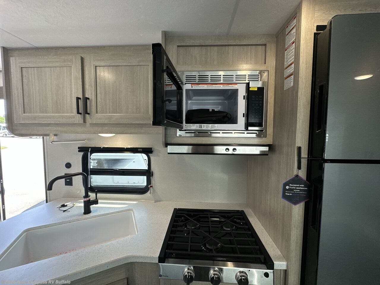 Comfortability, usability, and quality is what you will find in each one of these Forest River Aurora Light travel trailers! They are designed with a superior build and packed full with industry leading, functional, and distinctive standard features. The diamond plate rock guard will protect your unit from road debris and the nitrogen filled radial tires, which keep their pressure longer, offer better fuel economy. You will also find upgraded JBL Elite exterior speaker outside, an electric awning with multicolor lights and remote, plus flush mount baggage doors for easy packing. The interiors are beautifully designed with matte black kitchen and bath faucets, black nightshades in the living room, and GE kitchen appliances!