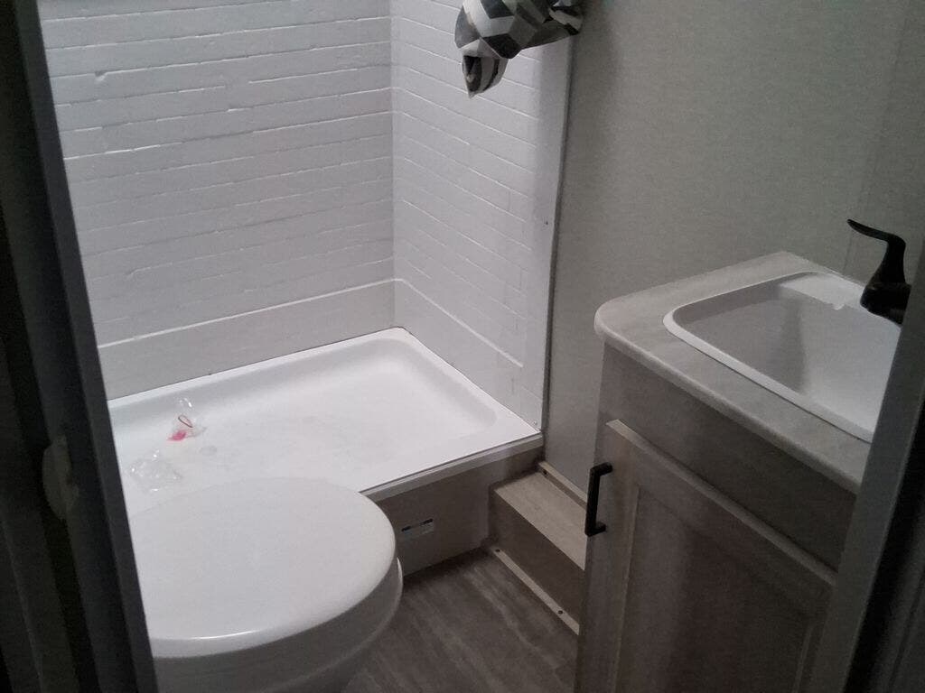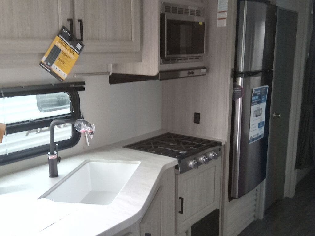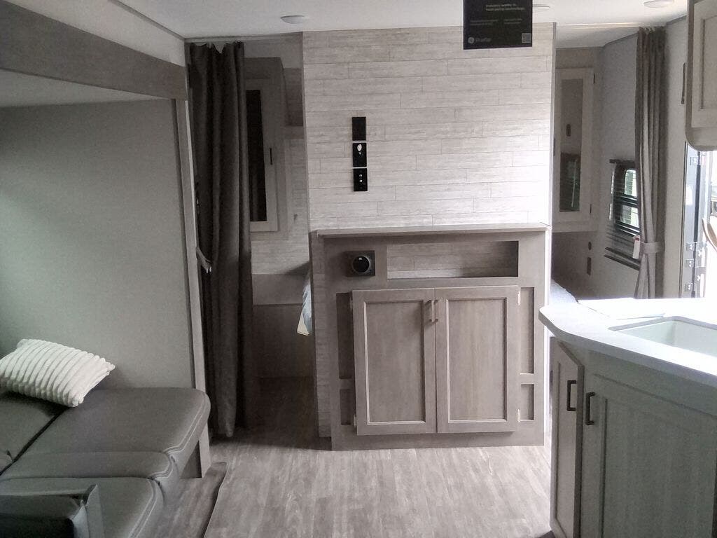 Everyone will have a comfortable time camping in this travel trailer! It features a set of double sized bunk beds for the kids or guests to sleep on and are conveniently next to the rear corner bathroom which has a tub/shower with a skylight above for added natural lighting. The booth dinette and sofa slide opens up the kitchen area so you have more space to prepare your best meals with the three burner cooktop. When you're ready to wind down your nights, grab a snack from the large pantry, a beverage from the 10.7 cu. ft. refrigerator, and place your drink in the cupholder/arm rest of the sofa while you watch a movie at the entertainment center!