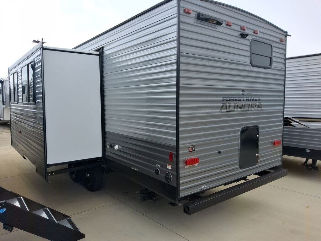 Comfortability, usability, and quality is what you will find in each one of these Forest River Aurora Light travel trailers! They are designed with a superior build and packed full with industry leading, functional, and distinctive standard features. The diamond plate rock guard will protect your unit from road debris and the nitrogen filled radial tires, which keep their pressure longer, offer better fuel economy. You will also find upgraded JBL Elite exterior speaker outside, an electric awning with multicolor lights and remote, plus flush mount baggage doors for easy packing. The interiors are beautifully designed with matte black kitchen and bath faucets, black nightshades in the living room, and GE kitchen appliances!