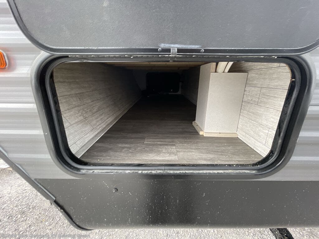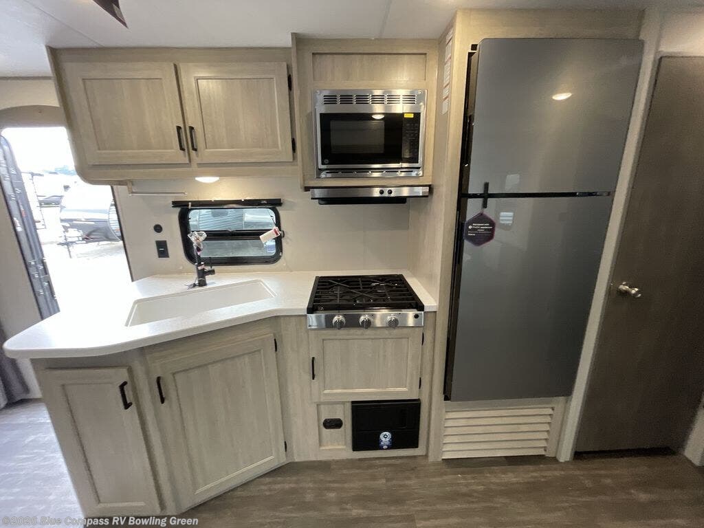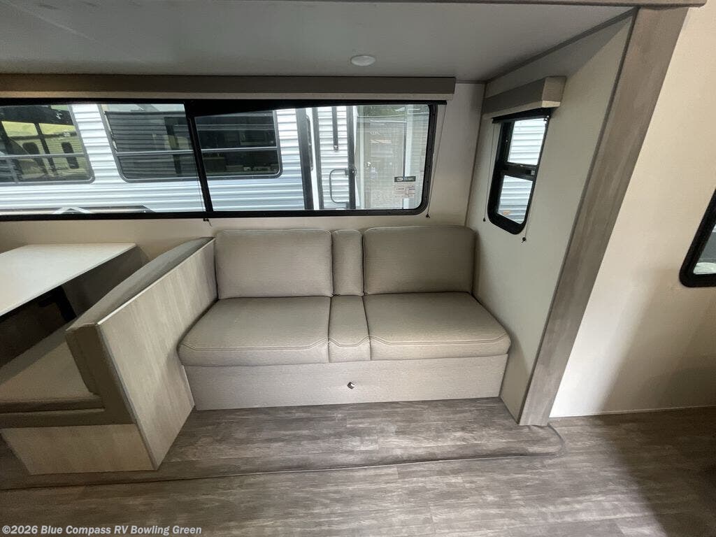 Everyone will have a comfortable time camping in this travel trailer! It features a set of double sized bunk beds for the kids or guests to sleep on and are conveniently next to the rear corner bathroom which has a tub/shower with a skylight above for added natural lighting. The booth dinette and sofa slide opens up the kitchen area so you have more space to prepare your best meals with the three burner cooktop. When you're ready to wind down your nights, grab a snack from the large pantry, a beverage from the 10.7 cu. ft. refrigerator, and place your drink in the cupholder/arm rest of the sofa while you watch a movie at the entertainment center!