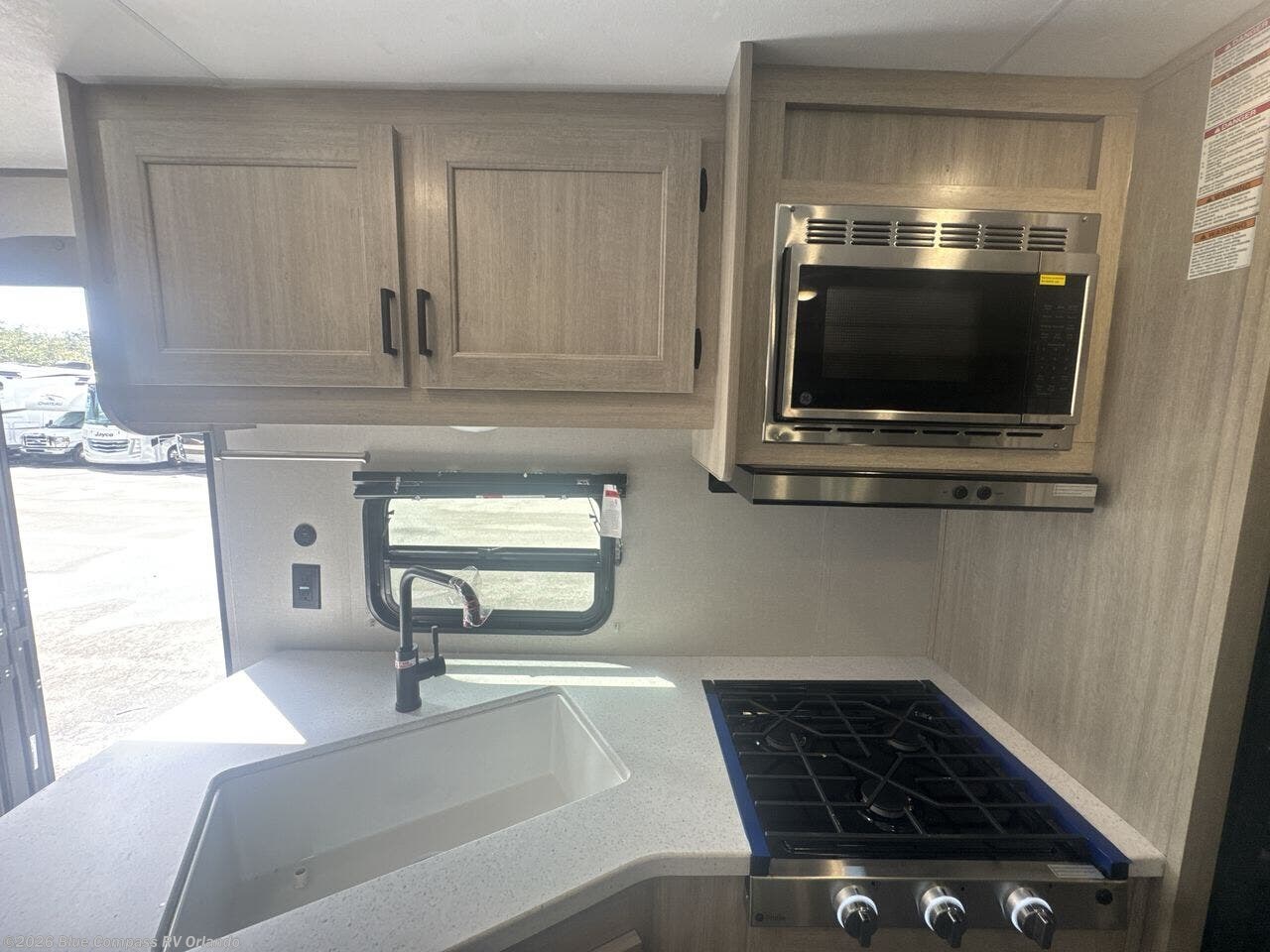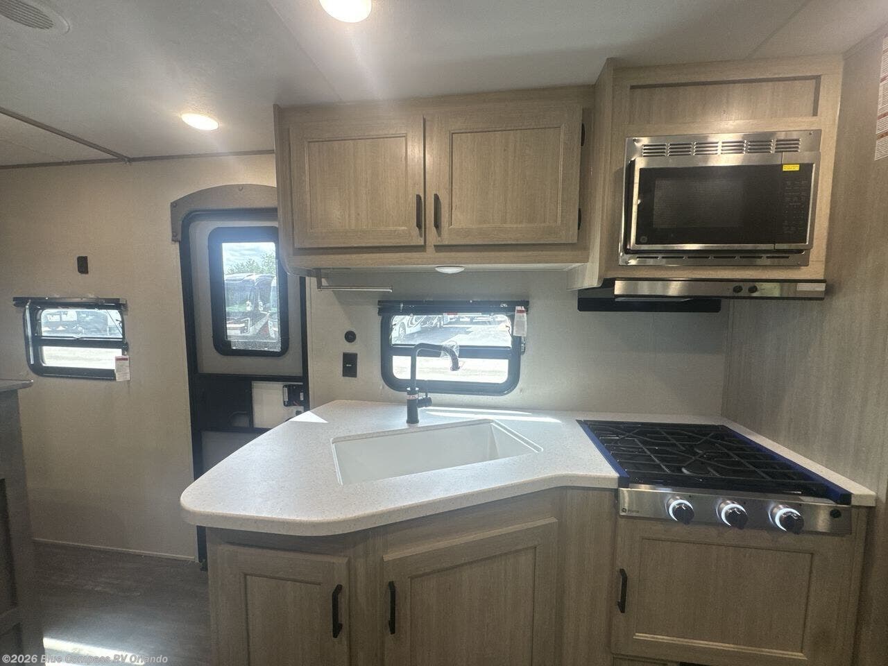Everyone will have a comfortable time camping in this travel trailer! It features a set of double sized bunk beds for the kids or guests to sleep on and are conveniently next to the rear corner bathroom which has a tub/shower with a skylight above for added natural lighting. The booth dinette and sofa slide opens up the kitchen area so you have more space to prepare your best meals with the three burner cooktop. When you're ready to wind down your nights, grab a snack from the large pantry, a beverage from the 10.7 cu. ft. refrigerator, and place your drink in the cupholder/arm rest of the sofa while you watch a movie at the entertainment center!
