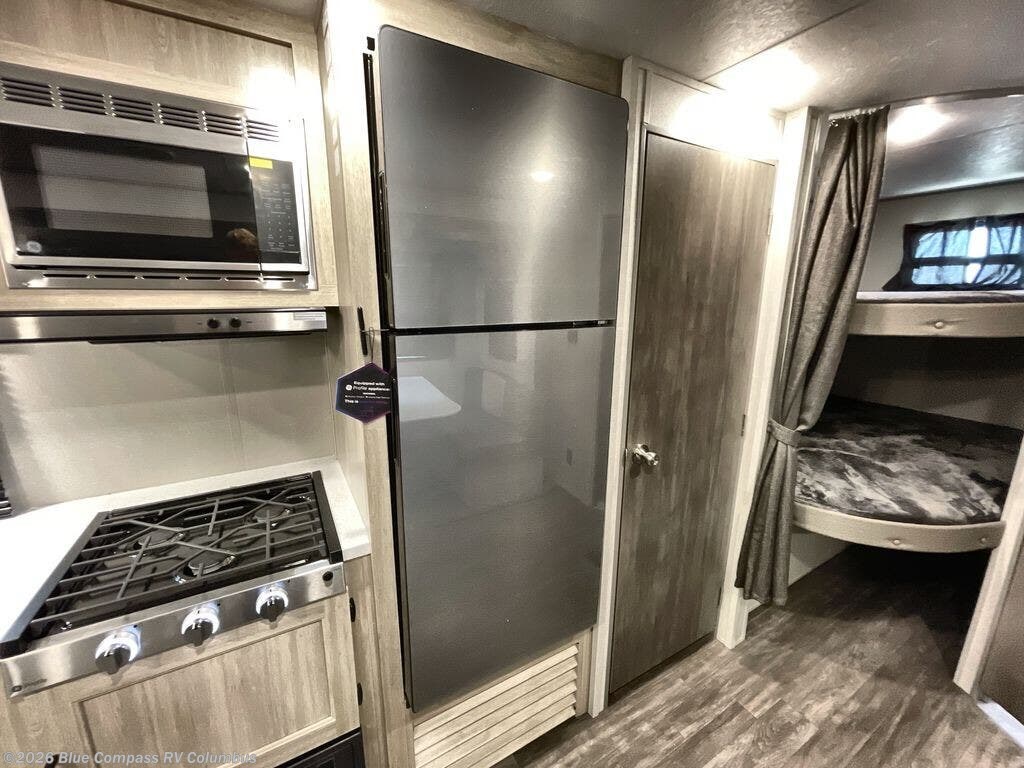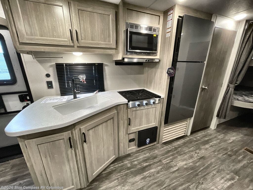 Everyone will have a comfortable time camping in this travel trailer! It features a set of double sized bunk beds for the kids or guests to sleep on and are conveniently next to the rear corner bathroom which has a tub/shower with a skylight above for added natural lighting. The booth dinette and sofa slide opens up the kitchen area so you have more space to prepare your best meals with the three burner cooktop. When you're ready to wind down your nights, grab a snack from the large pantry, a beverage from the 10.7 cu. ft. refrigerator, and place your drink in the cupholder/arm rest of the sofa while you watch a movie at the entertainment center!