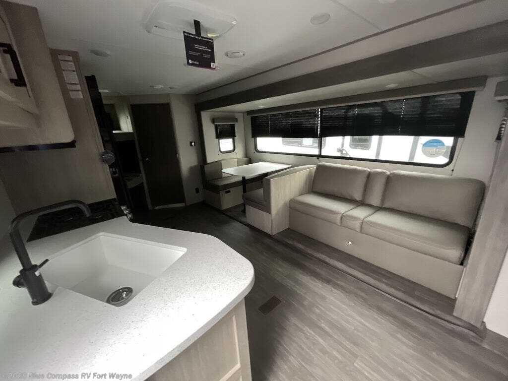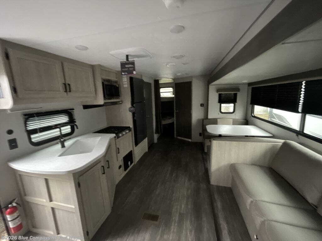 Everyone will have a comfortable time camping in this travel trailer! It features a set of double sized bunk beds for the kids or guests to sleep on and are conveniently next to the rear corner bathroom which has a tub/shower with a skylight above for added natural lighting. The booth dinette and sofa slide opens up the kitchen area so you have more space to prepare your best meals with the three burner cooktop. When you're ready to wind down your nights, grab a snack from the large pantry, a beverage from the 10.7 cu. ft. refrigerator, and place your drink in the cupholder/arm rest of the sofa while you watch a movie at the entertainment center!