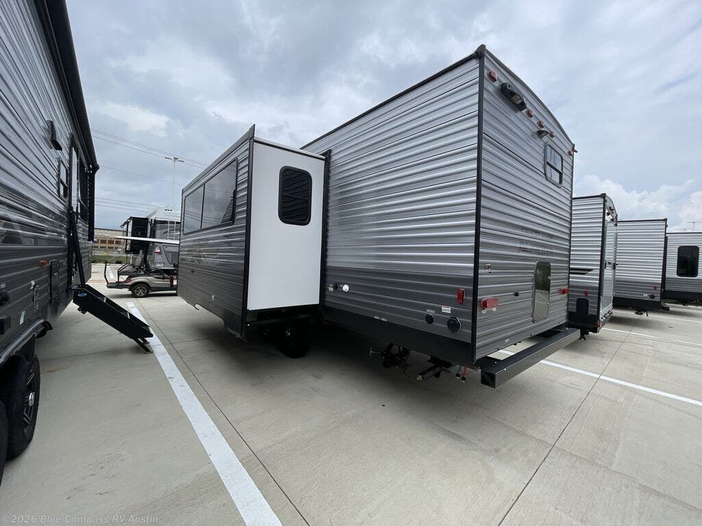 Everyone will have a comfortable time camping in this travel trailer! It features a set of double sized bunk beds for the kids or guests to sleep on and are conveniently next to the rear corner bathroom which has a tub/shower with a skylight above for added natural lighting. The booth dinette and sofa slide opens up the kitchen area so you have more space to prepare your best meals with the three burner cooktop. When you're ready to wind down your nights, grab a snack from the large pantry, a beverage from the 10.7 cu. ft. refrigerator, and place your drink in the cupholder/arm rest of the sofa while you watch a movie at the entertainment center!