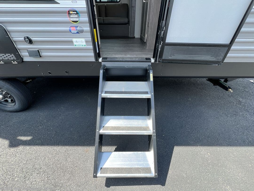 Everyone will have a comfortable time camping in this travel trailer! It features a set of double sized bunk beds for the kids or guests to sleep on and are conveniently next to the rear corner bathroom which has a tub/shower with a skylight above for added natural lighting. The booth dinette and sofa slide opens up the kitchen area so you have more space to prepare your best meals with the three burner cooktop. When you're ready to wind down your nights, grab a snack from the large pantry, a beverage from the 10.7 cu. ft. refrigerator, and place your drink in the cupholder/arm rest of the sofa while you watch a movie at the entertainment center!