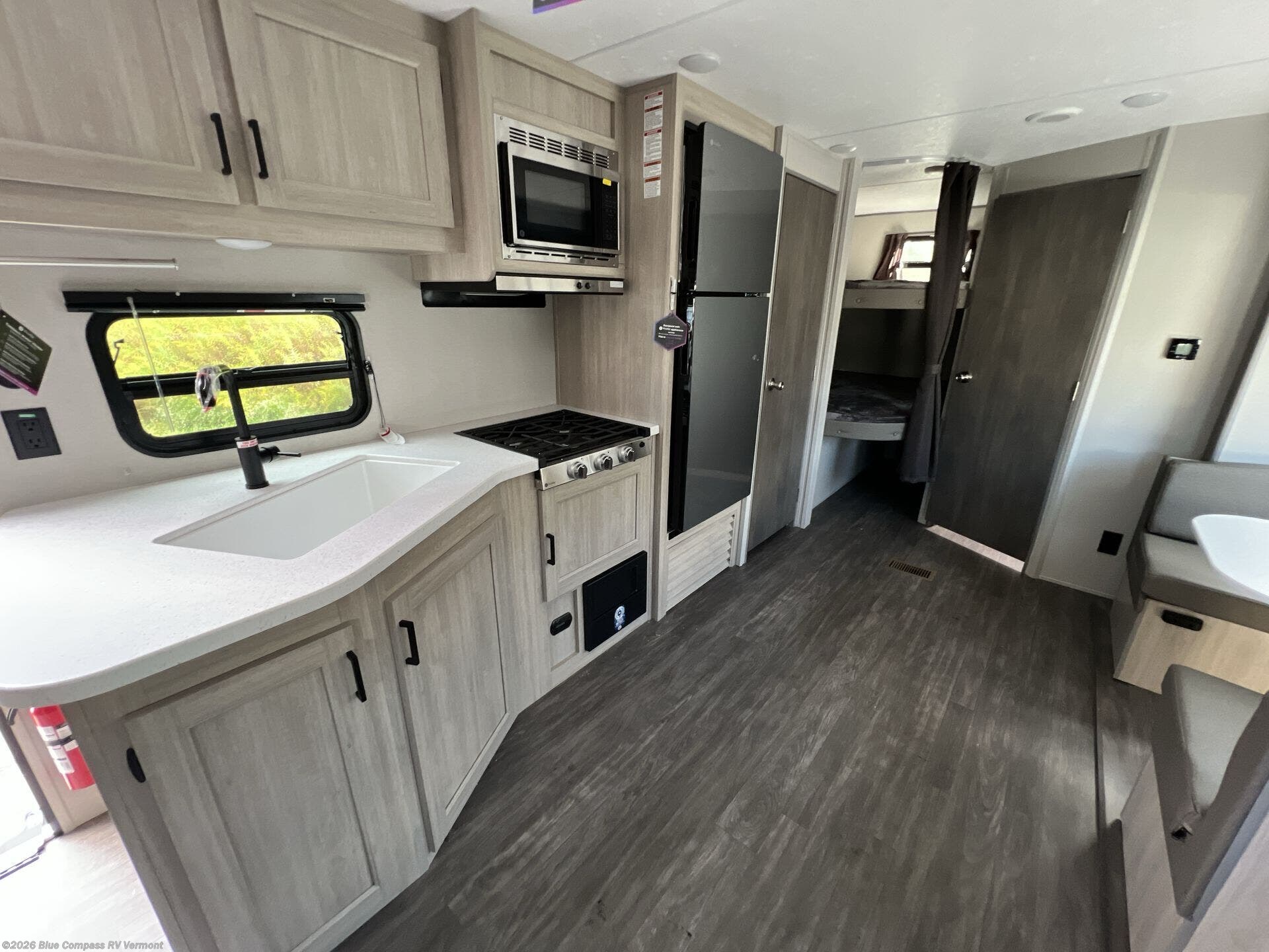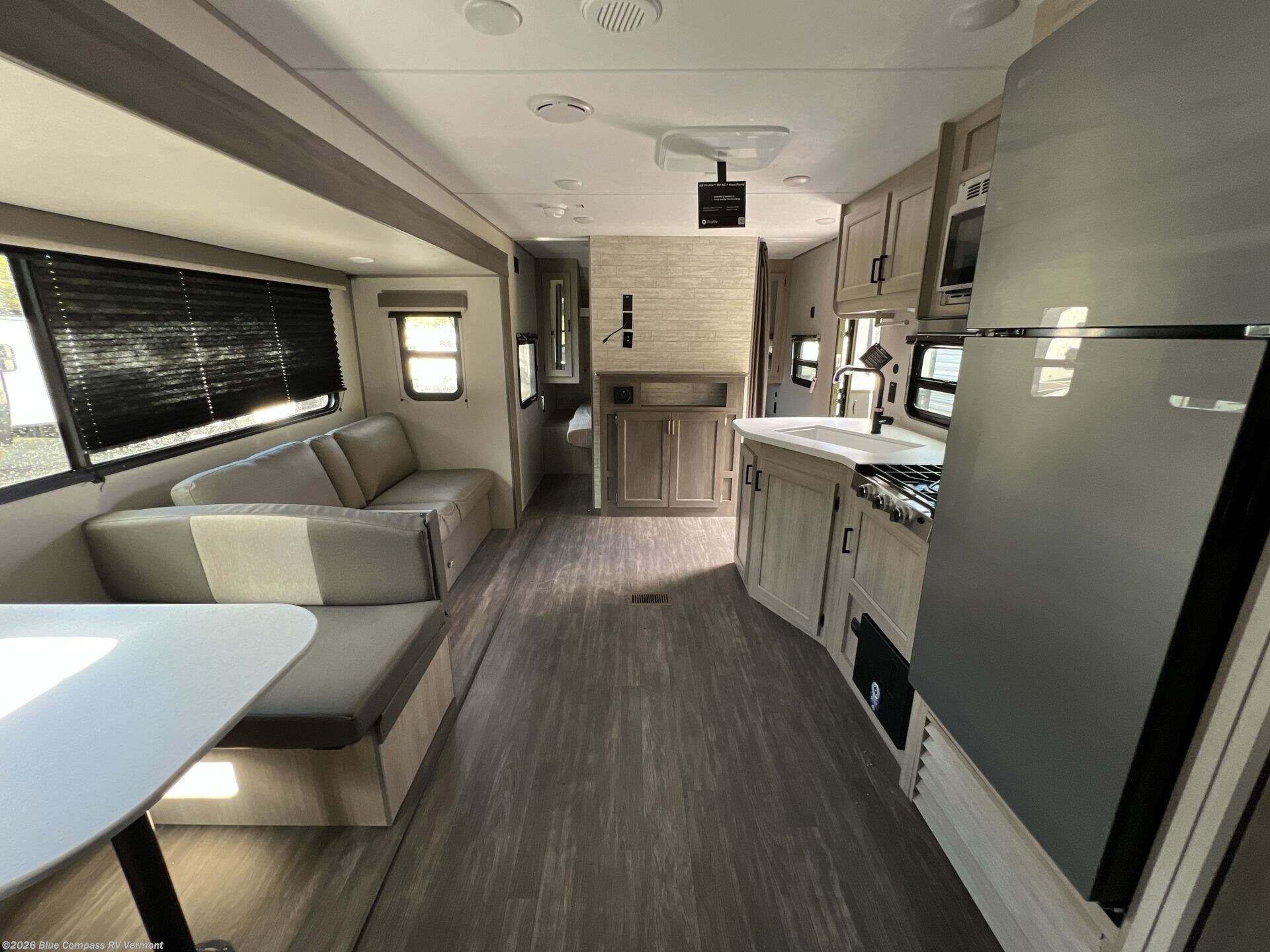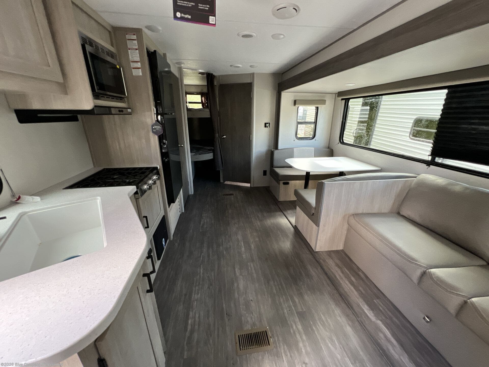 Everyone will have a comfortable time camping in this travel trailer! It features a set of double sized bunk beds for the kids or guests to sleep on and are conveniently next to the rear corner bathroom which has a tub/shower with a skylight above for added natural lighting. The booth dinette and sofa slide opens up the kitchen area so you have more space to prepare your best meals with the three burner cooktop. When you're ready to wind down your nights, grab a snack from the large pantry, a beverage from the 10.7 cu. ft. refrigerator, and place your drink in the cupholder/arm rest of the sofa while you watch a movie at the entertainment center!