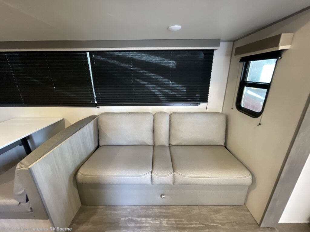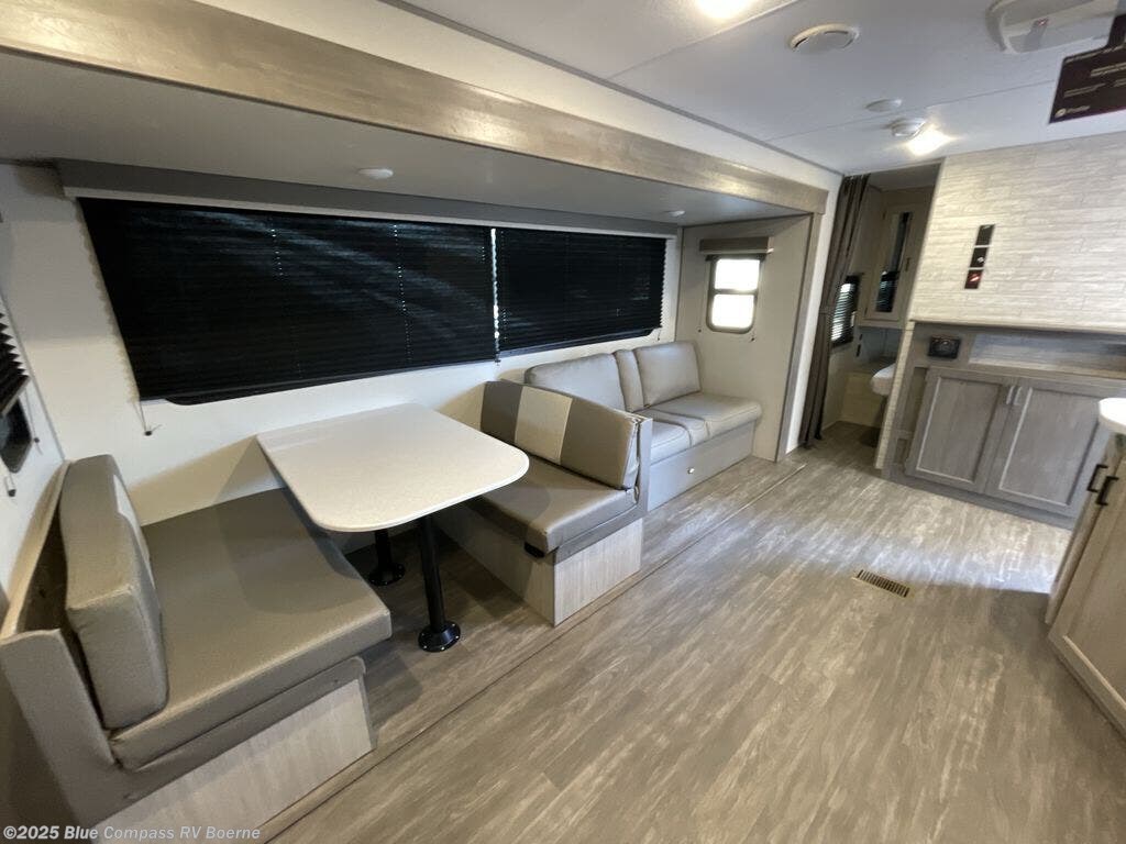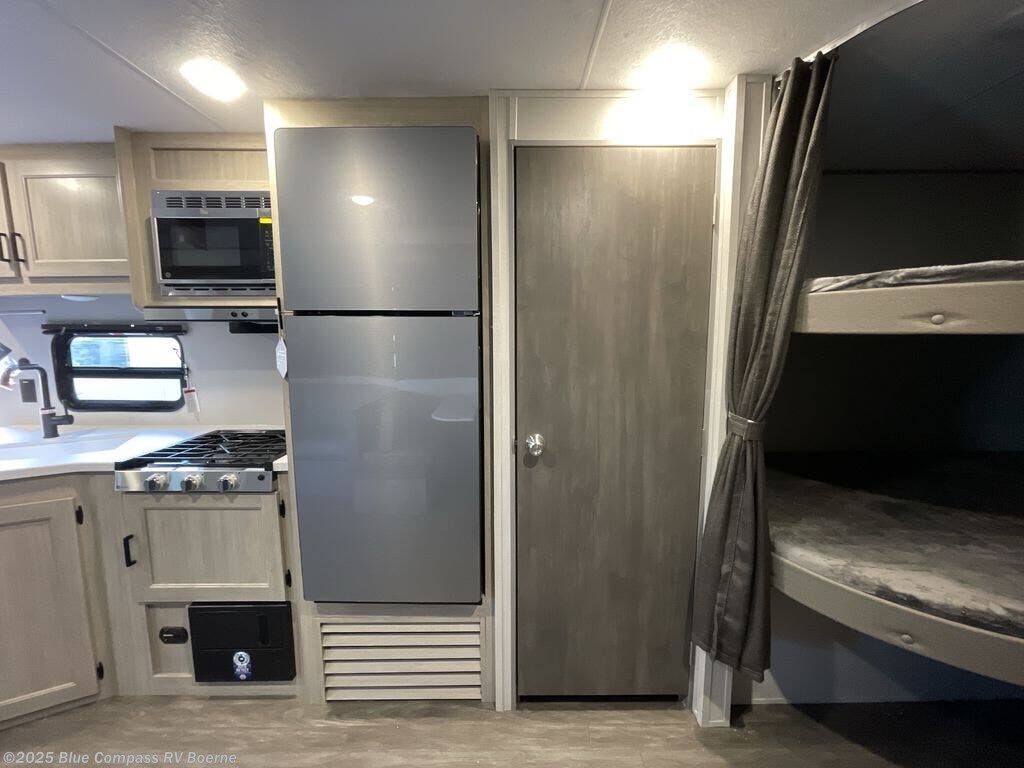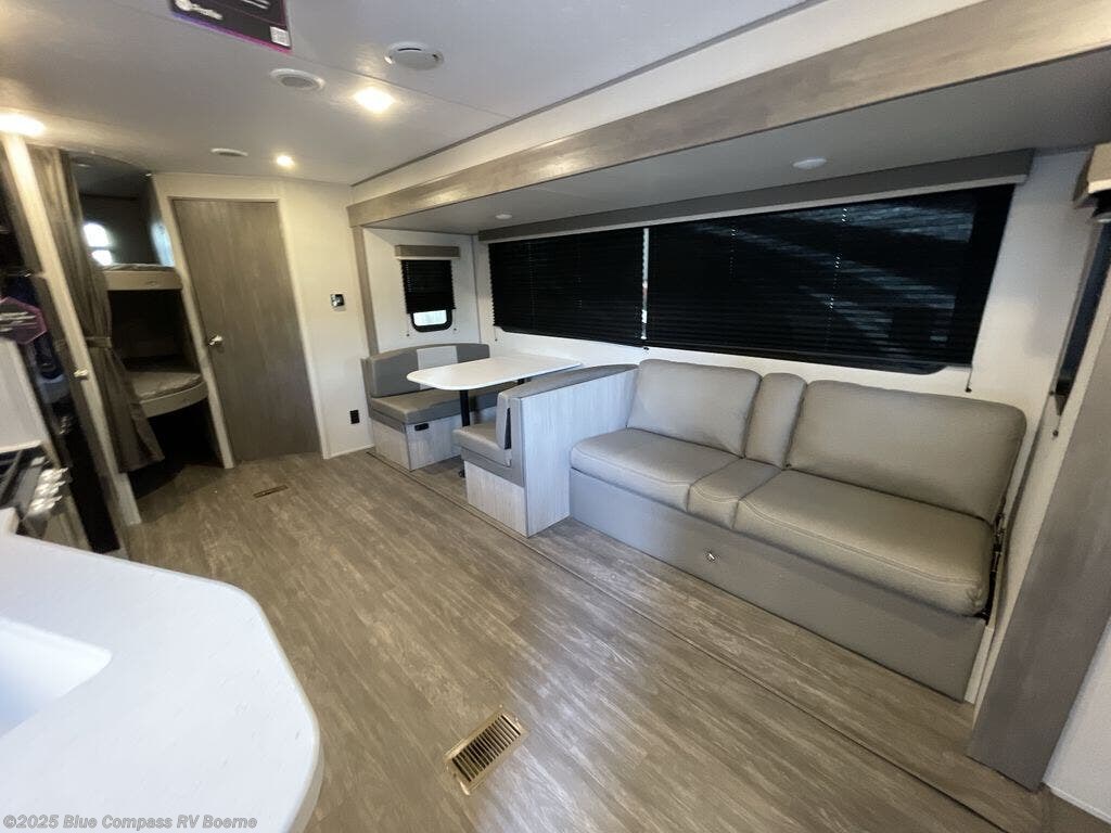 Everyone will have a comfortable time camping in this travel trailer! It features a set of double sized bunk beds for the kids or guests to sleep on and are conveniently next to the rear corner bathroom which has a tub/shower with a skylight above for added natural lighting. The booth dinette and sofa slide opens up the kitchen area so you have more space to prepare your best meals with the three burner cooktop. When you're ready to wind down your nights, grab a snack from the large pantry, a beverage from the 10.7 cu. ft. refrigerator, and place your drink in the cupholder/arm rest of the sofa while you watch a movie at the entertainment center!
