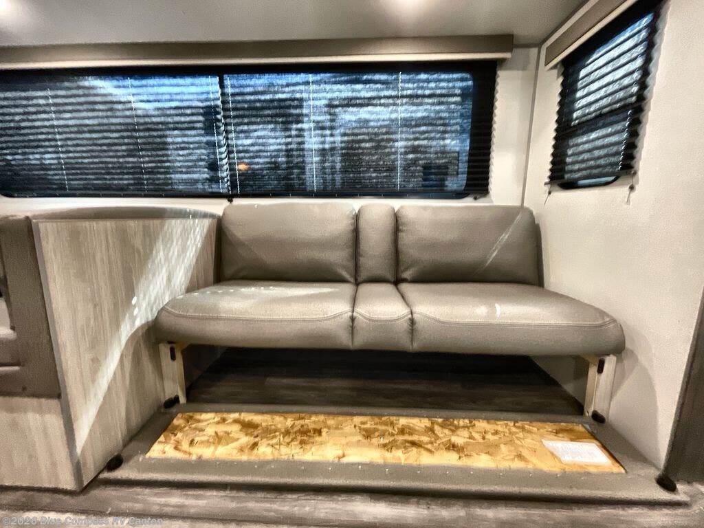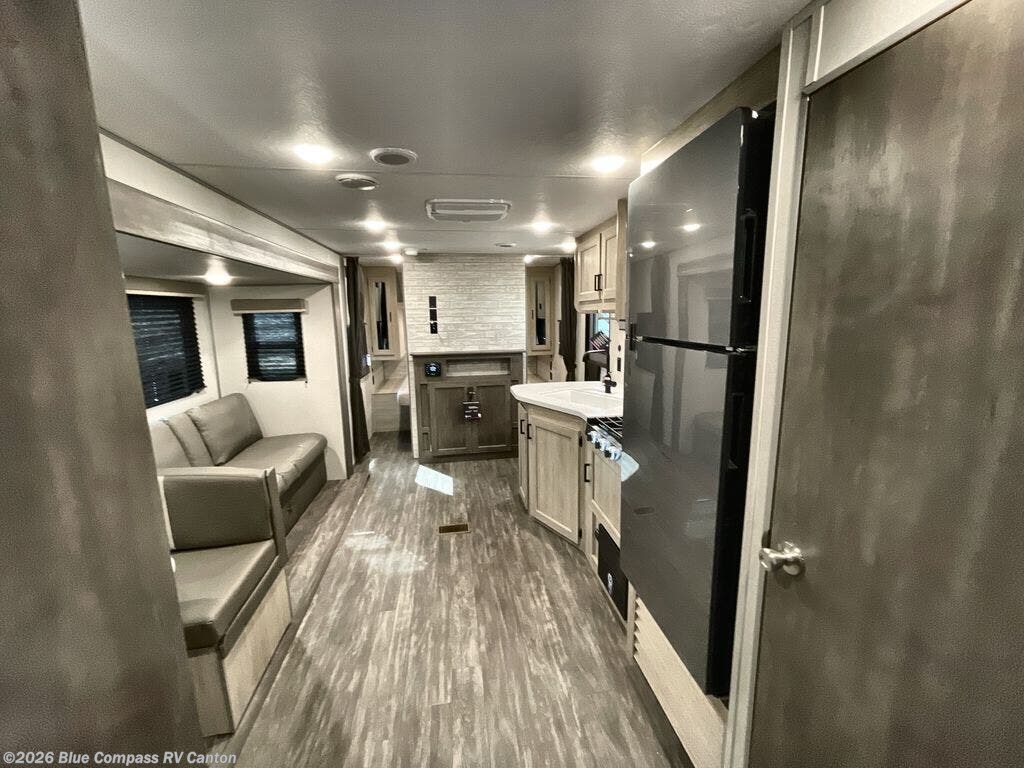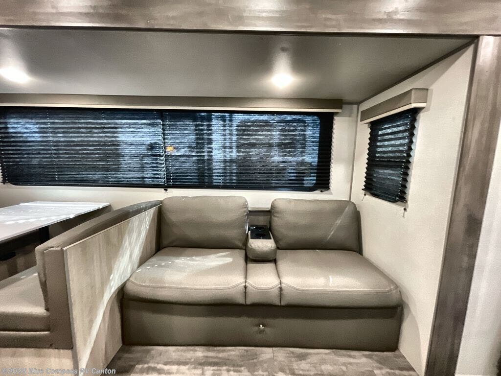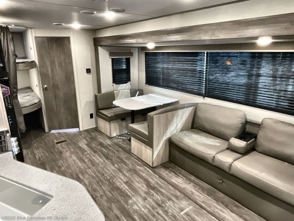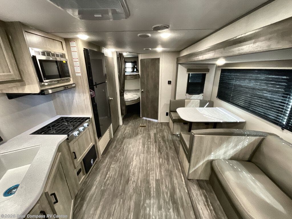 Everyone will have a comfortable time camping in this travel trailer! It features a set of double sized bunk beds for the kids or guests to sleep on and are conveniently next to the rear corner bathroom which has a tub/shower with a skylight above for added natural lighting. The booth dinette and sofa slide opens up the kitchen area so you have more space to prepare your best meals with the three burner cooktop. When you're ready to wind down your nights, grab a snack from the large pantry, a beverage from the 10.7 cu. ft. refrigerator, and place your drink in the cupholder/arm rest of the sofa while you watch a movie at the entertainment center!