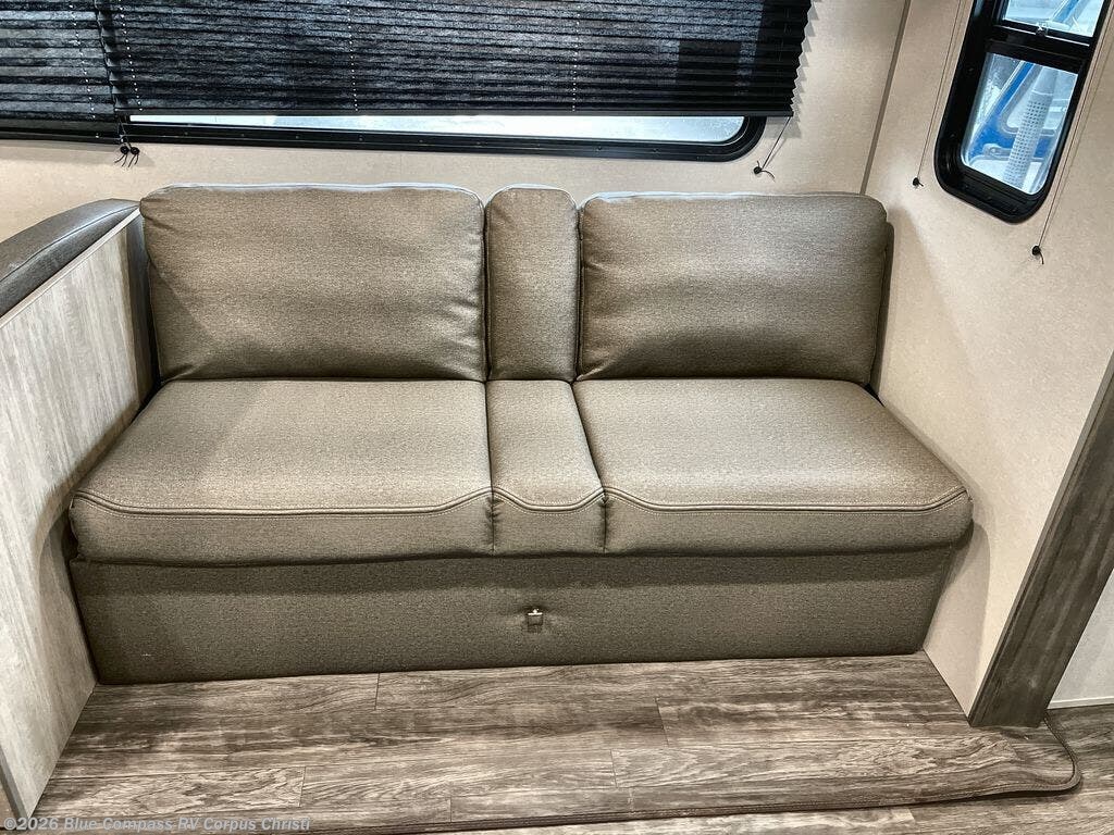 Everyone will have a comfortable time camping in this travel trailer! It features a set of double sized bunk beds for the kids or guests to sleep on and are conveniently next to the rear corner bathroom which has a tub/shower with a skylight above for added natural lighting. The booth dinette and sofa slide opens up the kitchen area so you have more space to prepare your best meals with the three burner cooktop. When you're ready to wind down your nights, grab a snack from the large pantry, a beverage from the 10.7 cu. ft. refrigerator, and place your drink in the cupholder/arm rest of the sofa while you watch a movie at the entertainment center!