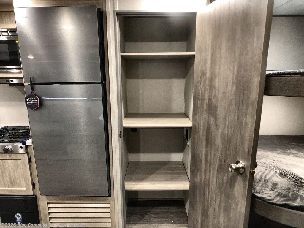 Everyone will have a comfortable time camping in this travel trailer! It features a set of double sized bunk beds for the kids or guests to sleep on and are conveniently next to the rear corner bathroom which has a tub/shower with a skylight above for added natural lighting. The booth dinette and sofa slide opens up the kitchen area so you have more space to prepare your best meals with the three burner cooktop. When you're ready to wind down your nights, grab a snack from the large pantry, a beverage from the 10.7 cu. ft. refrigerator, and place your drink in the cupholder/arm rest of the sofa while you watch a movie at the entertainment center!