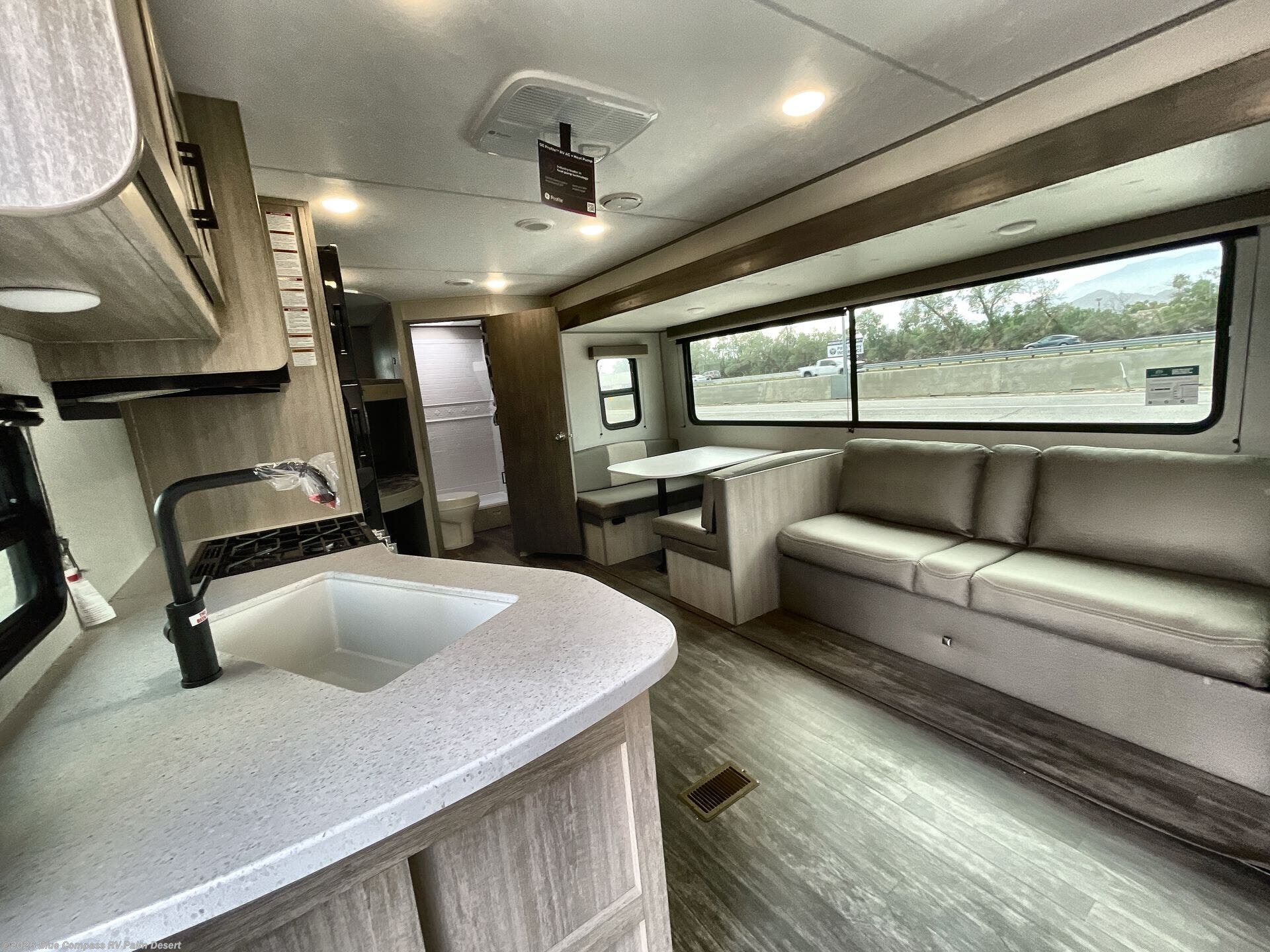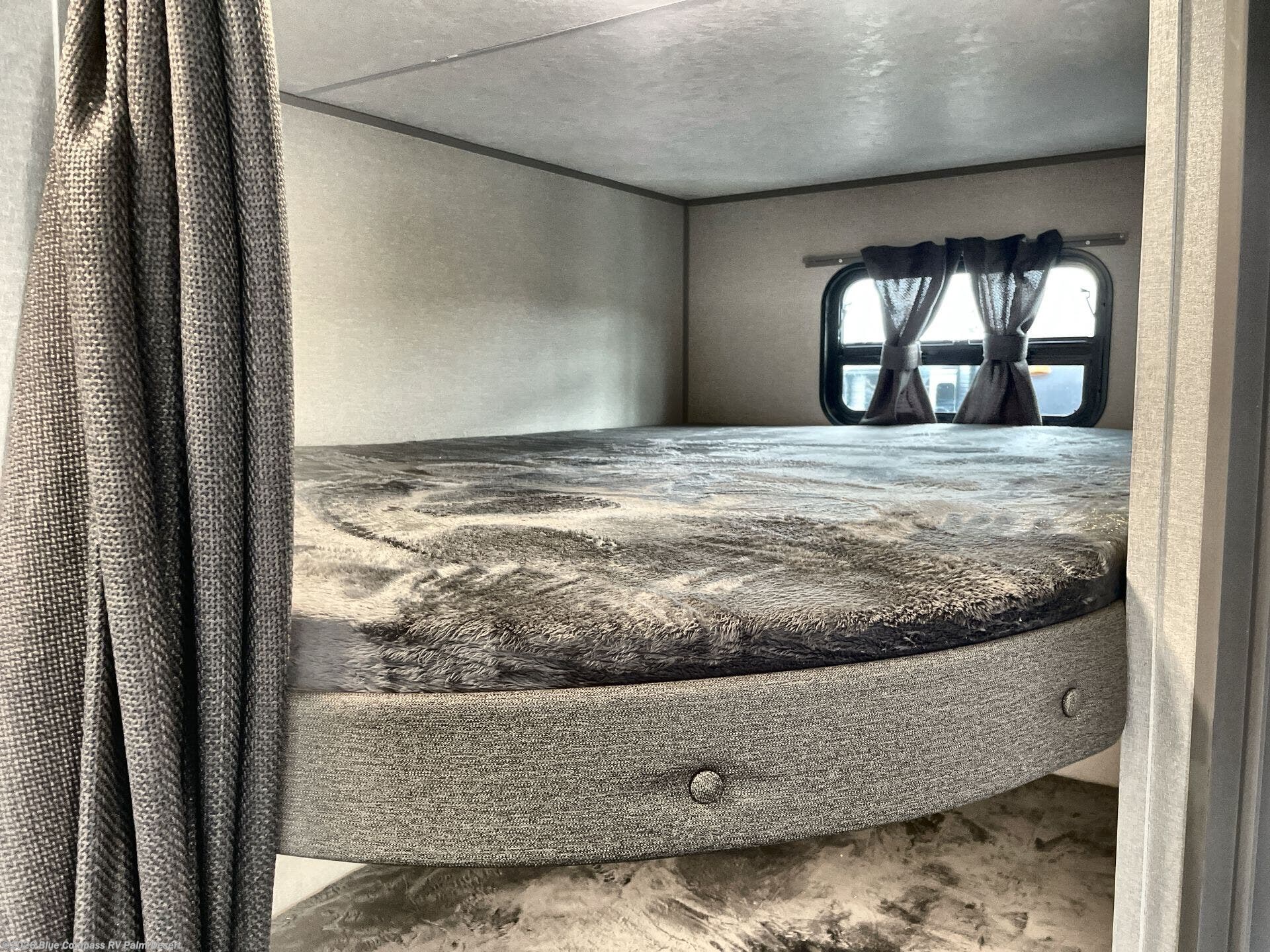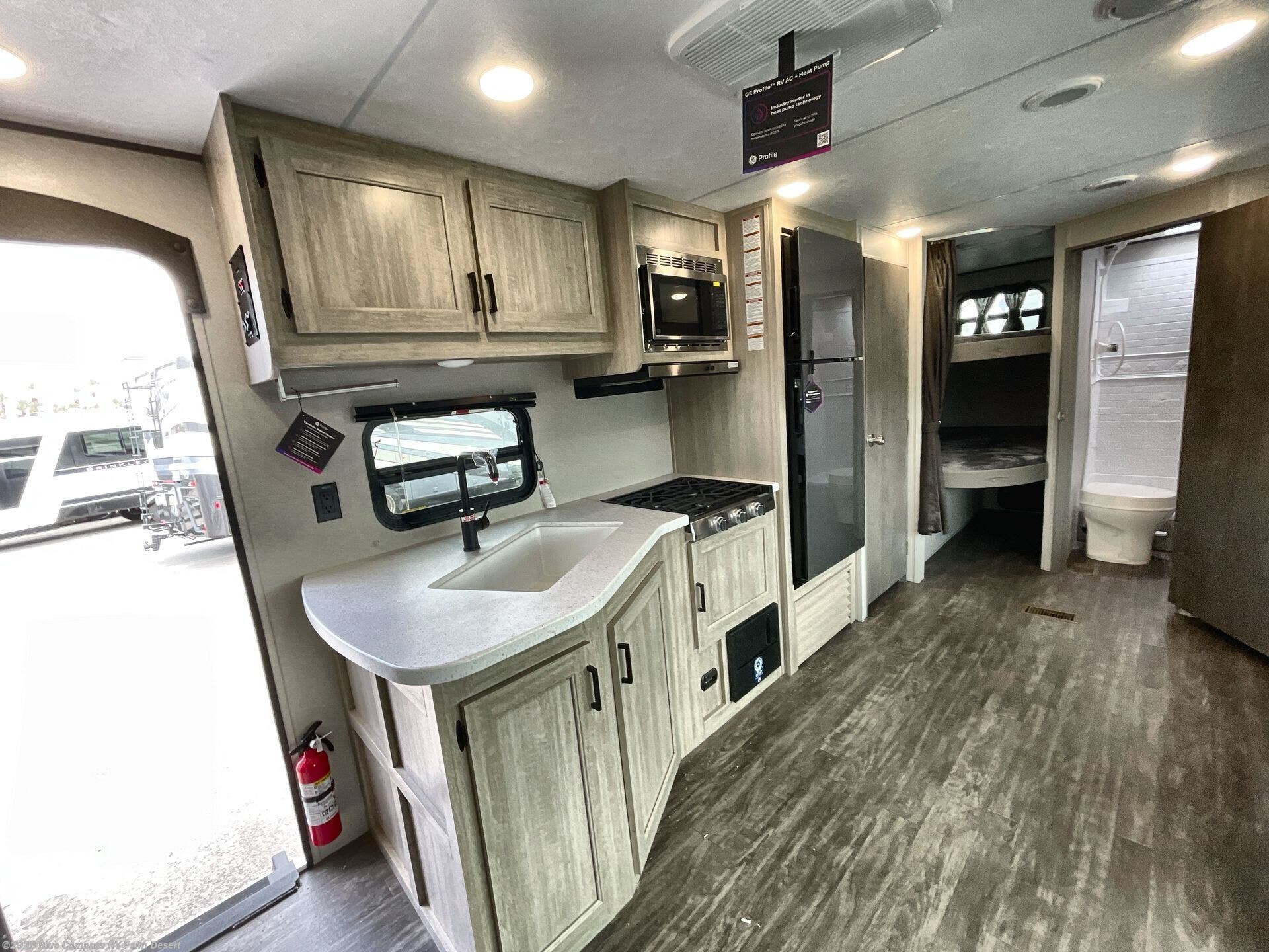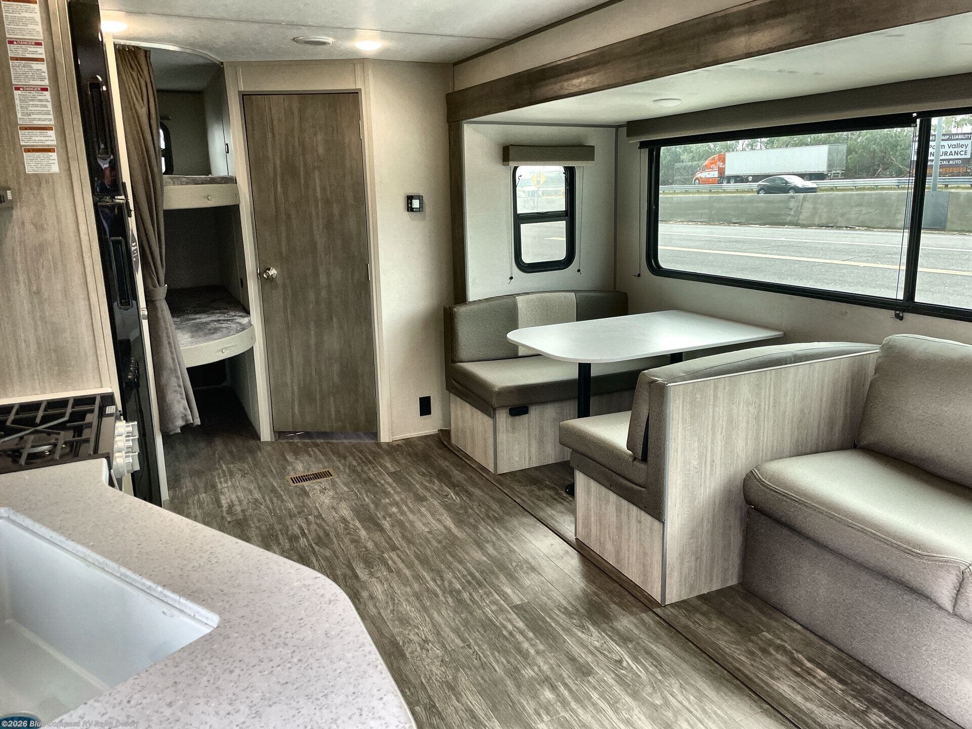 Everyone will have a comfortable time camping in this travel trailer! It features a set of double sized bunk beds for the kids or guests to sleep on and are conveniently next to the rear corner bathroom which has a tub/shower with a skylight above for added natural lighting. The booth dinette and sofa slide opens up the kitchen area so you have more space to prepare your best meals with the three burner cooktop. When you're ready to wind down your nights, grab a snack from the large pantry, a beverage from the 10.7 cu. ft. refrigerator, and place your drink in the cupholder/arm rest of the sofa while you watch a movie at the entertainment center!