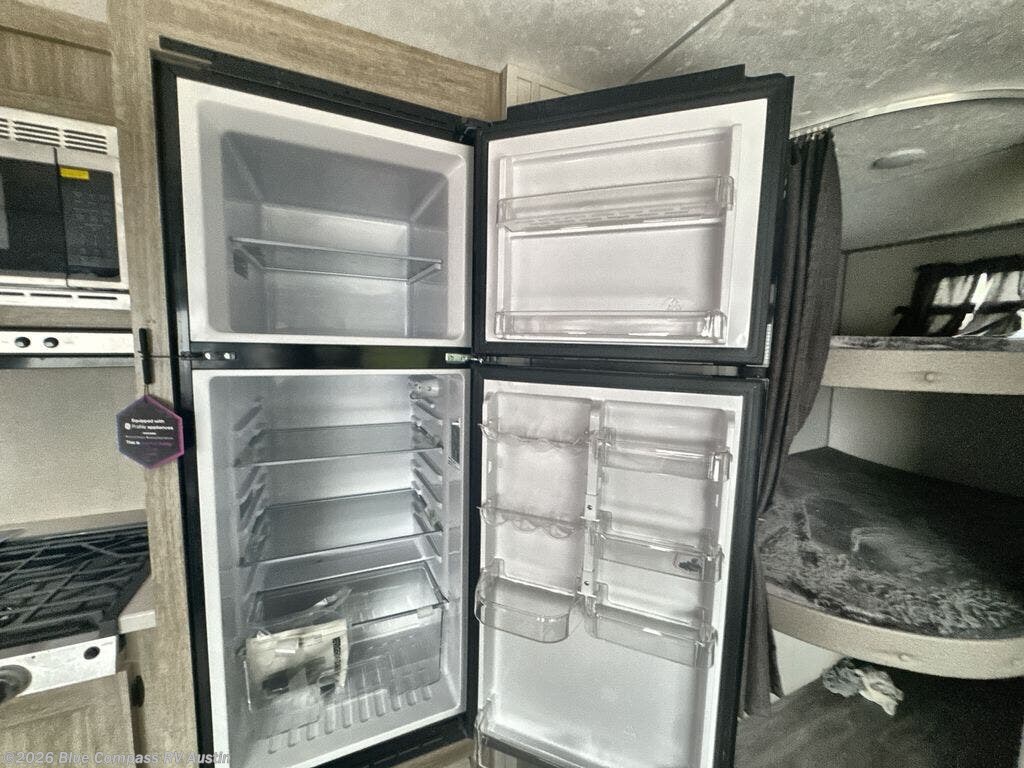Everyone will have a comfortable time camping in this travel trailer! It features a set of double sized bunk beds for the kids or guests to sleep on and are conveniently next to the rear corner bathroom which has a tub/shower with a skylight above for added natural lighting. The booth dinette and sofa slide opens up the kitchen area so you have more space to prepare your best meals with the three burner cooktop. When you're ready to wind down your nights, grab a snack from the large pantry, a beverage from the 10.7 cu. ft. refrigerator, and place your drink in the cupholder/arm rest of the sofa while you watch a movie at the entertainment center!