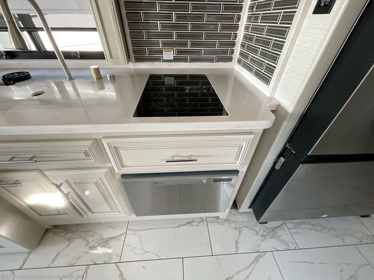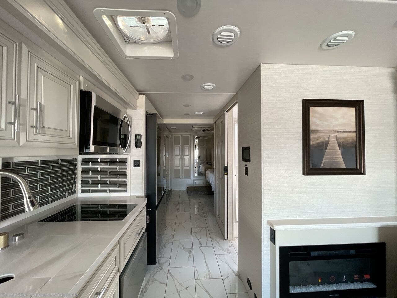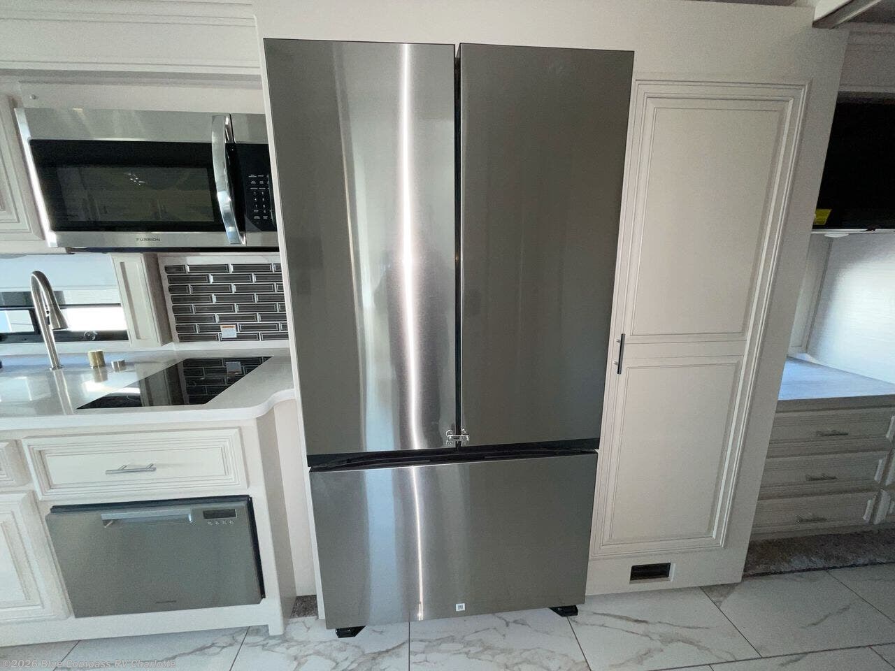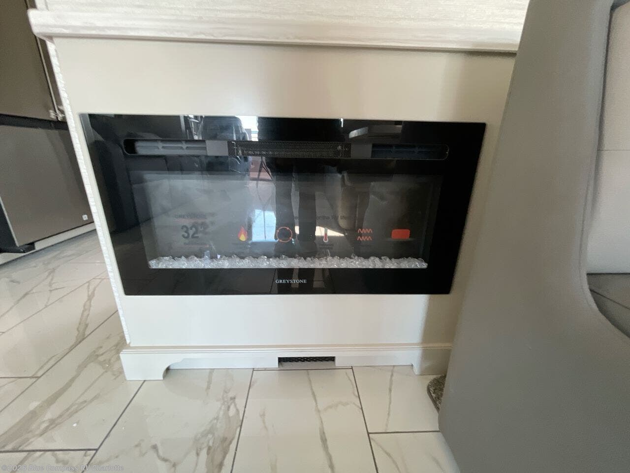 Fall in love with adventure when you travel in this triple slide out coach. Your crew can relax the sofa/bed, the hide-a-bed sofa, or the booth dinette. You will enjoy the fireplace, plus there is a 32" overhead TV, a 32" LED TV in the bedroom, and an exterior 40" LED TV. The kitchen includes everything you would find at home, including a 30" over-the-range convection microwave, a two burner electric induction cooktop, and a 23 cu. ft. French door residential refrigerator. You and your spouse will have the rear private bedroom all to yourselves with a slide out Tilt-A-View king bed, two wardrobes, and a stackable washer and dryer!