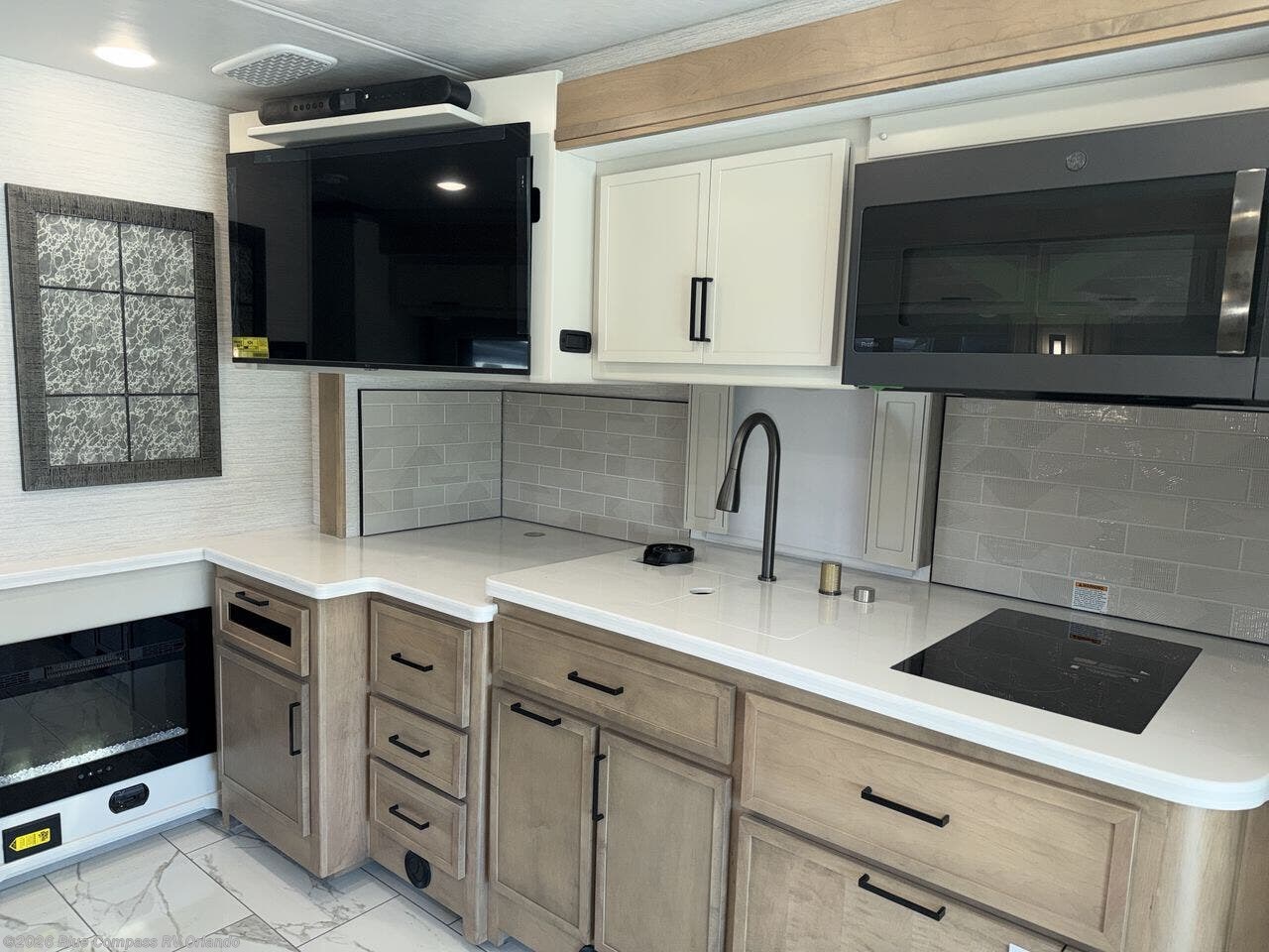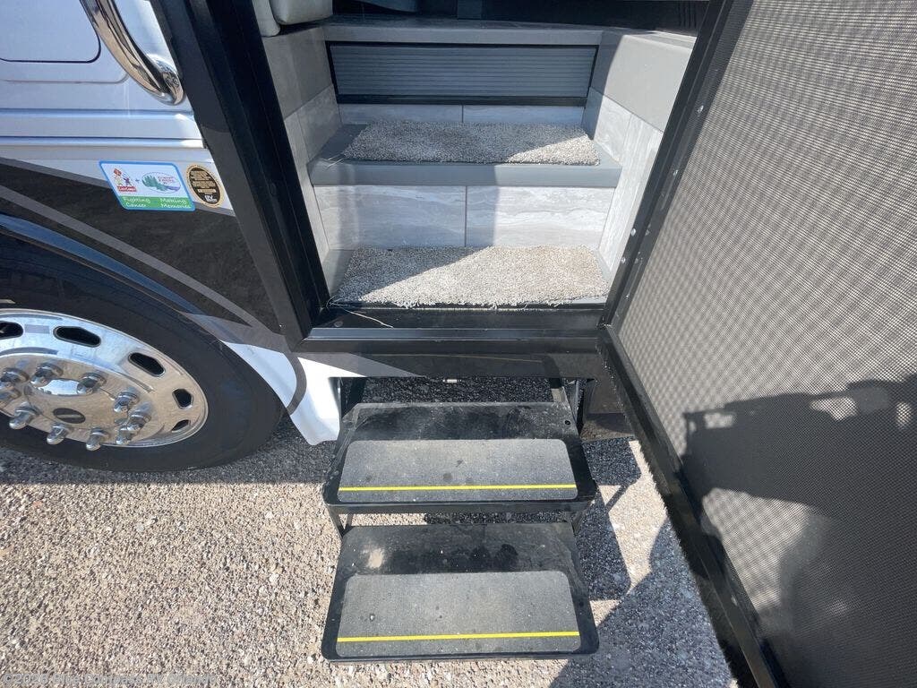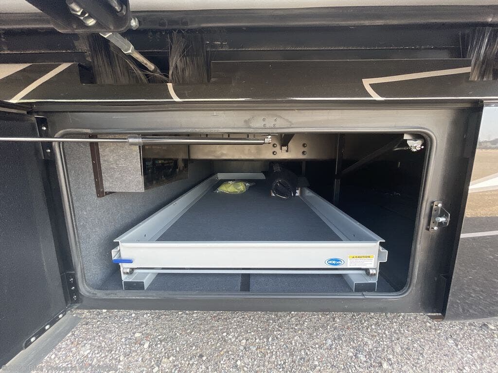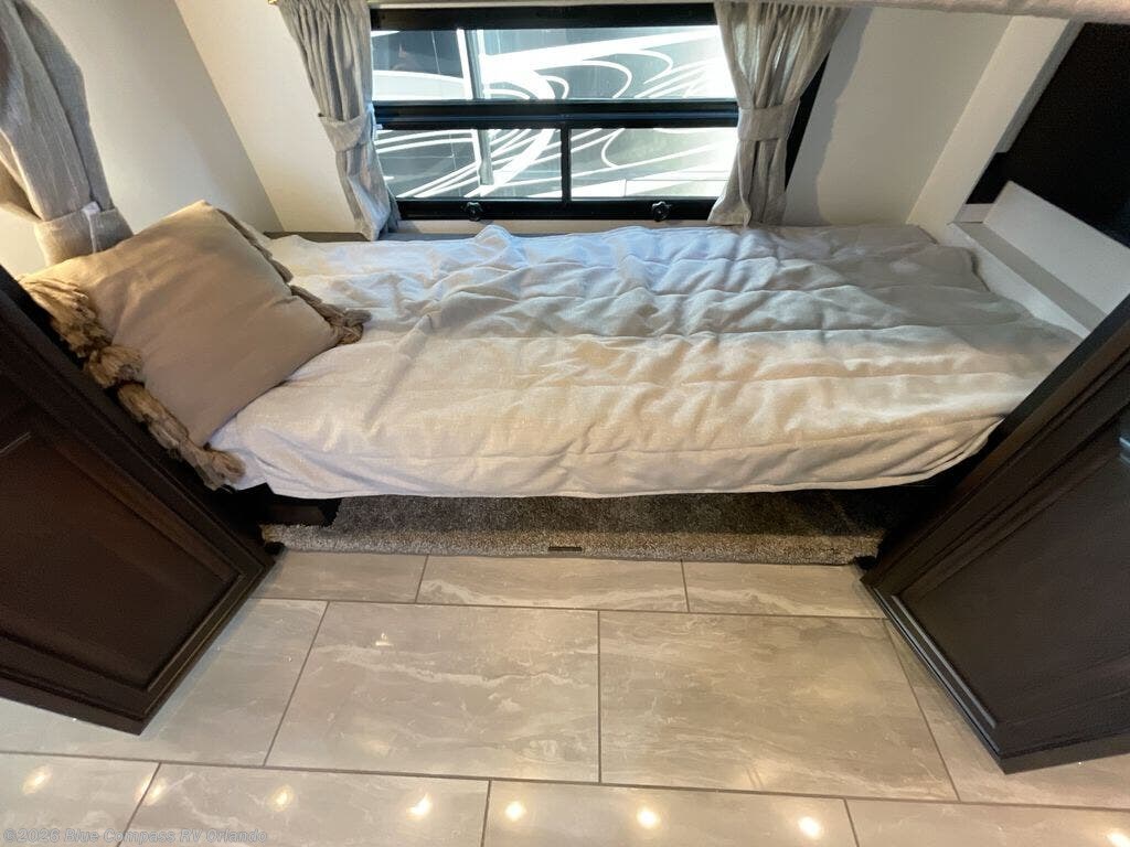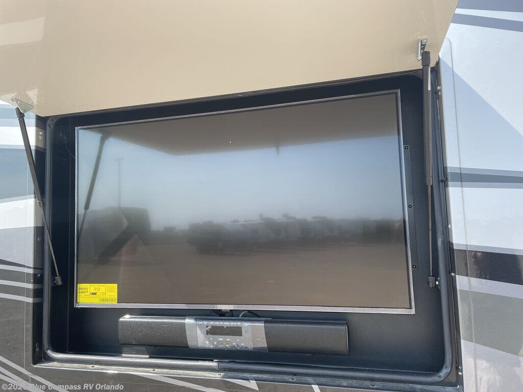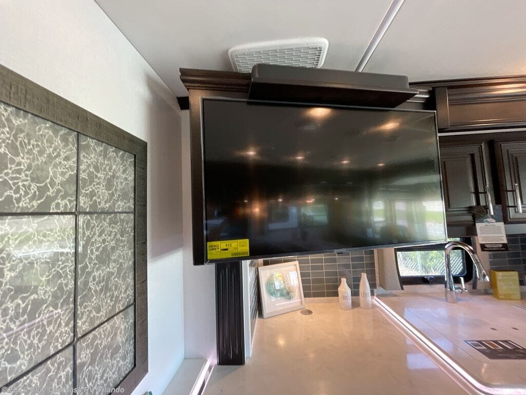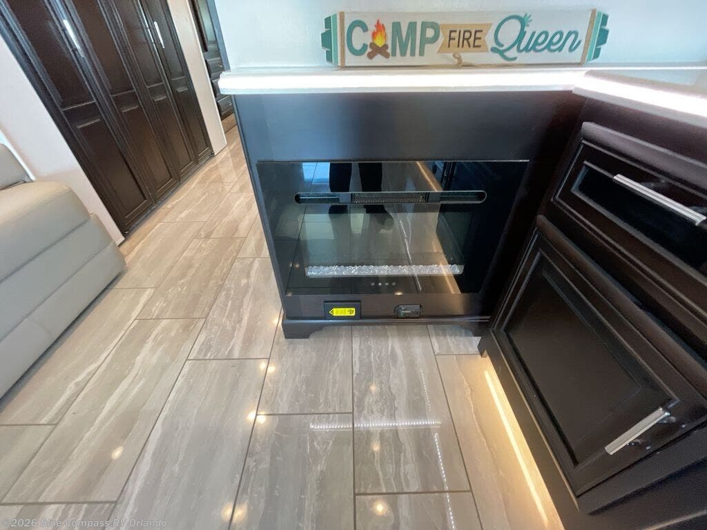 Experience a home away from home with this motorhome! The whole family will have a comfortable place to sleep between the bunk lift above the cab, the 72" x 80" king bed, the set of 30" x 73" bunk beds, the jackknife sofa, and even the booth dinette once converted. Storage space isn't lacking with overhead cabinets throughout, kitchen pantry, and bedroom wardrobe. The full rear bathroom has a shower and a washer and dryer, and the second full bathroom also has a shower so everyone can get ready two times faster. The porcelain tile flooring throughout will be easy to clean and the fireplace creates the perfect relaxing evening indoors. Watch the big game at the exterior entertainment center while staying protected by the 18' Carefree latitude awning with LED lights and wind sensor!