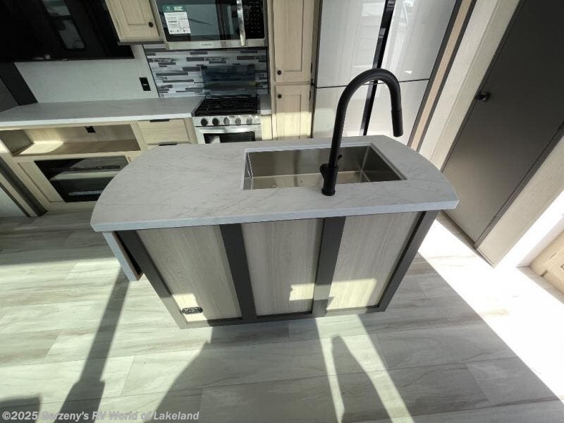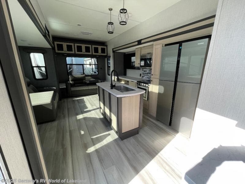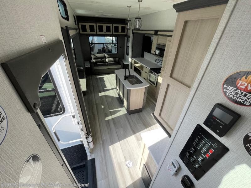 Imagine waking up every morning in a luxurious RV that feels like home. The rear living room is a cozy retreat, perfect for relaxing and unwinding after a long adventure day. With a comfortable hide-a-bed sofa, entertainment center, cozy fireplace, theater seating, and overhead cabinets, you'll have everything you need to enjoy quality time with family and friends. The kitchen is perfect for fulfilling all your cooking cravings, featuring a kitchen island with flip-up extension for added convenience when cooking, a microwave, pantry, and 12V refrigerator. There is also a hi-top table and chairs, coffee bar, and walk-in pantry. The full bathroom comes with a linen closet and all the amenities you need to freshen up and feel at home. And with a spacious shower and plenty of storage, you'll have everything you need to start your day off right. The front bedroom is the perfect space to recharge energy, featuring a comfortable king bed, dresser, walk-in wardrobe, and washer and dryer prep for all your laundry needs. Outside, you'll appreciate the pass-through storage for all your gear and toys, as well as the 15' and 11' awnings for shade and protection.