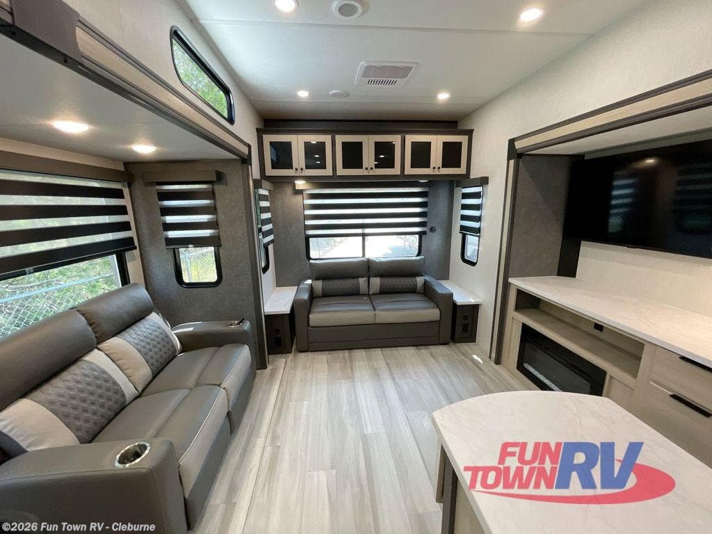 Imagine waking up every morning in a luxurious RV that feels like home. The rear living room is a cozy retreat, perfect for relaxing and unwinding after a long adventure day. With a comfortable hide-a-bed sofa, entertainment center, cozy fireplace, theater seating, and overhead cabinets, you'll have everything you need to enjoy quality time with family and friends. The kitchen is perfect for fulfilling all your cooking cravings, featuring a kitchen island with flip-up extension for added convenience when cooking, a microwave, pantry, and 12V refrigerator. There is also a hi-top table and chairs, coffee bar, and walk-in pantry. The full bathroom comes with a linen closet and all the amenities you need to freshen up and feel at home. And with a spacious shower and plenty of storage, you'll have everything you need to start your day off right. The front bedroom is the perfect space to recharge energy, featuring a comfortable king bed, dresser, walk-in wardrobe, and washer and dryer prep for all your laundry needs. Outside, you'll appreciate the pass-through storage for all your gear and toys, as well as the 15' and 11' awnings for shade and protection.