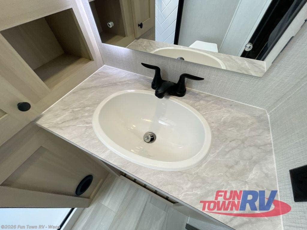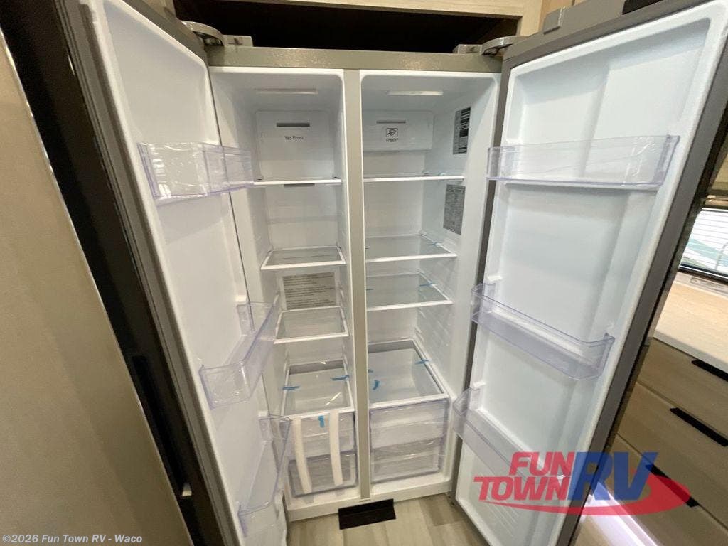 Cook like a chef worthy of a Michelin star in this amazing fifth wheel! Inside, you'll find a spacious rear kitchen, complete with a pantry, a 12V refrigerator ideal for keeping your fruits and vegetables fresh, overhead cabinets, and a sprawling countertop for all your cooking and dining times. The high-top table and chairs provide the perfect place to enjoy meals with family and friends. The living room is a cozy place featuring comfortable theater seating, a tri-fold sofa, a cozy fireplace, an entertainment center, and a convenient desk for staying productive on the go. The full bathroom is also a great place to freshen up, complete with a linen closet and all the amenities you need to take a bath and feel at home. With a spacious shower and plenty of storage, you'll have everything you need to start your day off right. The perfect place to rest and recharge after a long day of adventure is the front bedroom which boasts a comfortable king bed, dresser, walk-in wardrobe with washer and dryer prep, for keeping all your favorite belongings clean and organized on the road. Outside, you'll appreciate the pass-through storage for all your gear and toys, as well as the two awnings (15' and 11') ideal for creating unforgettable memories outside without worrying about the weather.