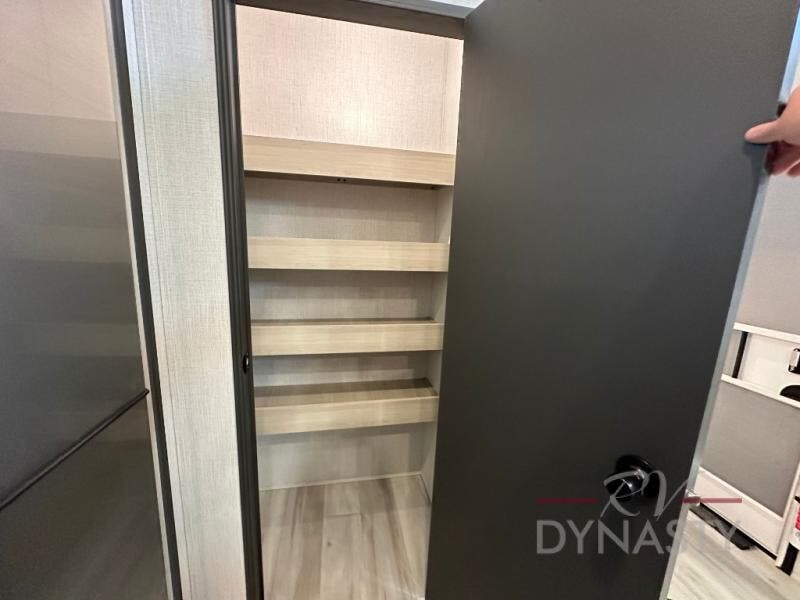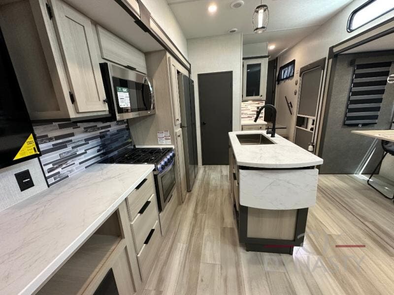 It will be so easy to enjoy extended stays in this spacious fifth wheel! Your guests are sure to love the rear private bunkhouse that includes a 54" x 74" bed below a bunk bed and a loft. This room even features its own full bath for added convenience. The second full bath is up front towards the private bedroom, which the owners can claim as their own. There is a king bed slide out here, along with a walk-in closet with a wardrobe plus washer and dryer prep. Everyone can meet in the middle kitchen and living area as the chef of your group prepares breakfast on the 21" 2-in-1 oven range! There are also two pantries and a 16 cu. ft. 12V refrigerator to store food, plus a coffee bar where you can set up a drink station. After a day of exploring outdoors, you can relax on the theater seating, which is in direct view of the fireplace and entertainment center!