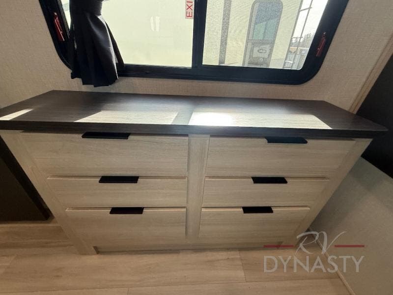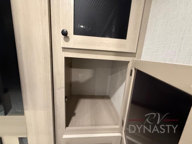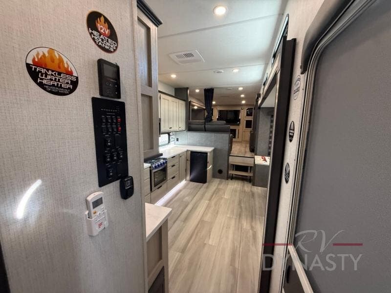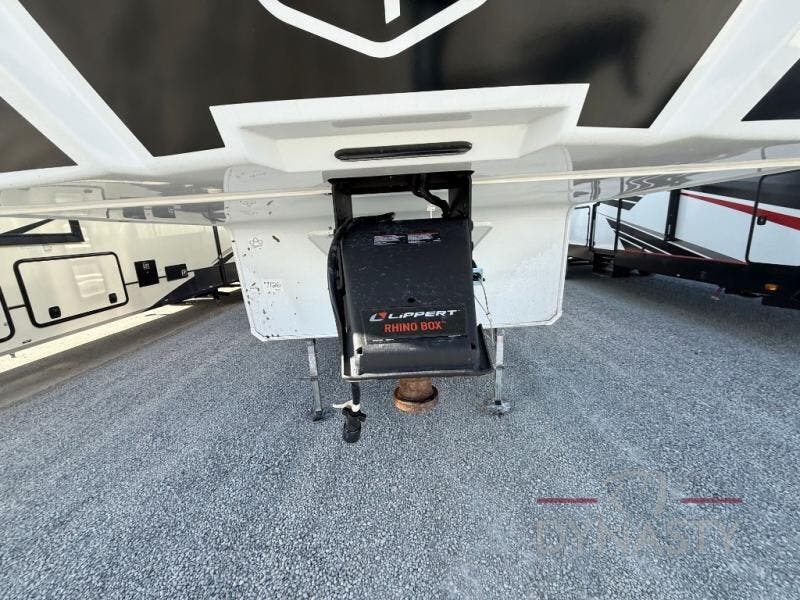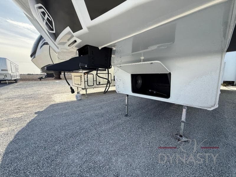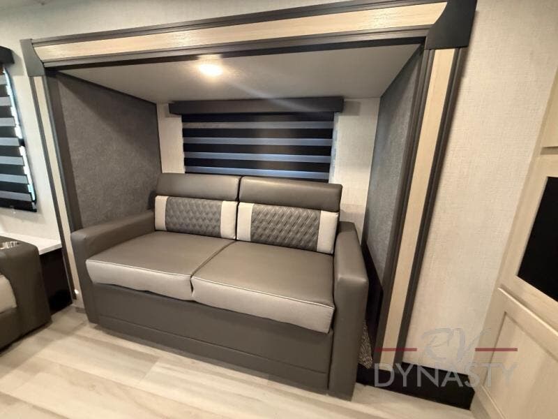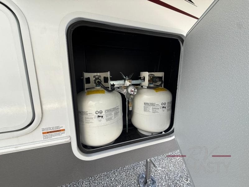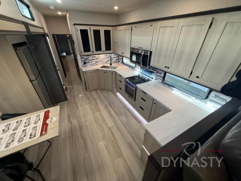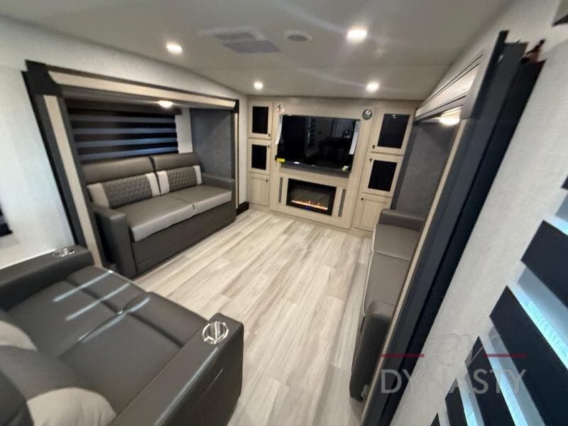 This fifth wheel is packed with features to make each trip enjoyable! The middle kitchen might be your favorite room with wrap-around counter space, a pantry, and a 16 cu. ft. 12V refrigerator for food storage. You can dine at the hi-top table and chairs here, or sit in the front living area on the dual sofas and theater seating! This area can become your guests bedroom at night since there are dual opposing slides and wardrobe storage for their things. You will also find a full-length wardrobe in the rear private bedroom, along with a king bed slide out, plus washer and dryer prep! And of course there is a full bath so everyone can stay clean each day!