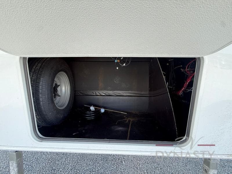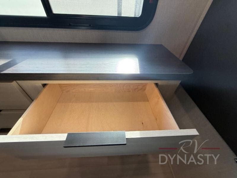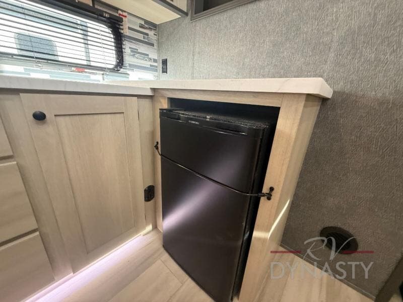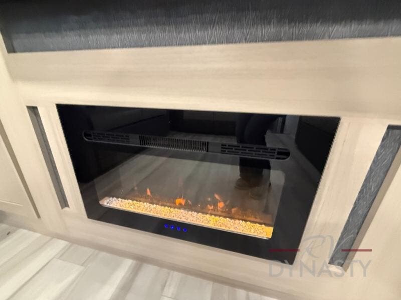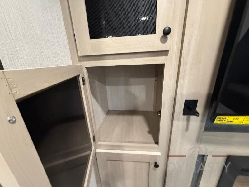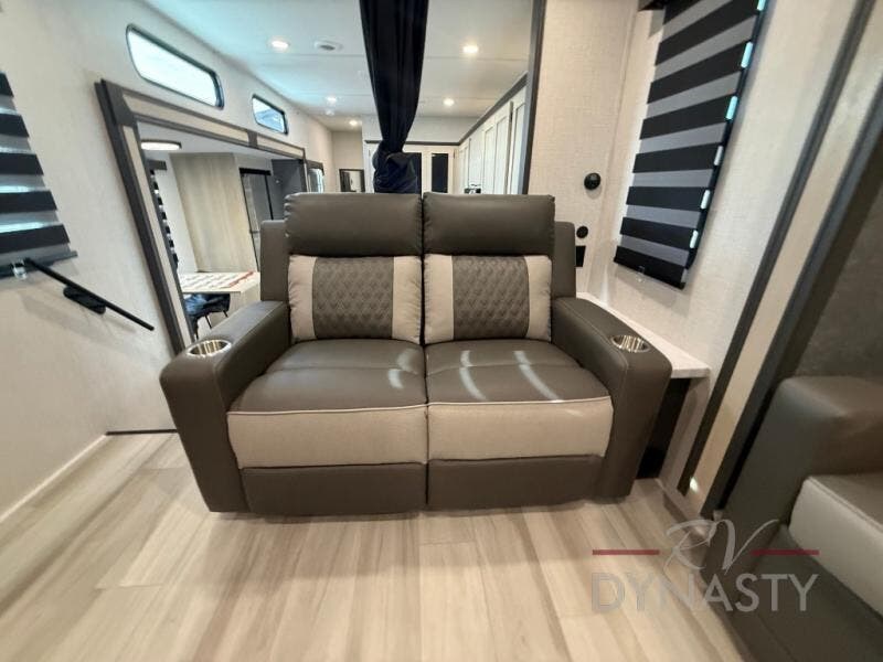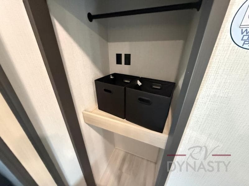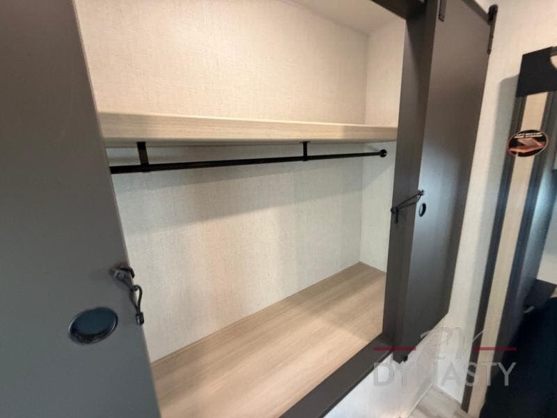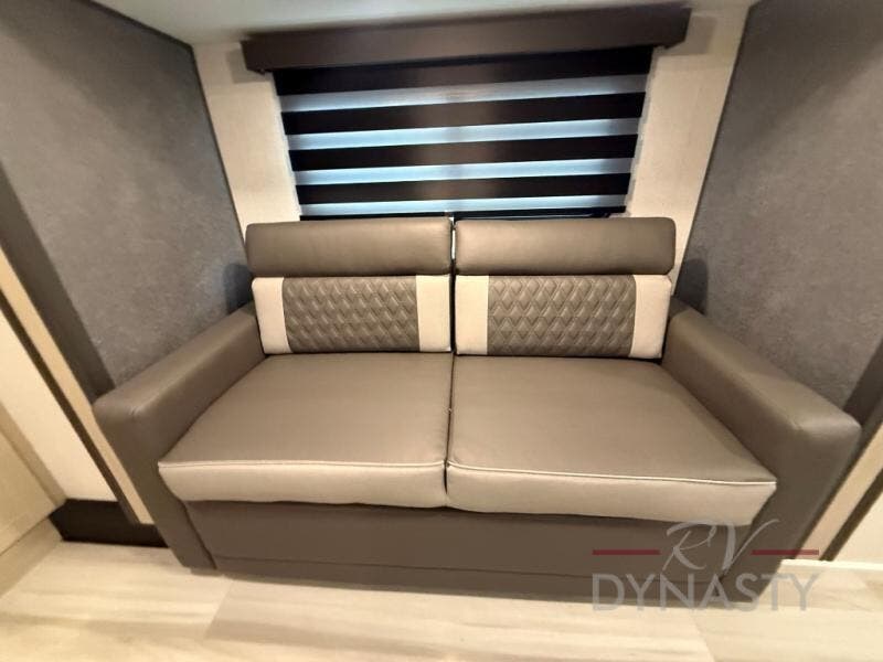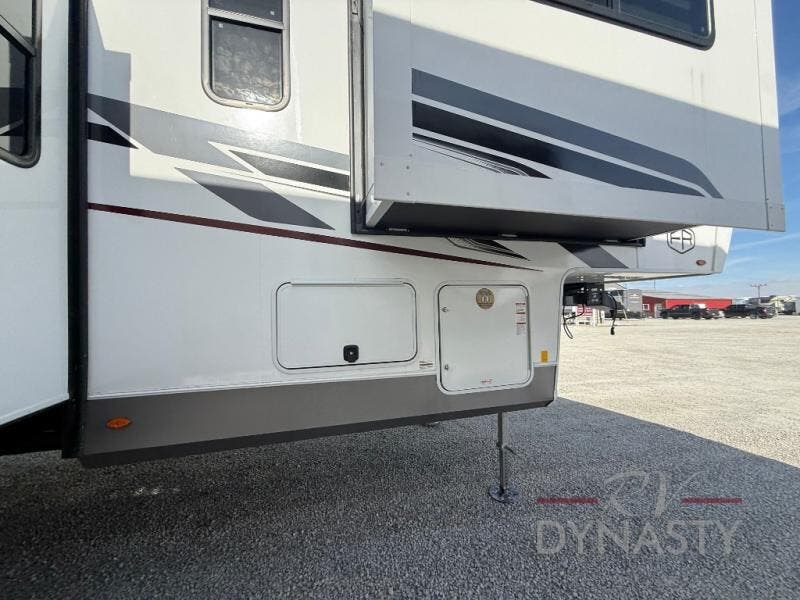 This fifth wheel is packed with features to make each trip enjoyable! The middle kitchen might be your favorite room with wrap-around counter space, a pantry, and a 16 cu. ft. 12V refrigerator for food storage. You can dine at the hi-top table and chairs here, or sit in the front living area on the dual sofas and theater seating! This area can become your guests bedroom at night since there are dual opposing slides and wardrobe storage for their things. You will also find a full-length wardrobe in the rear private bedroom, along with a king bed slide out, plus washer and dryer prep! And of course there is a full bath so everyone can stay clean each day!