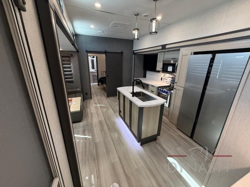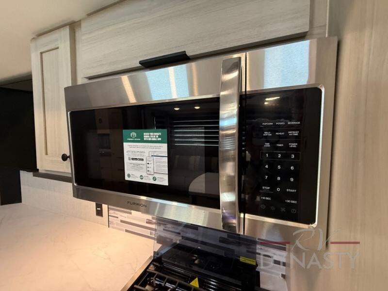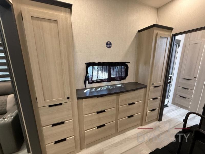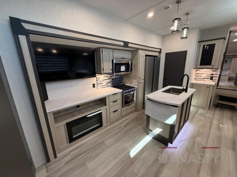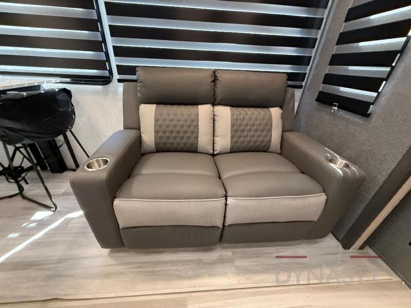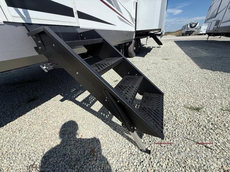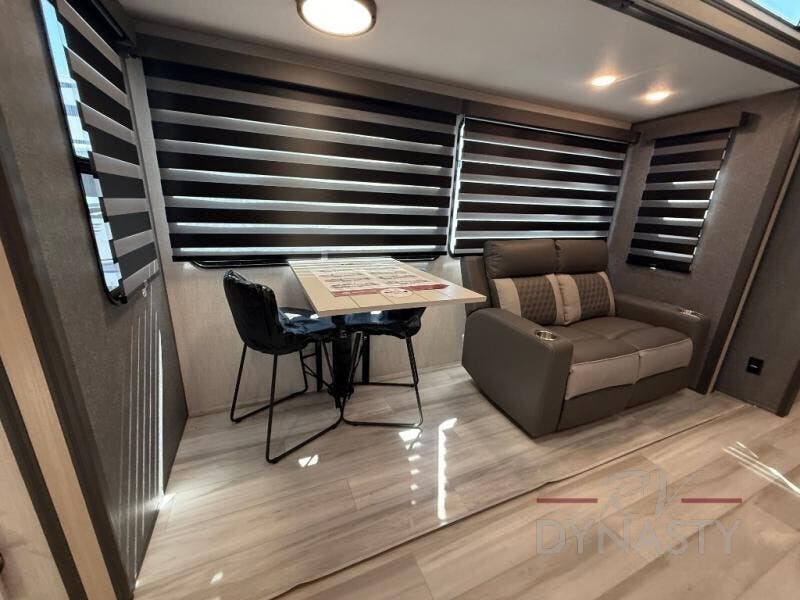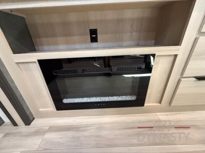 If you're ready for fun, look for further than this dual entry Cardinal fifth wheel! It will be so easy to travel with friends and family since there is a master bedroom with a king bed and a full rear bath, plus a front bunkhouse suite with bunk beds, a queen bed, and a second full bath! The chef of your crew can whip up breakfast in the morning on the 21" 2-in-1 oven range or in the over-the-range microwave. There is also a 16 cu. ft. 12V refrigerator and walk-in pantry for food storage! The theater seating and table with chairs sit across from the entertainment center and fireplace for easy viewing in the evening, or you may just find yourselves outdoors visiting with campground neighbors!
