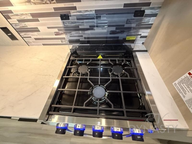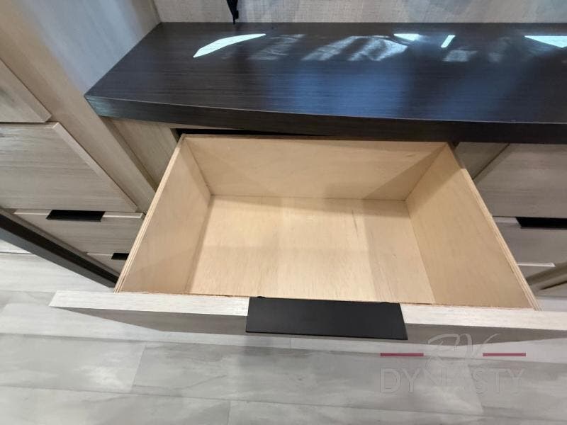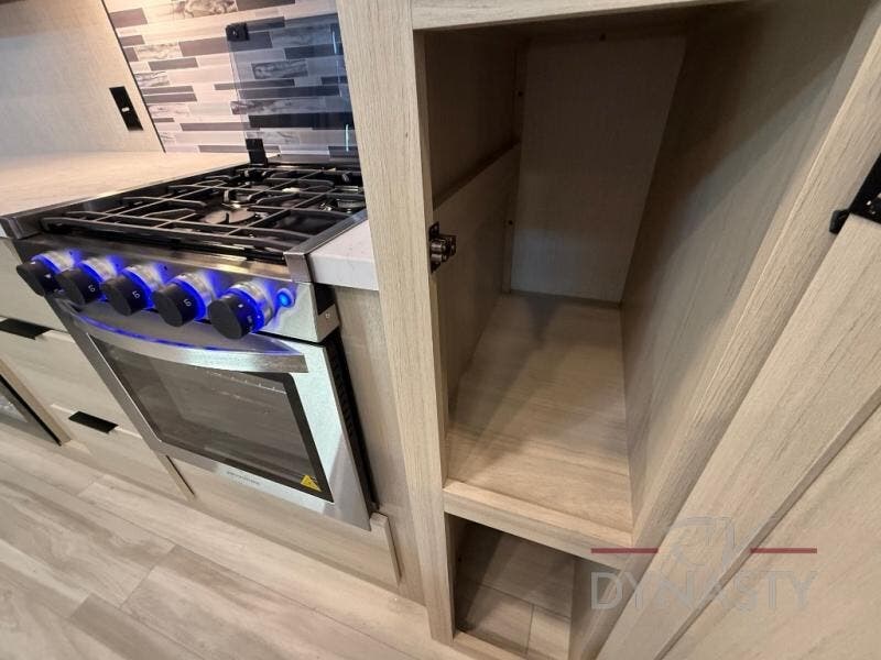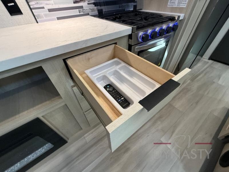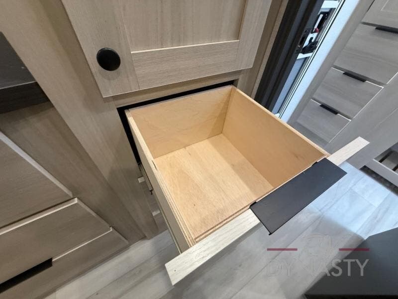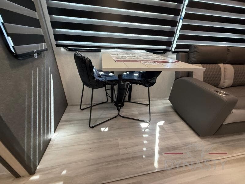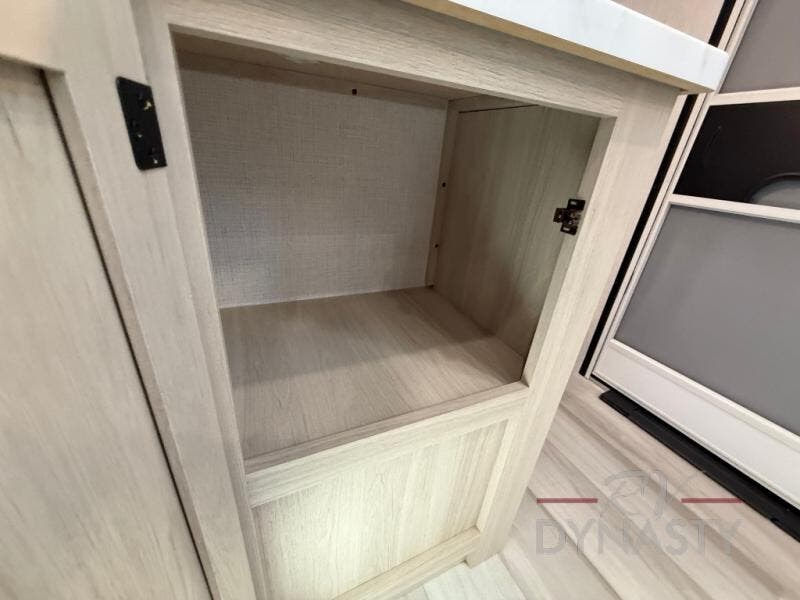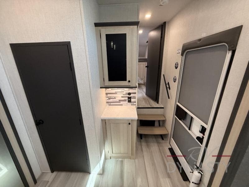 If you're ready for fun, look for further than this dual entry Cardinal fifth wheel! It will be so easy to travel with friends and family since there is a master bedroom with a king bed and a full rear bath, plus a front bunkhouse suite with bunk beds, a queen bed, and a second full bath! The chef of your crew can whip up breakfast in the morning on the 21" 2-in-1 oven range or in the over-the-range microwave. There is also a 16 cu. ft. 12V refrigerator and walk-in pantry for food storage! The theater seating and table with chairs sit across from the entertainment center and fireplace for easy viewing in the evening, or you may just find yourselves outdoors visiting with campground neighbors!