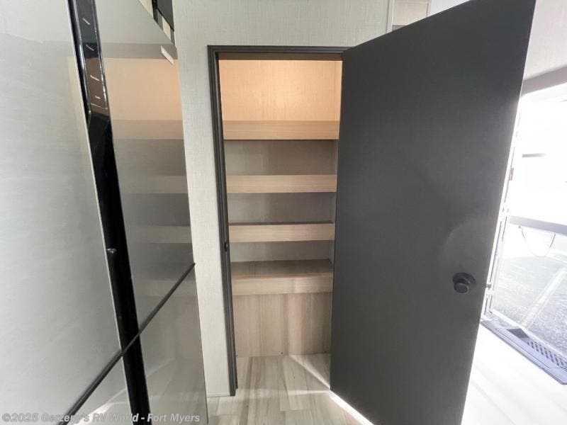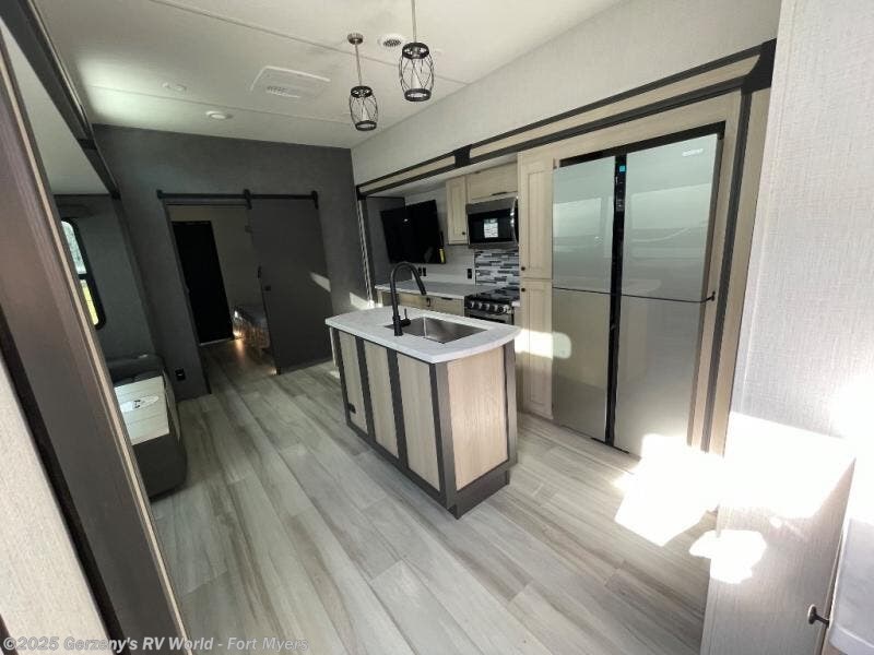 If you're ready for fun, look for further than this dual entry Cardinal fifth wheel! It will be so easy to travel with friends and family since there is a master bedroom with a king bed and a full rear bath, plus a front bunkhouse suite with bunk beds, a queen bed, and a second full bath! The chef of your crew can whip up breakfast in the morning on the 21" 2-in-1 oven range or in the over-the-range microwave. There is also a 16 cu. ft. 12V refrigerator and walk-in pantry for food storage! The theater seating and table with chairs sit across from the entertainment center and fireplace for easy viewing in the evening, or you may just find yourselves outdoors visiting with campground neighbors!
