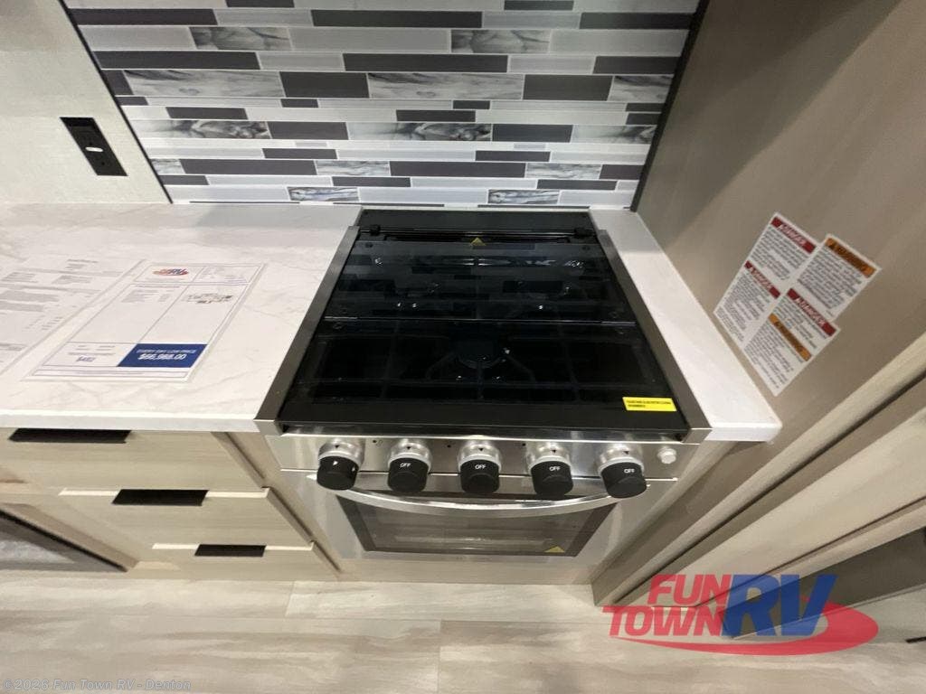 If you're ready for fun, look for further than this dual entry Cardinal fifth wheel! It will be so easy to travel with friends and family since there is a master bedroom with a king bed and a full rear bath, plus a front bunkhouse suite with bunk beds, a queen bed, and a second full bath! The chef of your crew can whip up breakfast in the morning on the 21" 2-in-1 oven range or in the over-the-range microwave. There is also a 16 cu. ft. 12V refrigerator and walk-in pantry for food storage! The theater seating and table with chairs sit across from the entertainment center and fireplace for easy viewing in the evening, or you may just find yourselves outdoors visiting with campground neighbors!