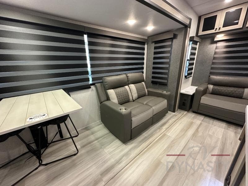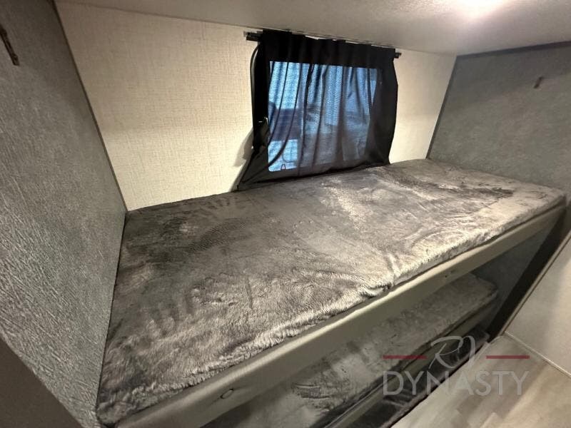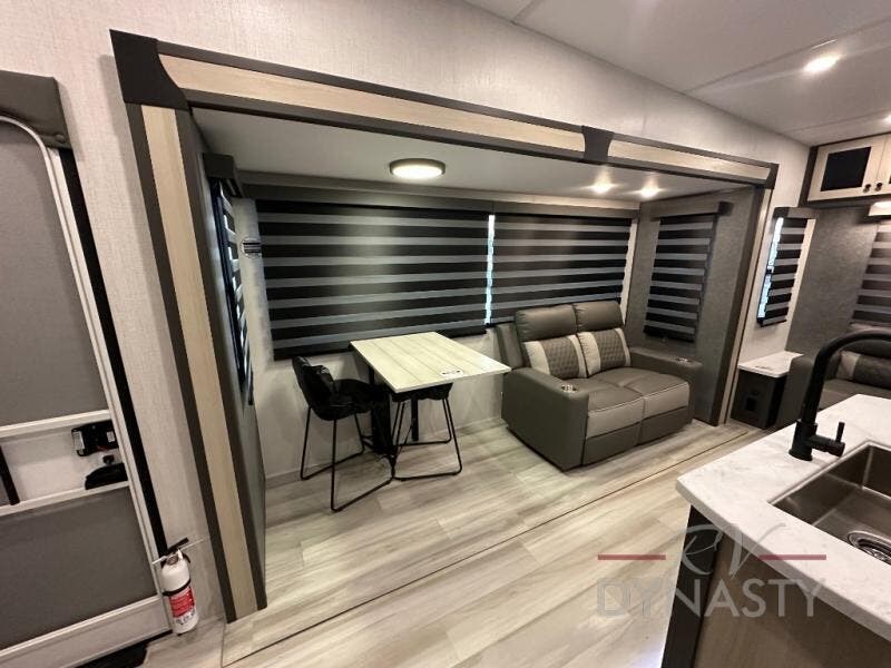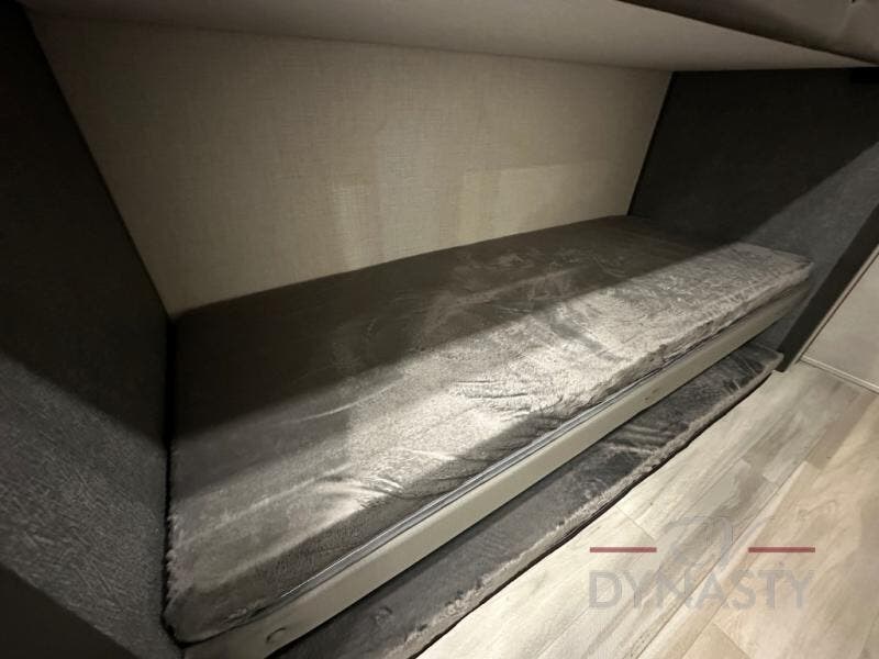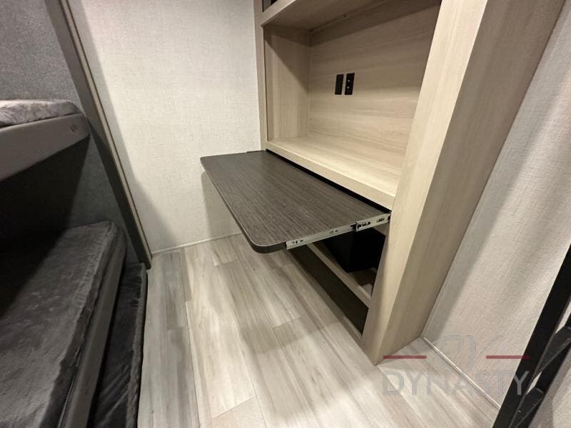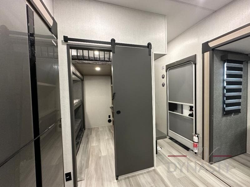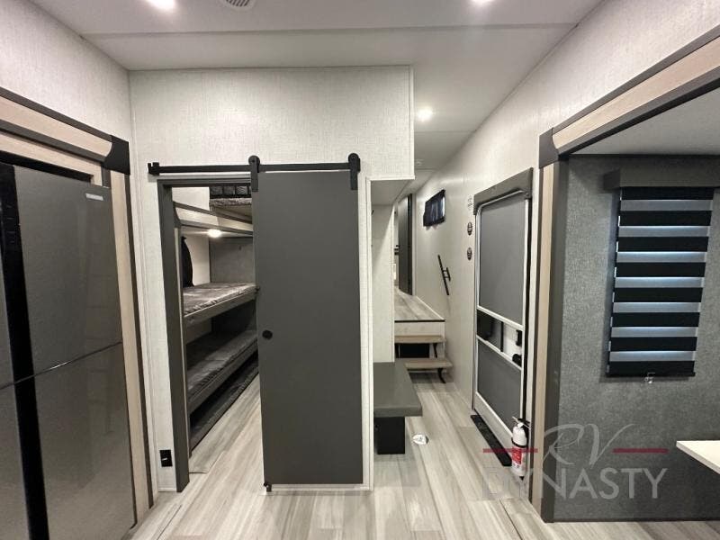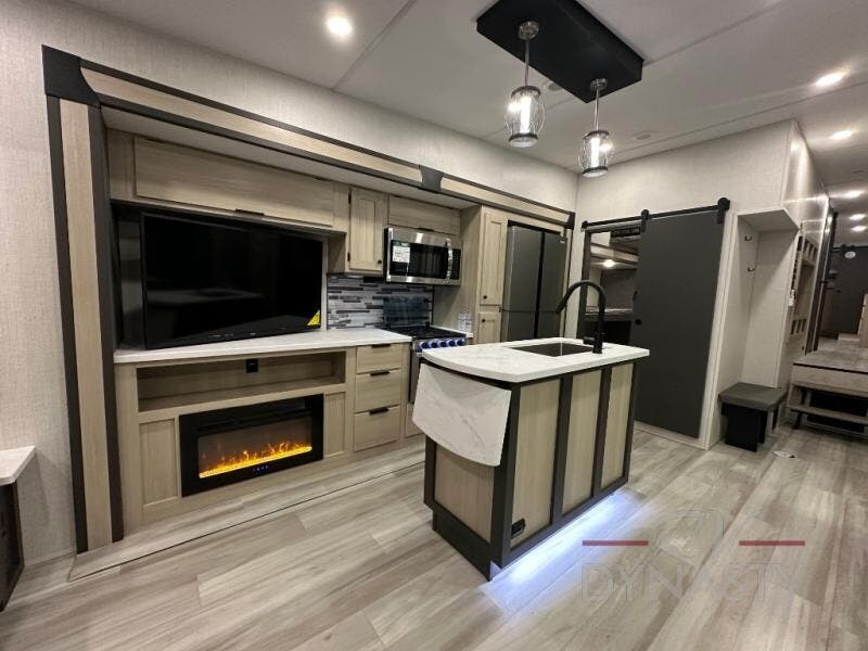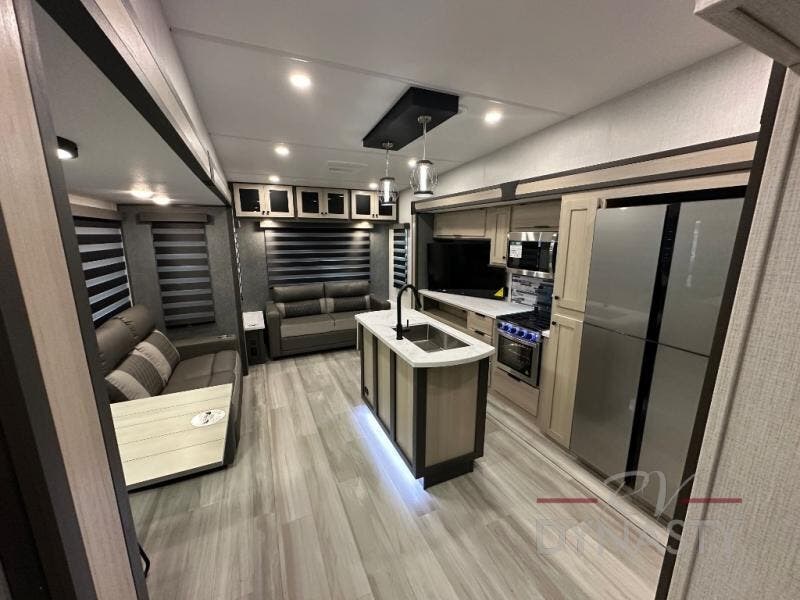 Wow! You won't believe the features found in this luxury fifth wheel that can sleep up to nine each night! Your guests or the kids will absolutely love the middle bunkroom with triple bunks and a loft above for even more sleeping or storage space. There is also a pull-out desk here, which will allow you to utilize this space as an office as well! You'll have your own space in the front private bedroom on the king bed slide out, and there is a walk-in wardrobe to keep your clothes tidy. There is even washer and dryer prep for the option to keep those clothes clean! The chef of your group will have everything they need to prepare meals, including a 21" 2-in-1 oven range, an over-the-range microwave, a 16 cu. ft. 12V refrigerator, plus a kitchen island for more counter space. In the evenings, your crew can get cozy on the rear sofa and theater seats across from the entertainment center and fireplace, or you might just play a game at the hi-top table and chairs!