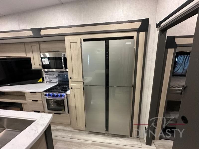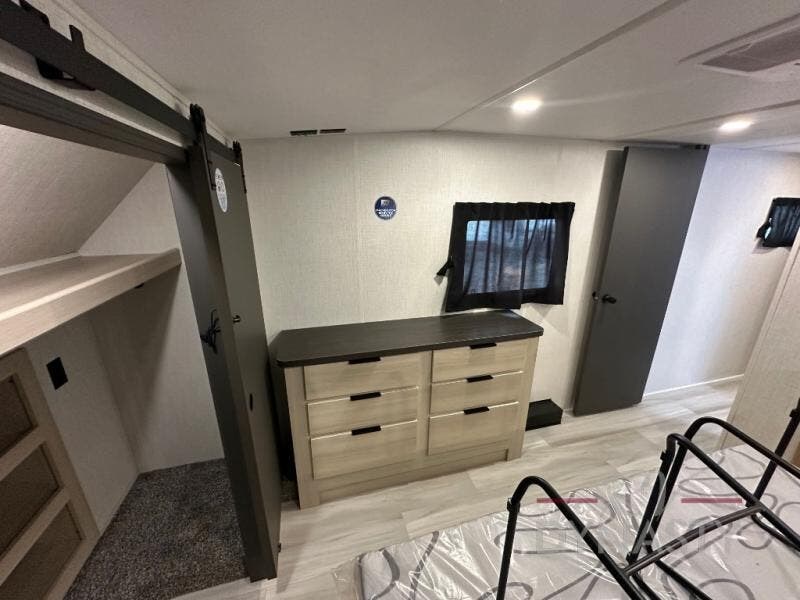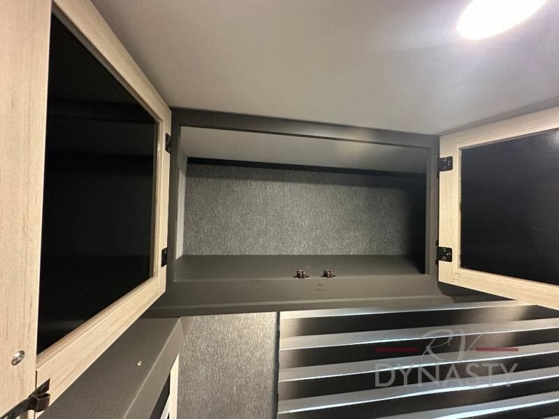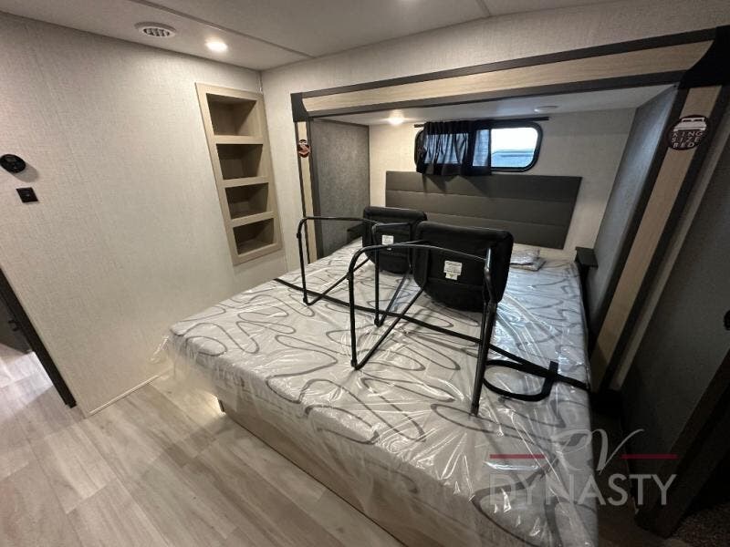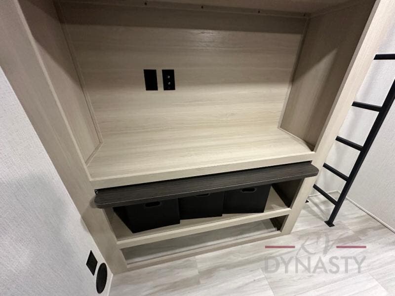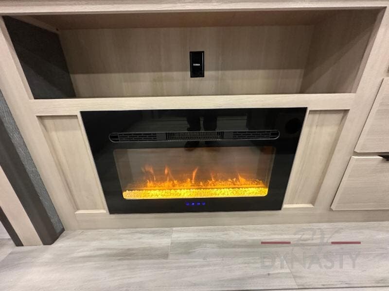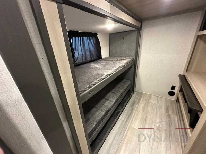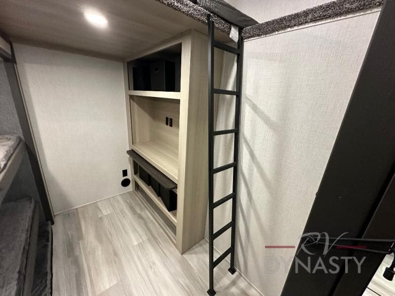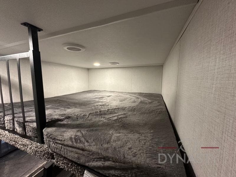 Wow! You won't believe the features found in this luxury fifth wheel that can sleep up to nine each night! Your guests or the kids will absolutely love the middle bunkroom with triple bunks and a loft above for even more sleeping or storage space. There is also a pull-out desk here, which will allow you to utilize this space as an office as well! You'll have your own space in the front private bedroom on the king bed slide out, and there is a walk-in wardrobe to keep your clothes tidy. There is even washer and dryer prep for the option to keep those clothes clean! The chef of your group will have everything they need to prepare meals, including a 21" 2-in-1 oven range, an over-the-range microwave, a 16 cu. ft. 12V refrigerator, plus a kitchen island for more counter space. In the evenings, your crew can get cozy on the rear sofa and theater seats across from the entertainment center and fireplace, or you might just play a game at the hi-top table and chairs!